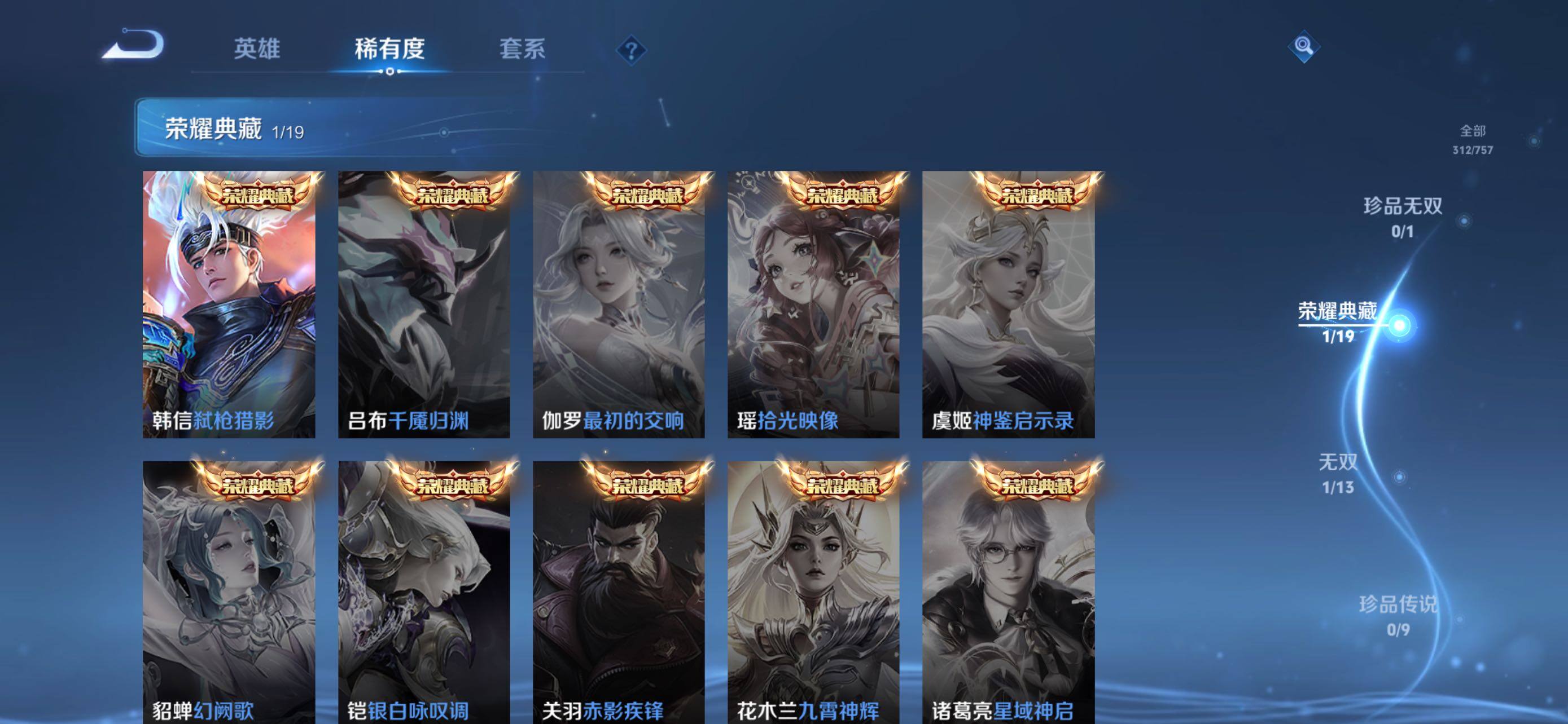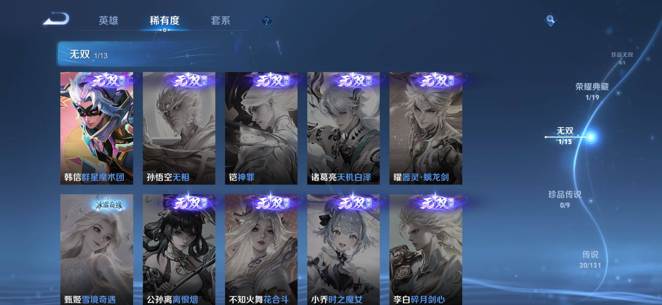 裴擒虎李小龙,上官婉儿梁祝,典韦岱宗,韩信飞衡,孙膑天狼运算者,韩信逐梦之影,后羿如梦令,孙悟空至尊宝,韩信傲雪梅枪,女娲补天,墨子降魔,马可波罗山海·玄木吟,桑启鸣野蒿,女娲愿照·千秋盛