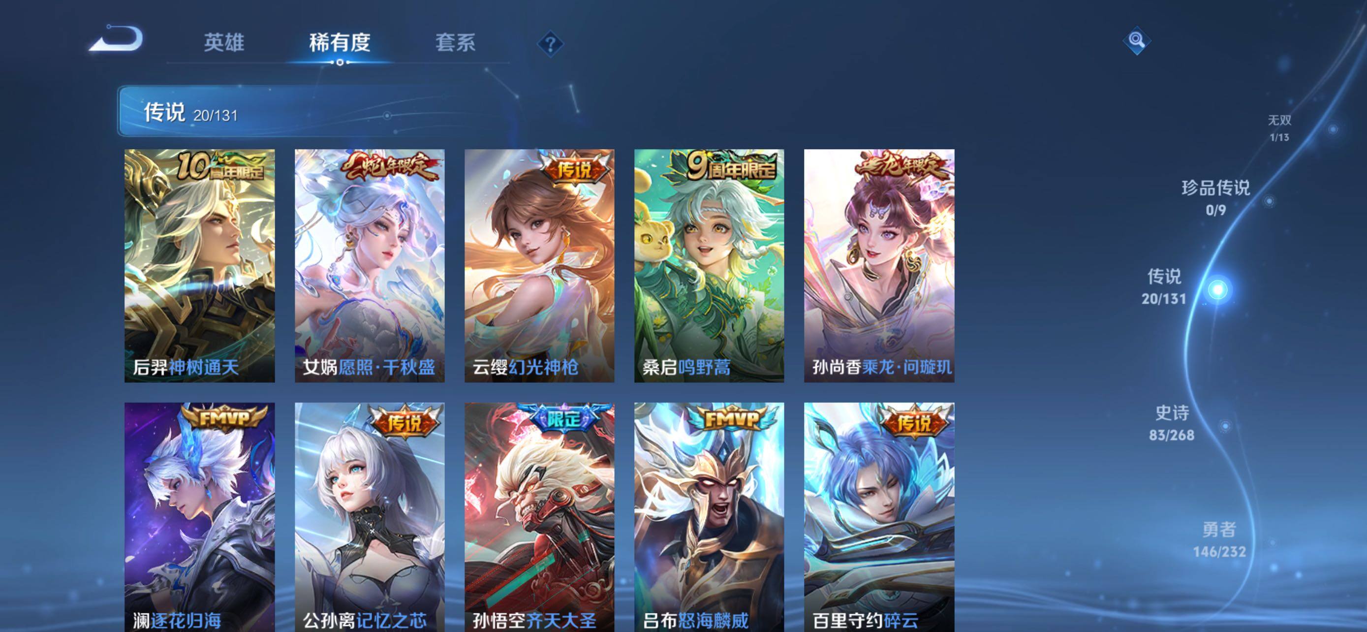 【传说皮肤】:后羿神树通天,女娲愿照千秋盛,云缨幻光神枪,桑启鸣野蒿,孙尚香乘龙问璇玑,澜逐花归海,公孙离记忆之芯,孙悟空齐天大圣,吕布怒海麟威,百里守约碎云,孙尚香音你闪耀,马超无双飞将,女娲补天,王昭君乞巧织情,李元芳飞鸢探春,虞姬启明星使,干将莫邪久胜战神,孙尚香末日机甲,宫本武藏地狱之眼,狄仁杰超时空战士