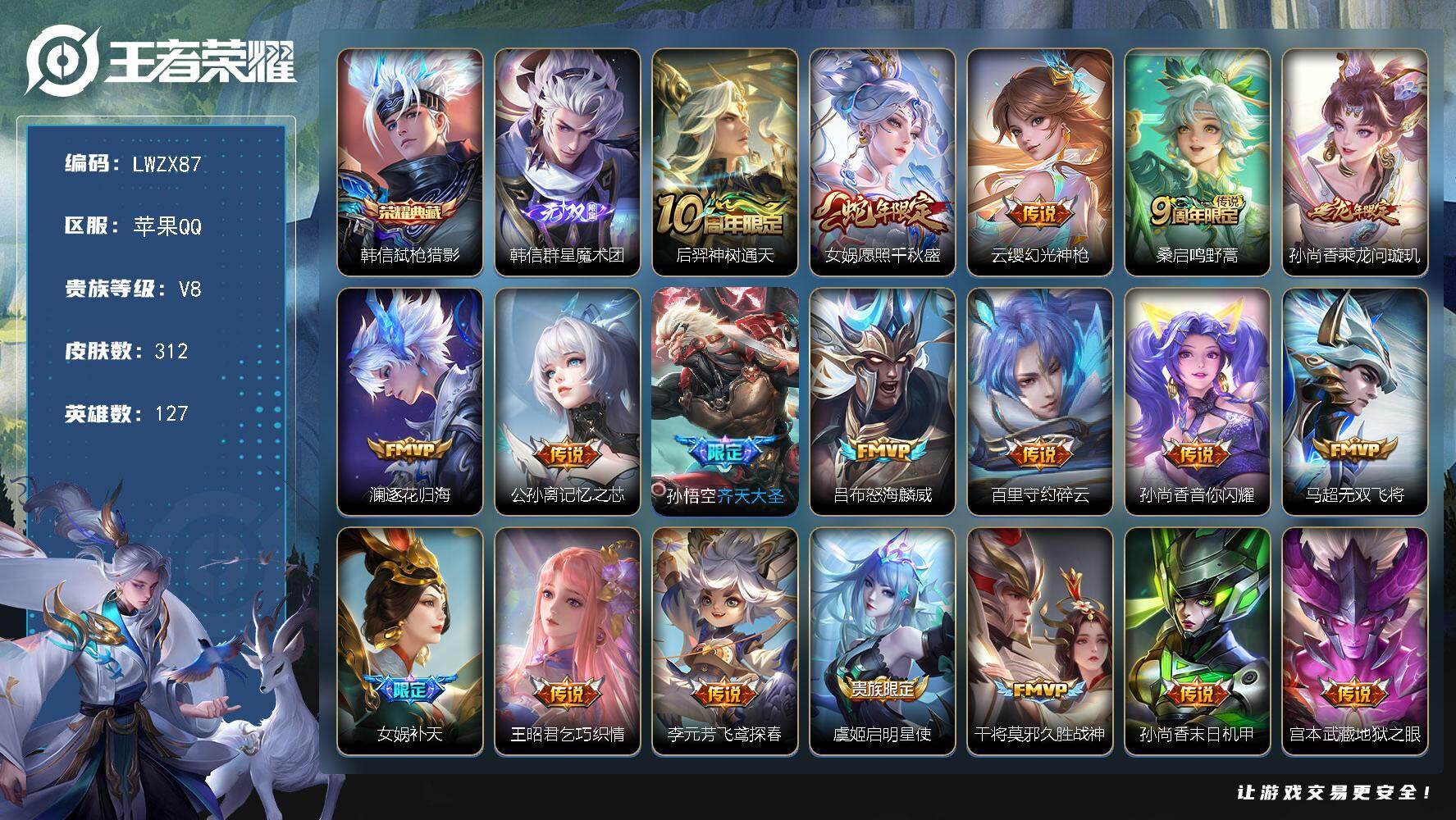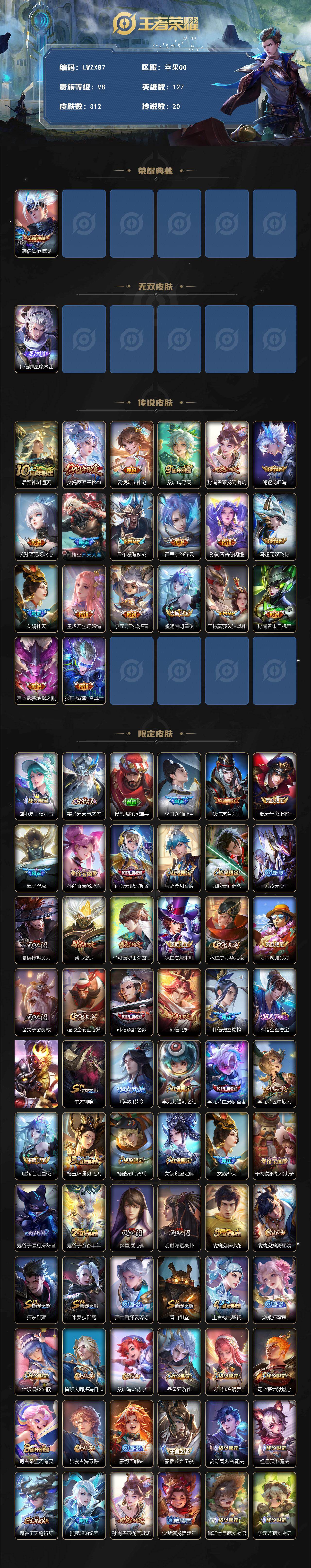 [15580330]苹果Q-V8-最强王者段位-127英雄-312皮肤-1典藏皮肤-1无双-20传说-83史诗