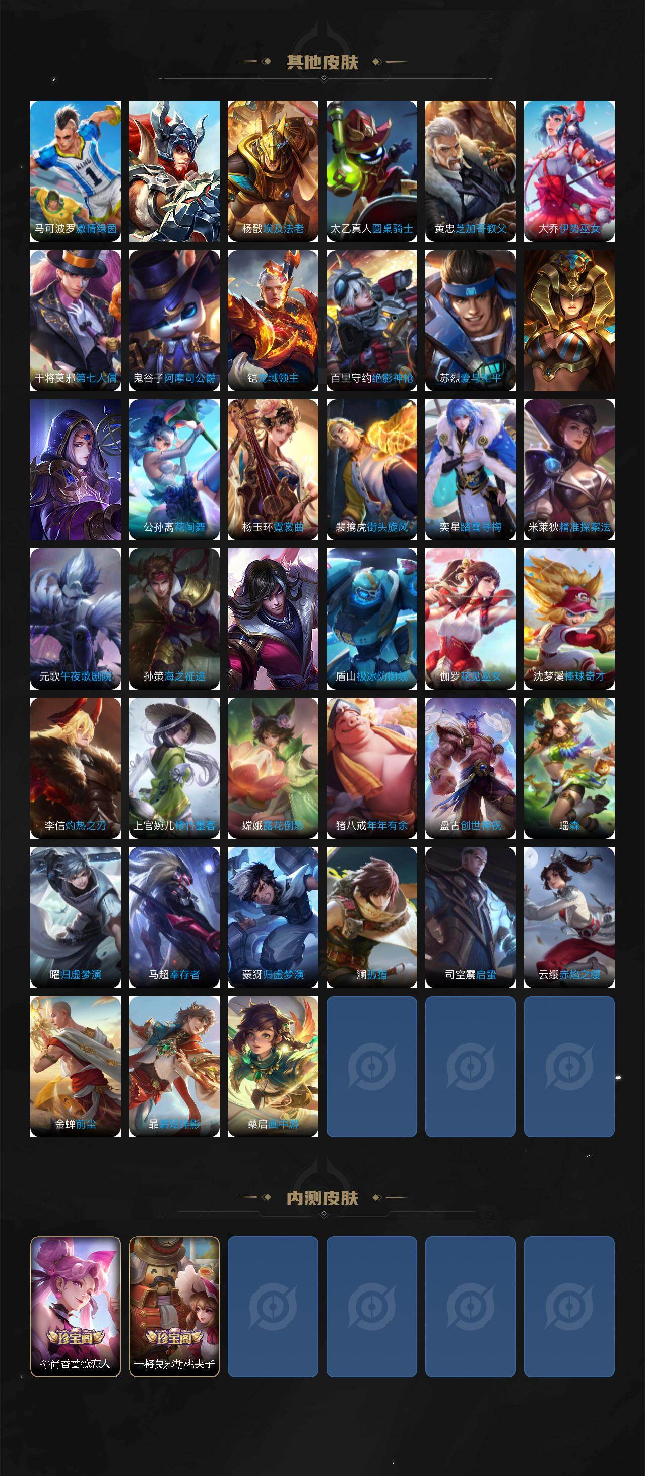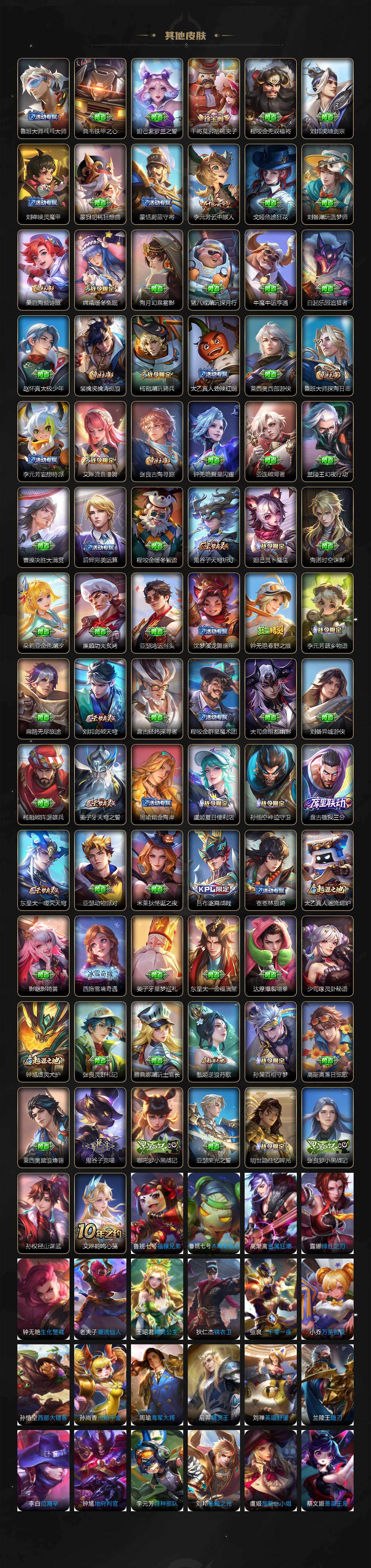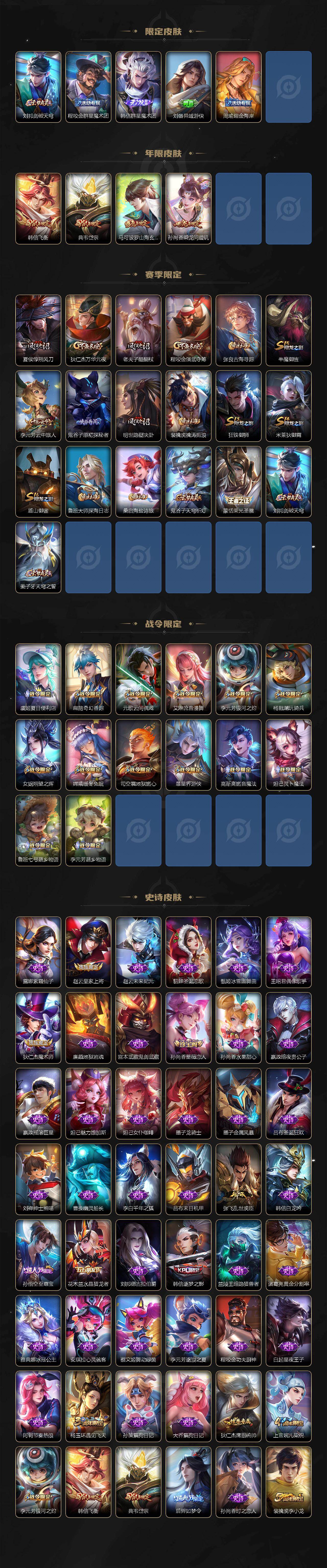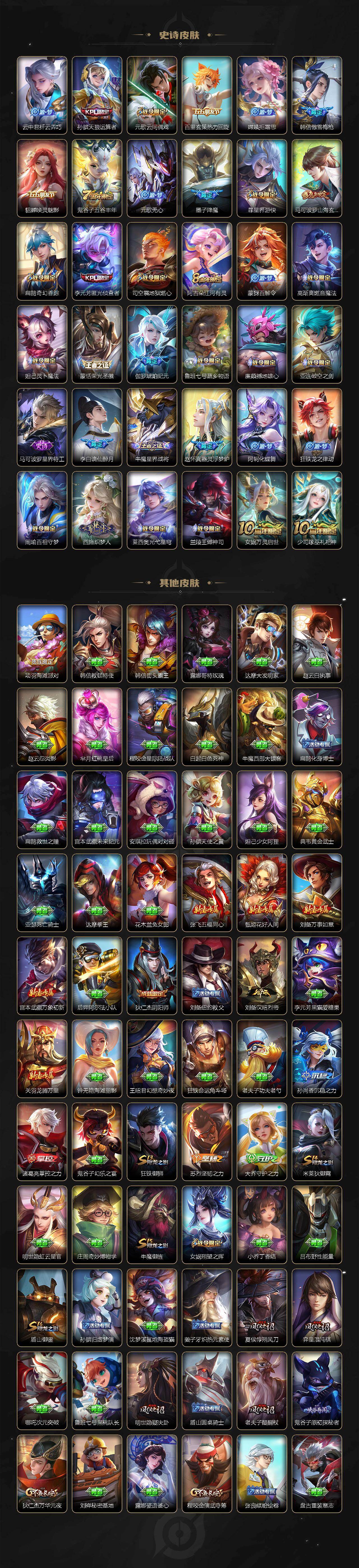 【限定皮肤】:虞姬夏日便利店,姜子牙天穹之誓,杨戬破阵退雄兵,李白谪仙醉月,狄仁杰阴阳师,赵云皇家上将,墨子降魔,孙尚香蔷薇恋人,孙膑天狼运算者,扁鹊奇幻香踪,元歌云间偶戏,元歌无心,夏侯惇朔风刀,典韦岱宗,马可波罗山海玄木吟,狄仁杰魔术师,狄仁杰万华元夜,项羽海滩派对,老夫子醍醐杖,程咬金演武夺筹,韩信逐梦之影,韩信飞衡,韩信傲雪梅枪,孙悟空至尊宝,孙悟空齐天大圣,牛魔御旌,后羿如梦令,李元芳银河之约,李元芳匿光侦查者,李元芳云中旅人,虞姬启明星使,杨玉环遇见飞天,杨戬潮玩骑兵,女娲朔望之晖,女娲补天,干将莫邪胡桃夹子,鬼谷子原初探秘者,鬼谷子五谷丰年,弈星混沌棋,明世隐疑决卦,裴擒虎李小龙,裴擒虎擒涛扼浪,狂铁御狮,米莱狄御霄,云中君纤云弄巧,盾山御銮,上官婉儿梁祝,嫦娥拒霜思,嫦娥暖冬兔眠,鲁班大师探海日志,桑启海盐诗旅,暃星界游侠,艾琳流音漫舞,司空震地狱燃心,阿古朵江河有灵,张良古海寻踪,蒙犽百解令,蒙恬荣光圣徽,高渐离燃音魔法,妲己灵卜魔法,鬼谷子天穹祈灯,伽罗琥珀纪元,孙尚香乘龙问璇玑,沈梦溪龙舞盛年,鲁班七号蔬乡物语,李元芳蔬乡物语,刘邦剑破天穹,程咬金群星魔术团,韩信群星魔术团,刘备异域游侠,周瑜熔金海岸