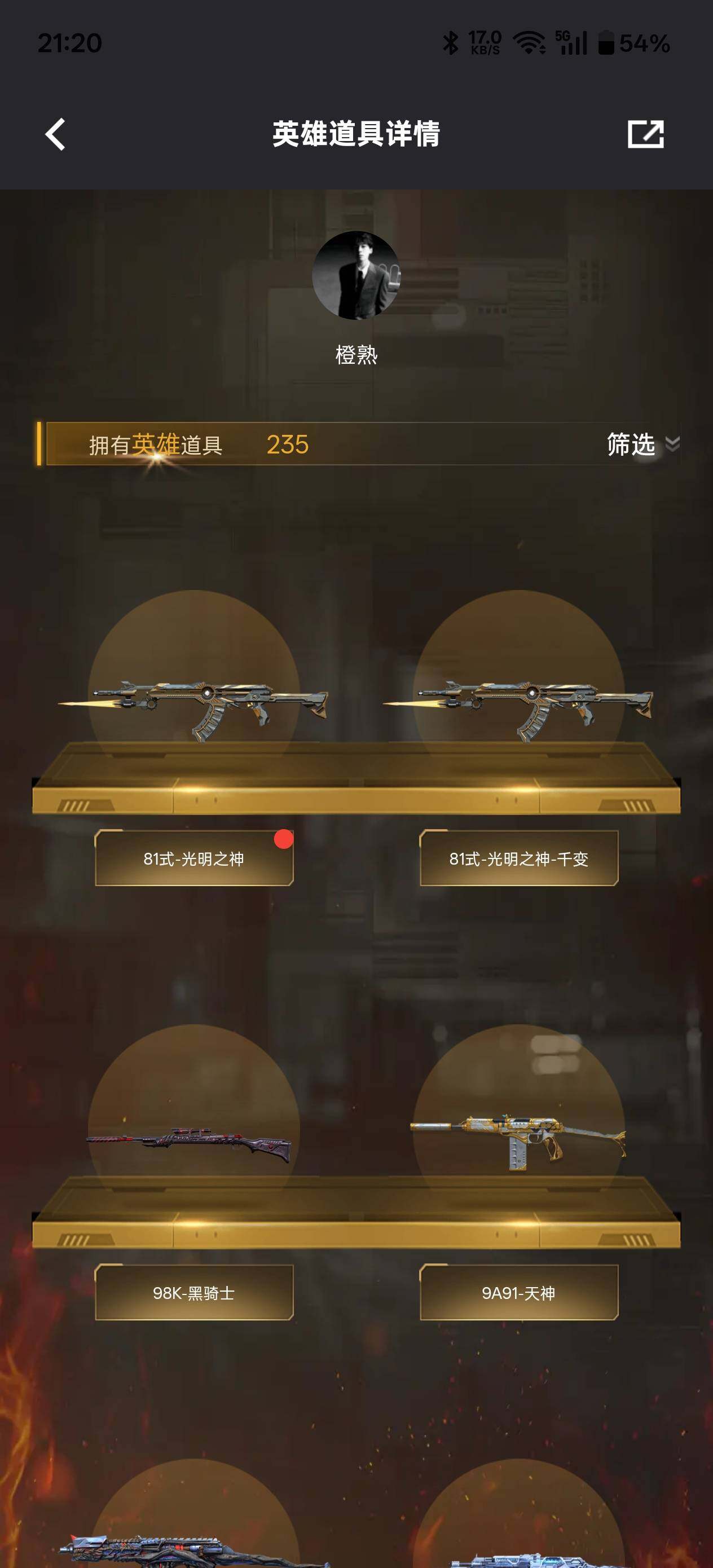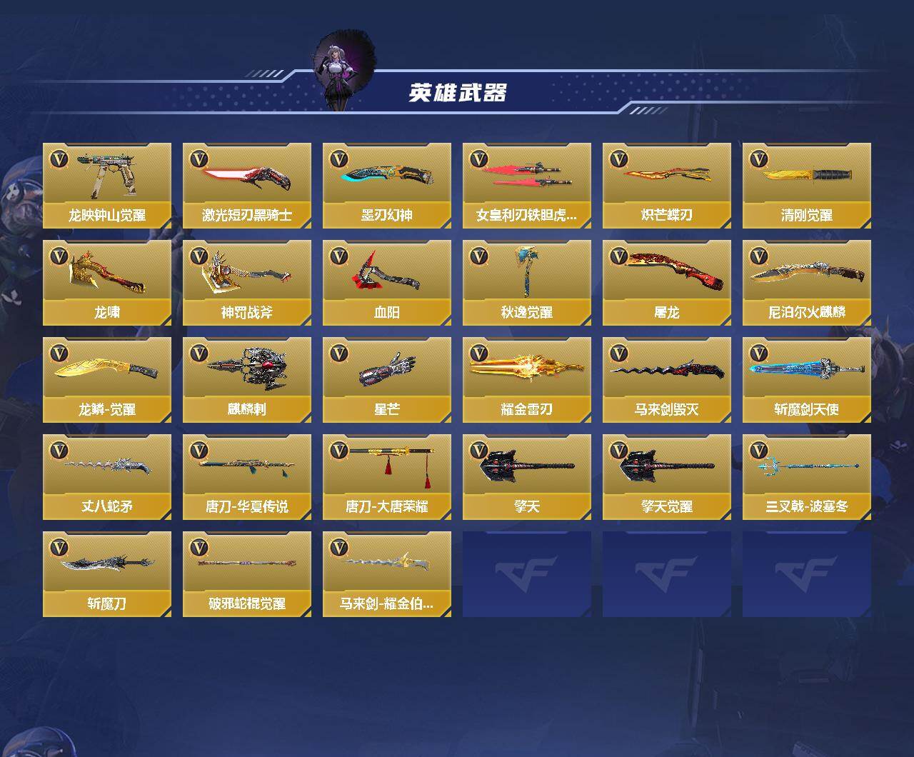 【英雄武器】:AK47-无影,AK47-火麒麟,AK47-黑武士觉醒,AK47-沙漠领主*2,AK47-游骑兵,AK47-冰魂,AK47-樱斗士-二觉,AK47-变色龙,AK47-猩红传说,AK47-沙漠郡主-一觉,AK47-沙漠郡主-超觉,AK47-幸运日,AK47-雷麒麟,AK47-血武士,AK47-木兰*2,M4A1-雷神,M4A1-黑骑士,M4A1-黑龙,M4A1-死神,M4A1-玫瑰精灵*2,M4A1-游骑兵,M4A1-君威GS*2,M4A1-武圣,M4A1-龙血,M4A1-海骑士,M4A1-心动次元,M4A1-运输船,SCAR-幽暗骑士觉醒,SCAR-探星者,SCAR-印刷术,AN94-超新星,剑齿虎-炫彩,AN94-四凶觉醒,AUG-机械纪元,9A91-天神,9A91-魔蜥觉醒,M14EBR-拂影,M16-恶魔,QBZ03-湮灭*2,QBZ03-死神*2,81式-光明之神,QBZ191-封神榜,AWM-裁决,AWM-天使,巴雷特-毁灭*5,巴雷特-极光*3,巴雷特-枪娘,巴雷特-冬灭觉醒,M200-心动次元觉醒,98K-黑骑士,RPK-赤炎盘龙,加特林-堡垒*2,刘易斯-血月,QBB95-极光,MK5-机械纪元*2,汤姆逊-烈龙*4,双持斯泰尔-天使,QCW05-死神,QCW05-变形金刚·大黄蜂,CZS2-心动次元,PP19野牛-造纸术,地狱火,地狱烈炎,KSG-火力竞放,USP-神罚*5,沙鹰-修罗*5,沙鹰-火麒麟,沙鹰-天神,沙鹰-波塞冬,沙鹰-修罗-铁骑,沙鹰-超新星,左轮-黑武士觉醒,蟒蛇-火力竞放,改装GLOCK-木兰,GLOCK18-武圣,QSZ92-华夏传说,双管猎枪-黑骑士,柯尔特-伏刹山海觉醒,CZ75-龙映钟山觉醒,激光短刃-黑骑士,墨刃-幻神,女皇利刃-铁胆虎魄,炽芒蝶刃,清刚-觉醒,龙啸,神罚战斧,血阳*2,秋逸觉醒,屠龙*6,尼泊尔-火麒麟,龙鳞-觉醒,麒麟刺*3,星芒*2,耀金雷刃,马来剑-毁灭*