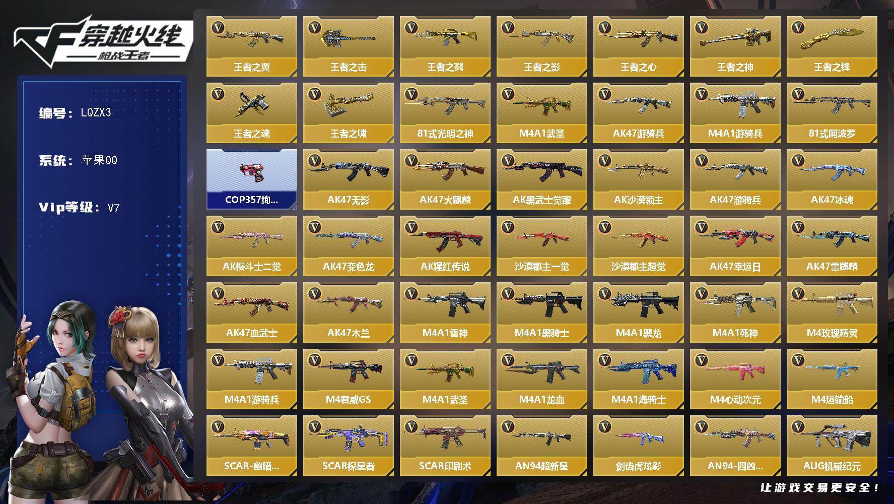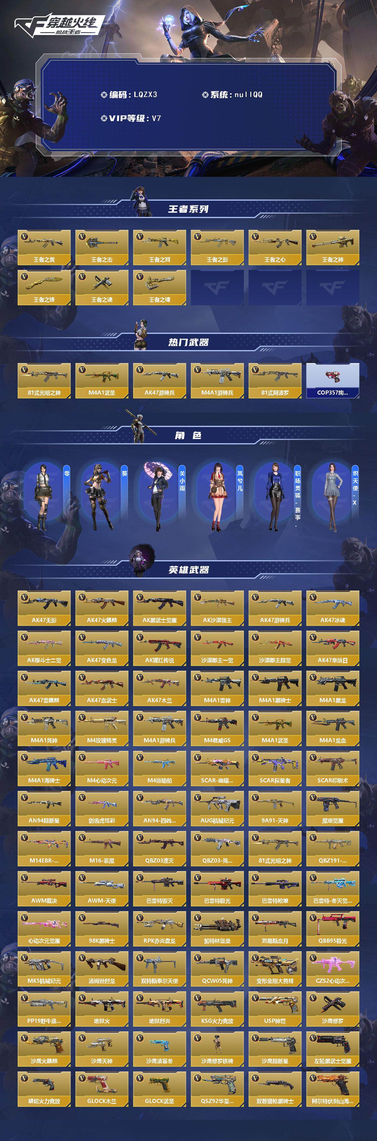 [15580362]7英雄角色数-217英雄武器数 【王者系列】:王者之翼,王者之击,王者之戮,王者之影,王者之心,王者之神,王者之锋,王者之魂,王者之啸 【热门武器】:81式-光明之神,M4A1-武圣,AK47-游骑兵,M4A1-游骑兵,81式-阿波罗,COP 357-绚樱 【角色】:零,葵,关小雨*2,岚兮儿,职场灵狐-赛事经理,炽天使-X 【英雄武器】:AK47-无影,AK47-火麒麟,AK47-黑武士觉醒,AK47-沙漠领主*2,AK47-游骑兵,AK47-冰魂,AK47-樱斗士-二觉,AK47-变色龙,AK47-猩红传说,AK47-沙漠郡主-一觉,AK47-沙漠郡主-超觉,AK47-幸运日,AK47-雷麒麟,AK47-血武士,AK47-木兰*2,M4A1-雷神,M4A1-黑骑士,M4A1-黑龙,M4A1-死神,M4A1-玫瑰精灵*2,M4A1-游骑兵,M4A1-君威GS*2,M4A1-武圣,M4A1-龙血,M4A1-海骑士,M4A1-心动次元,M4A1-运输船,SCAR-幽暗骑士觉醒,SCAR-探星者,SCAR-印刷术,AN94-超新星,剑齿虎-炫彩,AN94-四凶觉醒,AUG-机械纪元,9A91-天神,9A91-魔蜥觉醒,M14EBR-拂影,M16-恶魔,QBZ03-湮灭*2,QBZ03-死神*2,81式-光明之神,QBZ191-封神榜,AWM-裁决,AWM-天使,巴雷特-毁灭*5,巴雷特-极光*3,巴雷特-枪娘,巴雷特-冬灭觉醒,M200-心动次元觉醒,98K-黑骑士,RPK-赤炎盘龙,加特林-堡垒*2,刘易斯-血月,QBB95-极光,MK5-机械纪元*2,汤姆逊-烈龙*4,双持斯泰尔-天使,QCW05-死神,QCW05-变形金刚·大黄蜂,CZS2-心动次元,PP19野牛-造纸术,地狱火,地狱烈炎,KSG-火力竞放,USP-神罚*5,沙鹰-修罗*5,沙鹰-火麒麟,沙鹰-天神,沙鹰-波塞冬,沙鹰-修罗-铁骑,沙鹰-超新星,左轮-黑武士觉醒,蟒蛇-火力竞放,改装GLOCK-木兰,GLOCK18-武圣,QSZ92-华夏传说,双管猎枪-黑骑士,柯尔特-伏刹山海觉醒,CZ75-龙映钟山觉醒,激光短刃-黑骑士,墨刃-幻神,女皇利刃-铁胆虎魄,炽芒蝶刃,清刚-觉醒,龙啸,神罚战斧,血阳*2,秋逸觉醒,屠龙*6,尼泊尔-火麒麟,龙鳞-觉醒,麒麟刺*3,星芒*2,耀金雷刃,马来剑-毁灭*