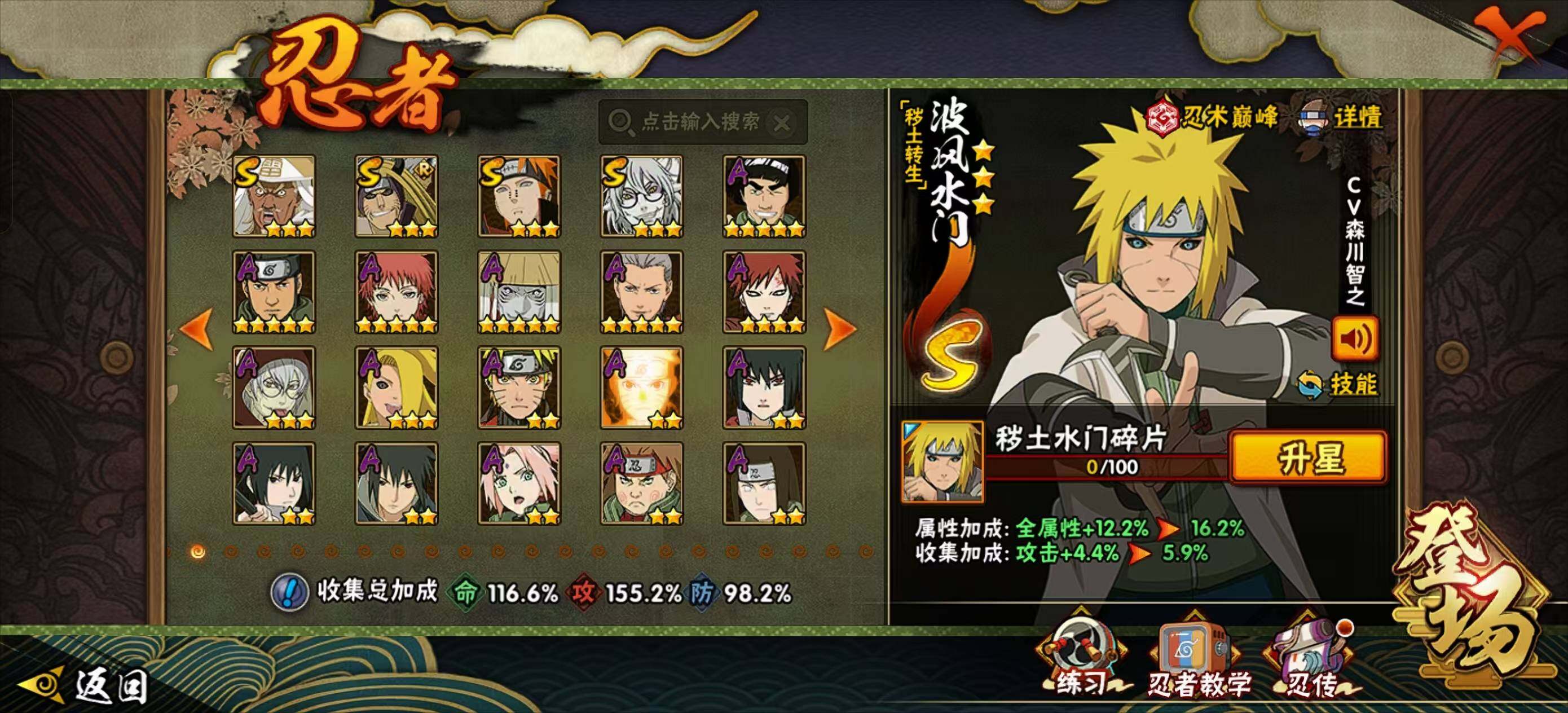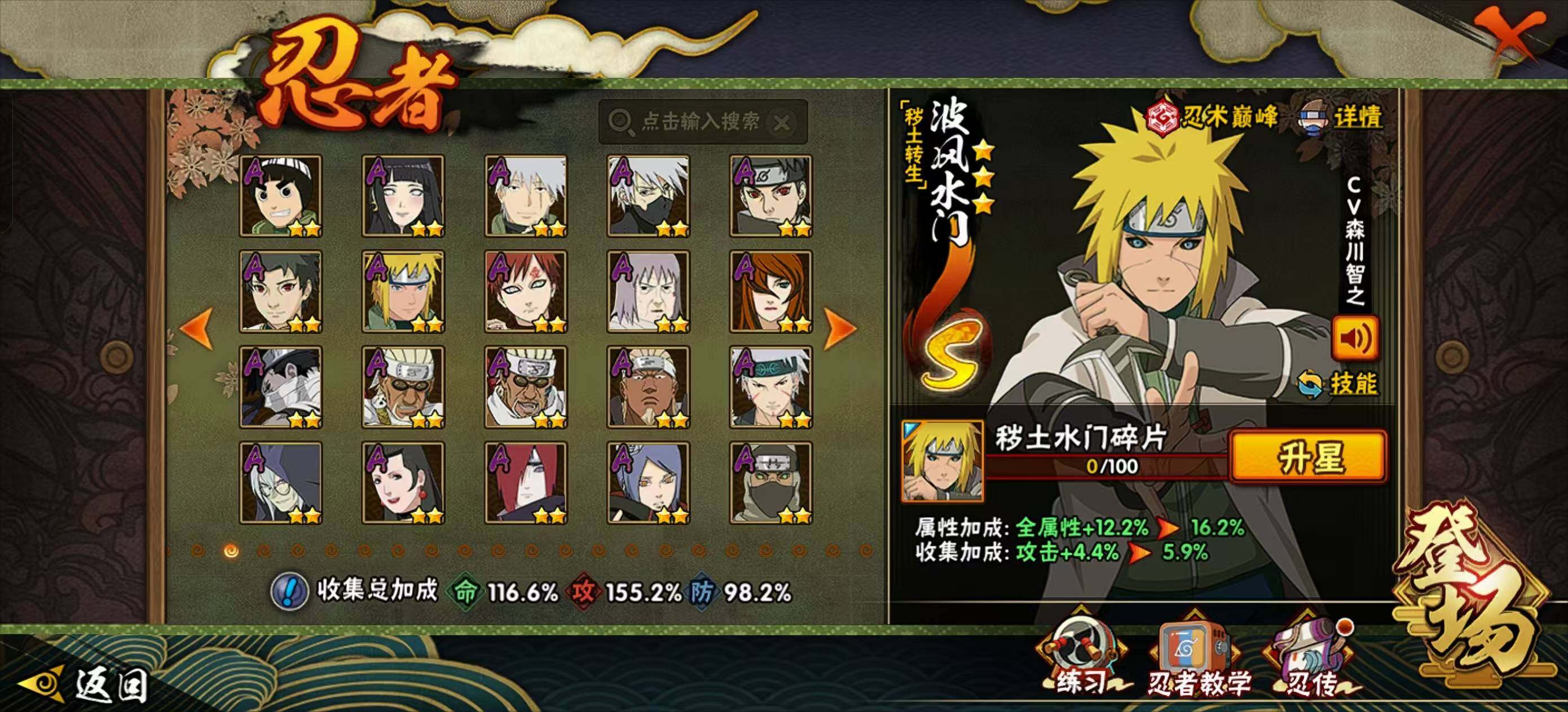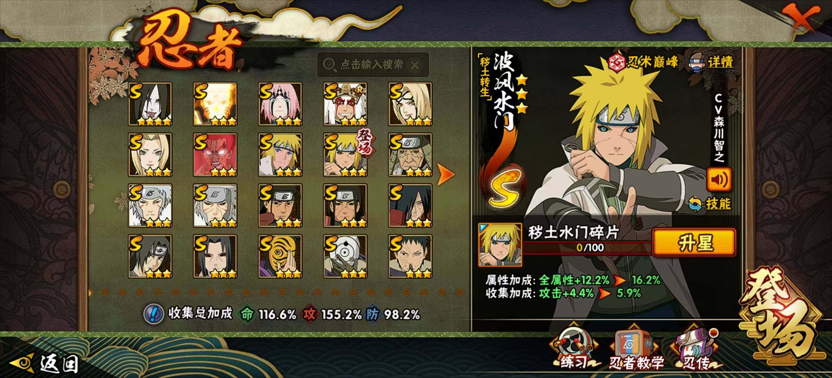 【S级忍者】:金角·银角「秽土转生」(3星),猿飞日斩「秽土转生」(3星),波风水门「秽土转生」(3星),千手扉间「秽土转生」(3星),千手柱间「秽土转生」(3星),宇智波鼬「秽土转生」(3星),宇智波斑「秽土转生」(3星),春野樱「忍界大战」(3星),宇智波带土「忍界大战」(3星),宇智波鼬「须佐能乎」(3星),艾「四代目雷影」(3星),自来也「舞之豪杰」(3星),大蛇丸(4星),纲手(3星),纲手「百豪」(3星),千手柱间(3星),千手扉间(3星),波风水门(3星),药师兜「仙人模式」(3星),神秘面具男(3星),漩涡鸣人「九喇嘛连结」(3星),迈特凯「死门」(3星),佩恩「天道」(3星),宇智波斑 「白面具」(3星宇智波斑「白面具」)