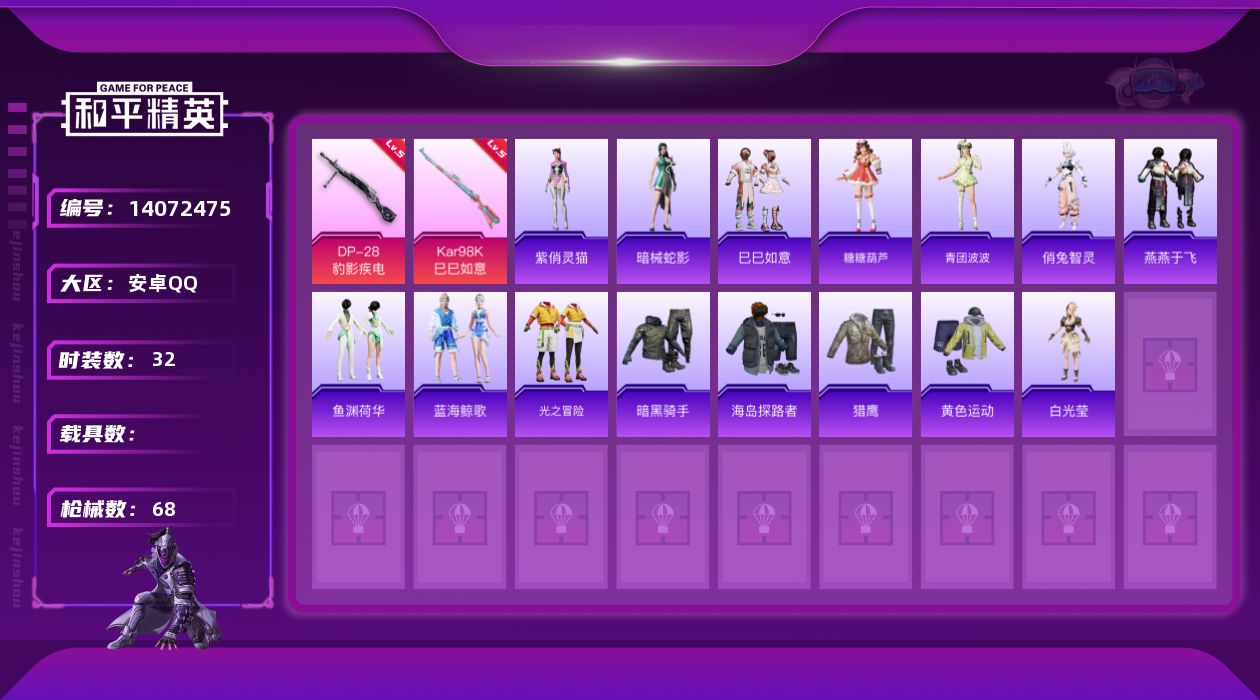 [14072475]【1581】安卓 手Q-0粉装-2特效枪-0载具-0粉色飞行器-15405热力值-2王牌印记-32套装-68枪皮 【粉色枪皮等级】:Kar98K-巳巳如意(五级),DP-28-豹影疾电(五级) 【粉色枪皮】:Kar98K-巳巳如意,DP-28-豹影疾电 【粉色降落伞】:绯穹魔姬降落伞,喜羊羊与灰太狼降落伞,异瞳寒姬降落伞 【稀有套装】:套装-暗械蛇影,套装-巳巳如意,套装-糖糖葫芦,套装-青团波波,角色-俏兔智灵,套装-燕燕于飞,套装-鱼渊荷华,套装-蓝海鲸歌,角色-紫俏灵猫 【稀有枪皮】:AKM-破晓战魂,M16A4-千金淑猫,SCAR-L-红色方程式,M416-红色方程式,M416-蓝色火焰,AUG-甜蜜菠萝,AUG-耀粉歌者,M762-天降萌叽,G36C-星穹咏叹调,UMP45-夜灯,UMP45-绒宝小鹅,汤姆逊-天降萌叽,P90-巳巳如意,Mini14-镭金极速,AMR-喜羊羊与灰太狼,S686-巳巳如意,S12K-夜灯,MG3-幻世战舞者,爆炸猎弓-喜羊羊与灰太狼,破片手榴弹-巳巳如意 【其他套装】:套装-光之冒险,套装-暗黑骑手,套装-海岛探路者,套装-猎鹰,套装-黄色运动,角色-白光莹 【营地ID】:1016010307