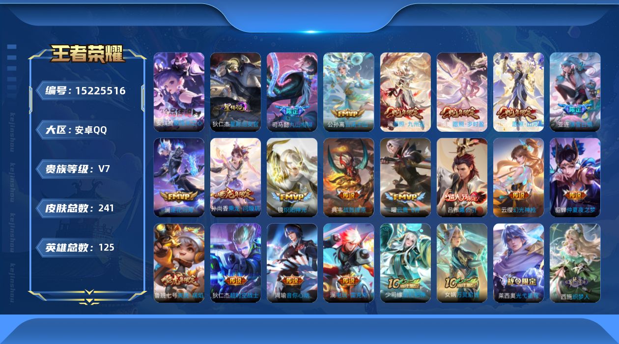 [15225516]【店主推荐捡漏号!可直接换绑】,安卓Q-V7-最强王者段位-125英雄-241皮肤-1珍品传说-20传说-67史诗