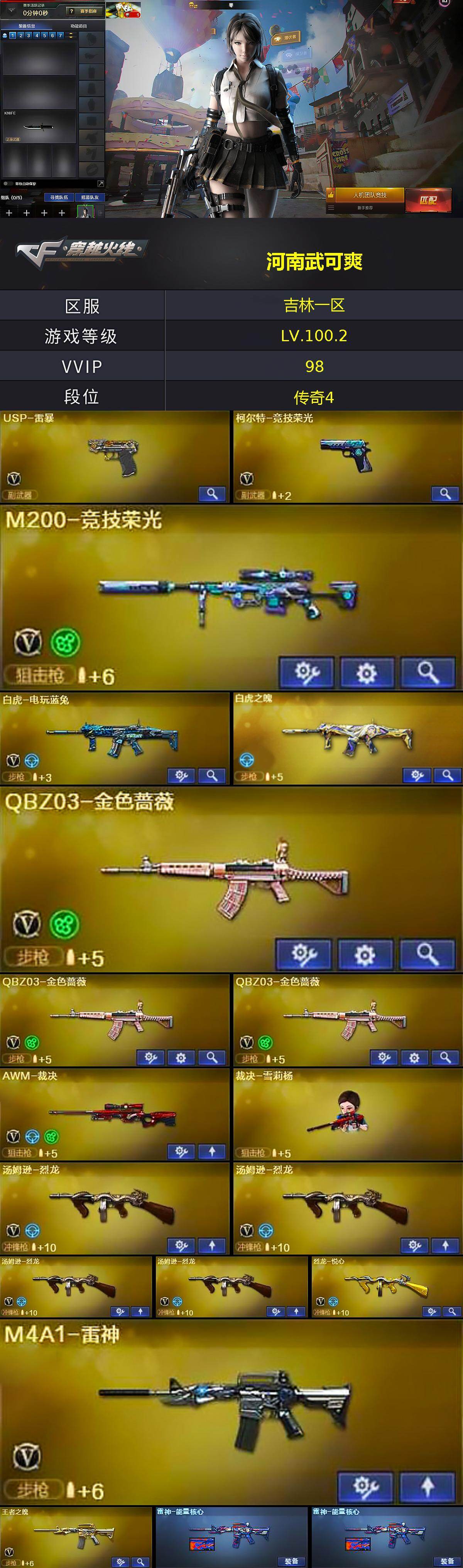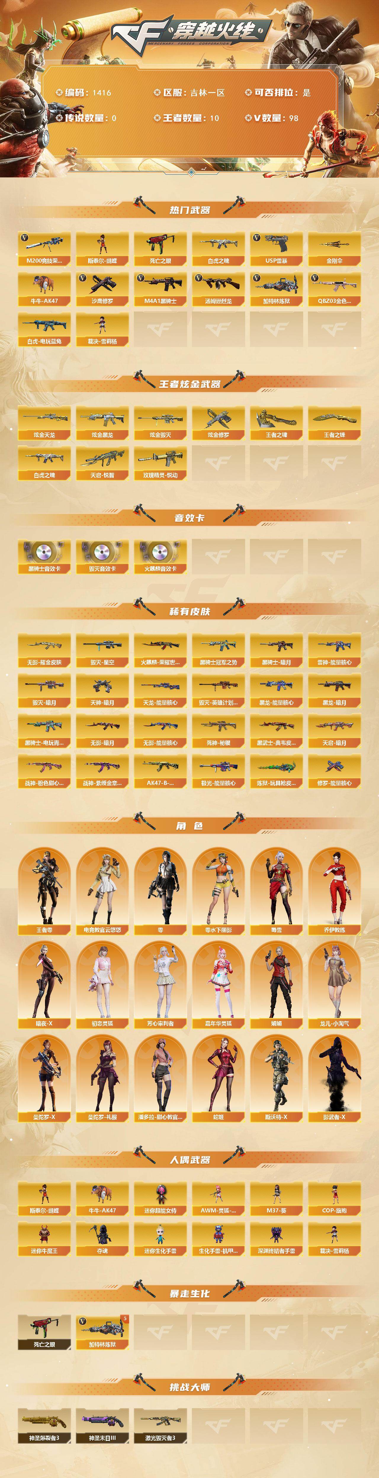 [15410839]吉林一区-98V-10王者-7炫金 【热门武器】:QBZ03-金色蔷薇*3,M200-竞技荣光,死亡之眼,白虎之魄,白虎-电玩蓝兔,牛牛-AK47,M4A1-黑骑士,汤姆逊-烈龙*4,加特林-炼狱*5,斯泰尔-蝴蝶,裁决-雪莉杨,USP-雷暴,沙鹰-修罗*3,金刚伞 【王者炫金武器】:天启-悦智,玫瑰精灵-悦动,白虎之魄,王者之啸,王者之锋,炫金黑龙*3,炫金毁灭*2,炫金天龙,炫金修罗 【音效卡】:AK47-火麒麟音效卡,M4A1-黑骑士音效卡,Barrett-毁灭音效卡 【皮肤】:雷神-能量核心*2,火麒麟-荣耀世冠AG,毁灭-暗月*2,毁灭-星空,毁灭-英雄计划 皮肤,黑龙-能量核心,黑龙-暗月*2,黑骑士-暗月,黑骑士-冠军之势,黑骑士-电玩青兔皮肤,无影-暗月*2,无影-能量核心,无影耀金皮肤,死神-秘银,黑武士-典韦皮肤,天启-暗月*6,战神-粉色甜心皮肤,战神-紫绶金章皮肤,AK47-B-常胜将军-孙权,天龙-能量核心,极光-能量核心,炼狱-玩具枪皮肤,修罗-能量核心*2,天神-暗月 【角色】:零,电竞教官-云悠悠,王者-零,乔伊教练,暗夜-X,初恋灵狐,芳心审判者,嘉年华灵狐,娟娟,零-水下丽影,龙儿-小淘气,曼陀罗-X,曼陀罗-礼服,潘多拉-甜心教官,蛇姬,斯沃特-X,蜀雪,影武者-X 【人偶武器】:裁决-雪莉杨,斯泰尔-蝴蝶,AWM-灵狐-15周年嘉年华,M37-葵,COP-旗袍,牛牛-AK47,迷你牛魔王,夺魂,迷你生化手雷,生化手雷-机甲核心,深渊终结者手雷,迷你超能女侍 【暴走生化】:死亡之眼 【挑战大师】:神圣爆裂者III,激光毁灭者III,神圣爆裂者-末日III 【英雄级武器】:M4A1-千变*2,AK47-火麒麟,M4A1-黑龙*2,M4A1-雷神,M4A1-黑骑士,AK47-无影,M4A1-死神,AK47-黑武士*2,AN94-超新星*2,M4A1-武圣,AK47-机械迷城,AK47-黑鲨,无影-神兵利器,M4A1-玫瑰精灵*3,QBZ03-金色蔷薇*3,M4A1-猎神,烈火-动感闪耀,王者之影-觉醒版,王者之魄-觉醒版,王者之势-觉醒版,AK-47-猩红传说*2,AK47-B-战神,白虎-电玩蓝兔,AWM-天龙*2,Barrett-毁灭*6,Barrett-极光,AWM-裁决,M200-竞技荣光,加特林-炼狱*5,悦蓝-惊涛骇浪