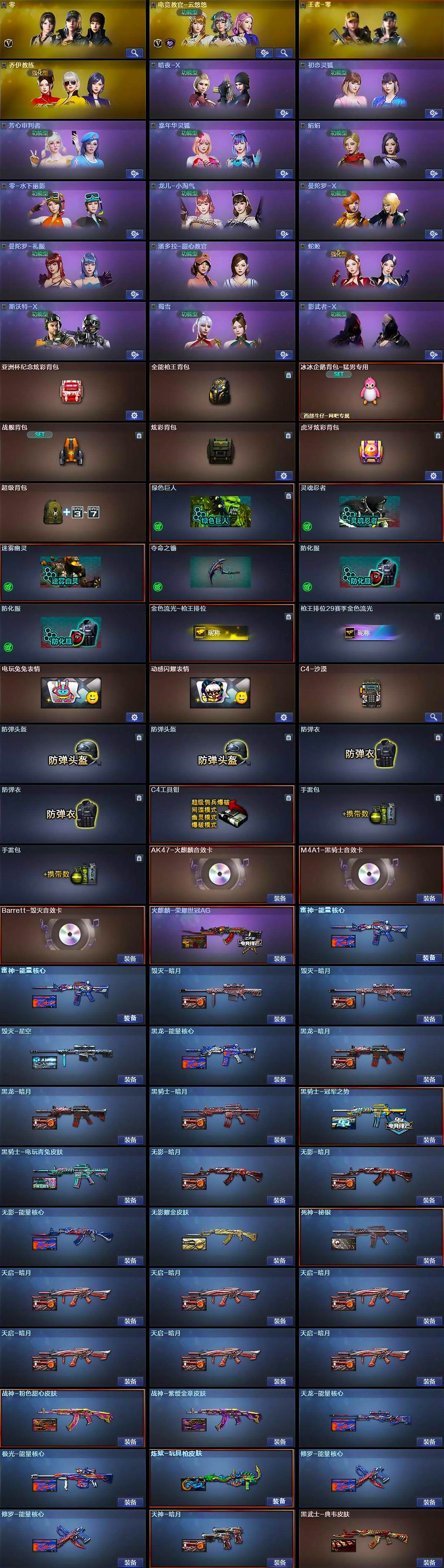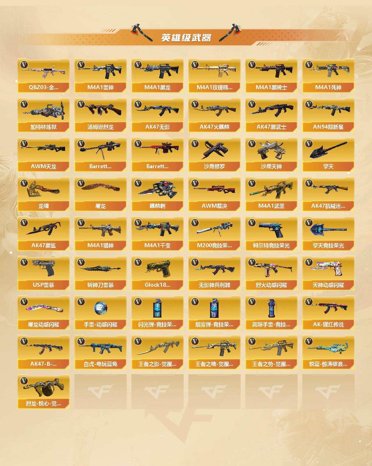 【英雄级武器】:M4A1-千变*2,AK47-火麒麟,M4A1-黑龙*2,M4A1-雷神,M4A1-黑骑士,AK47-无影,M4A1-死神,AK47-黑武士*2,AN94-超新星*2,M4A1-武圣,AK47-机械迷城,AK47-黑鲨,无影-神兵利器,M4A1-玫瑰精灵*3,QBZ03-金色蔷薇*3,M4A1-猎神,烈火-动感闪耀,王者之影-觉醒版,王者之魄-觉醒版,王者之势-觉醒版,AK-47-猩红传说*2,AK47-B-战神,白虎-电玩蓝兔,AWM-天龙*2,Barrett-毁灭*6,Barrett-极光,AWM-裁决,M200-竞技荣光,加特林-炼狱*5,悦蓝-惊涛骇浪