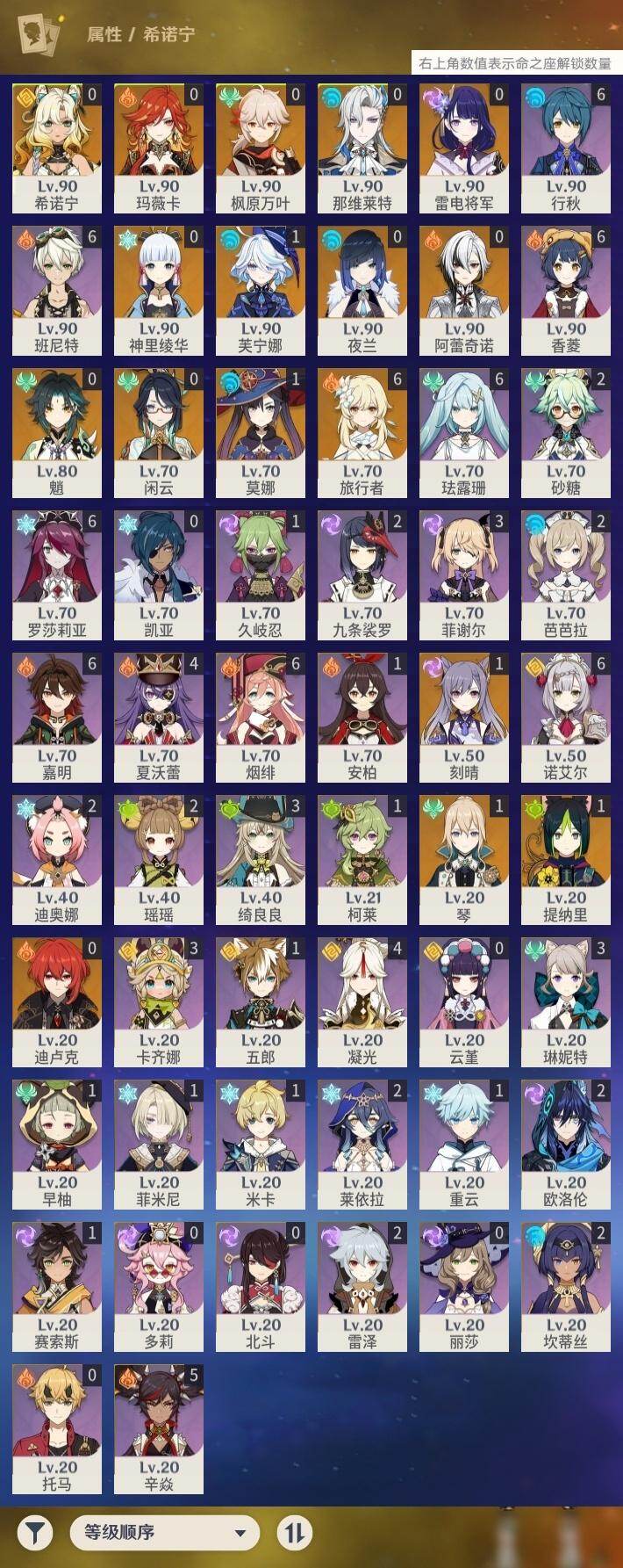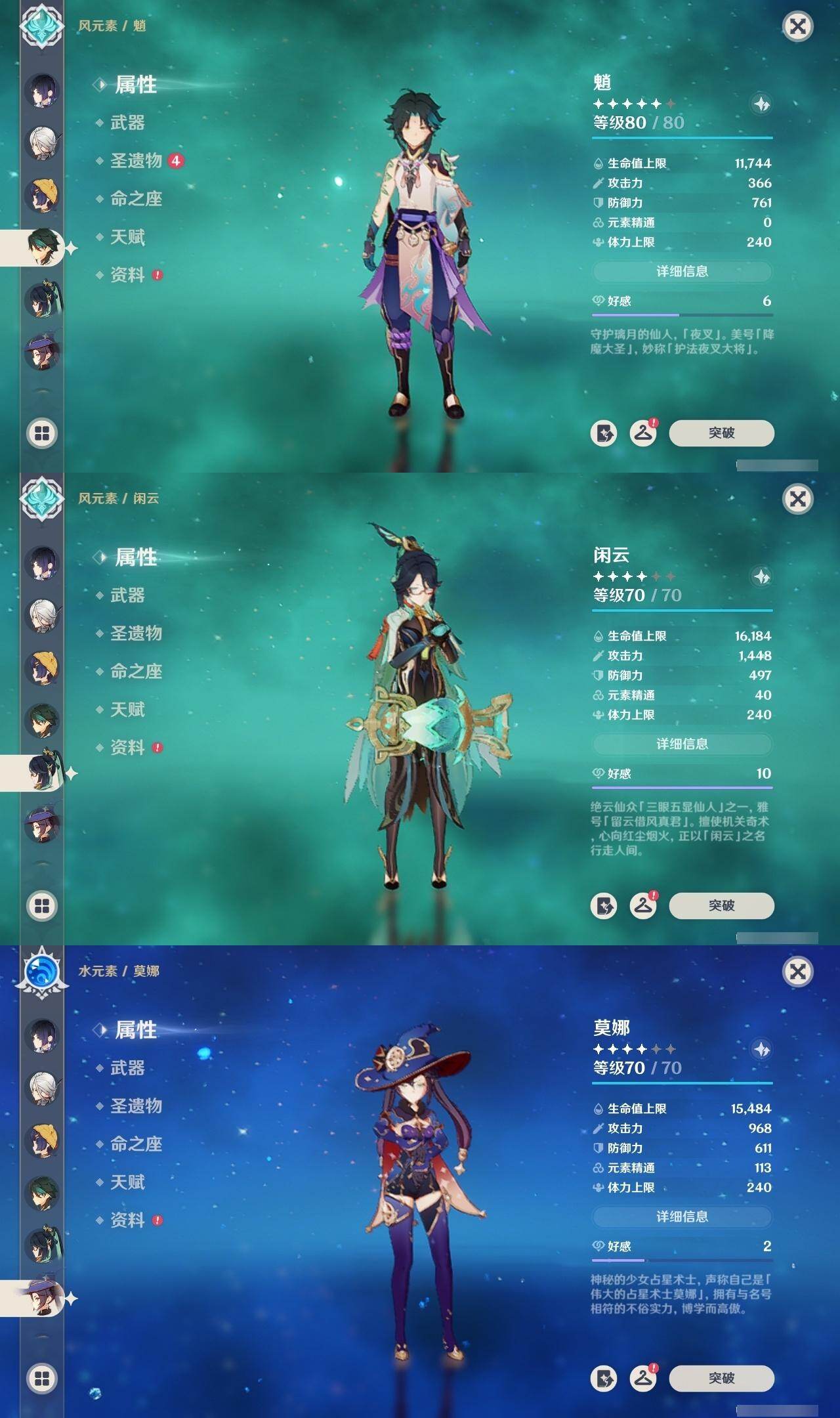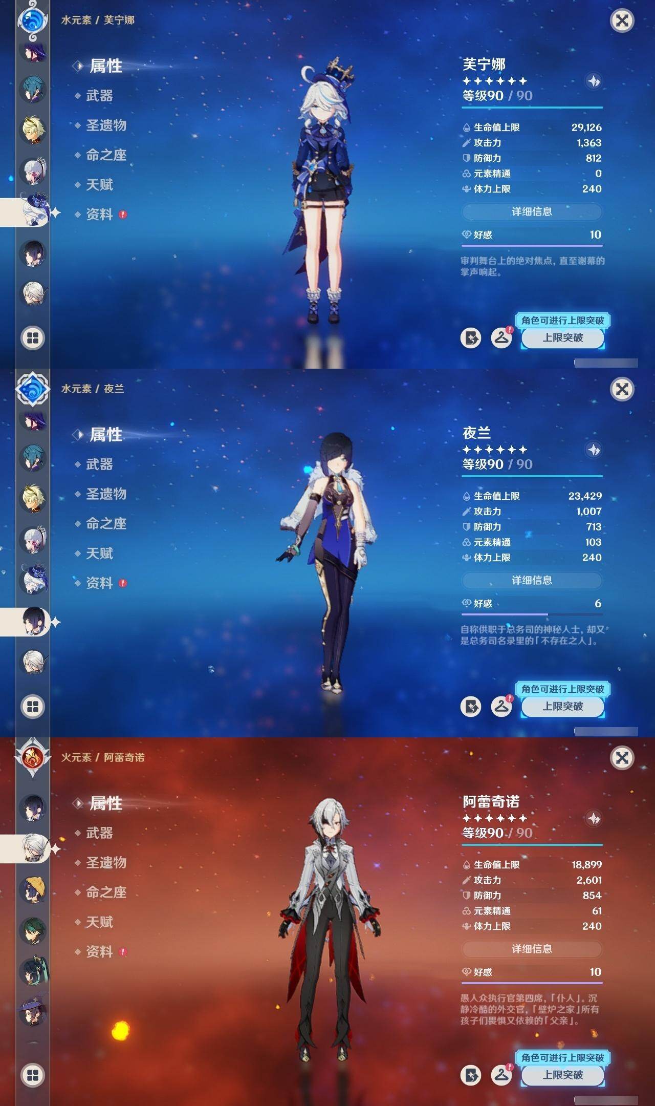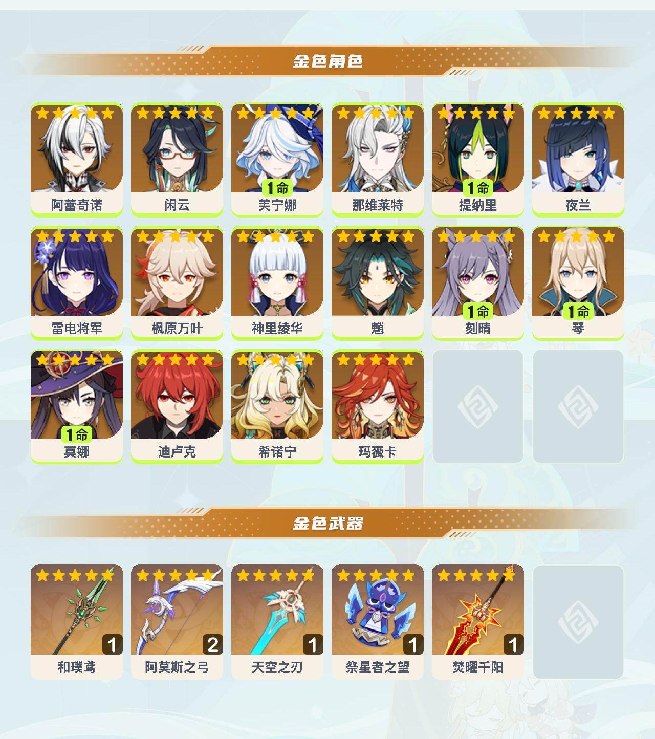 0命阿蕾奇诺,0命闲云,1命芙宁娜,0命那维莱特,1命提纳里,0命夜兰,0命雷电将军,0命枫原万叶,0命神里绫华,0命魈,1命刻晴,1命琴,1命莫娜,0命迪卢克,0命希诺宁,0命玛薇卡,精1和璞鸢,精2阿莫斯之弓,精1天空之刃,精1祭星者之望,精1焚曜千阳