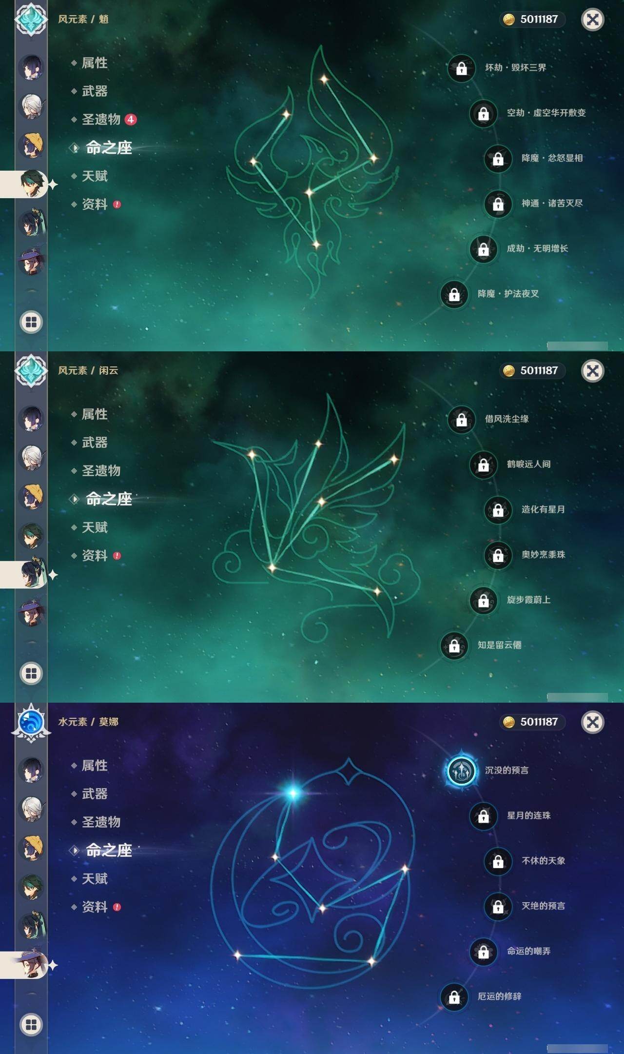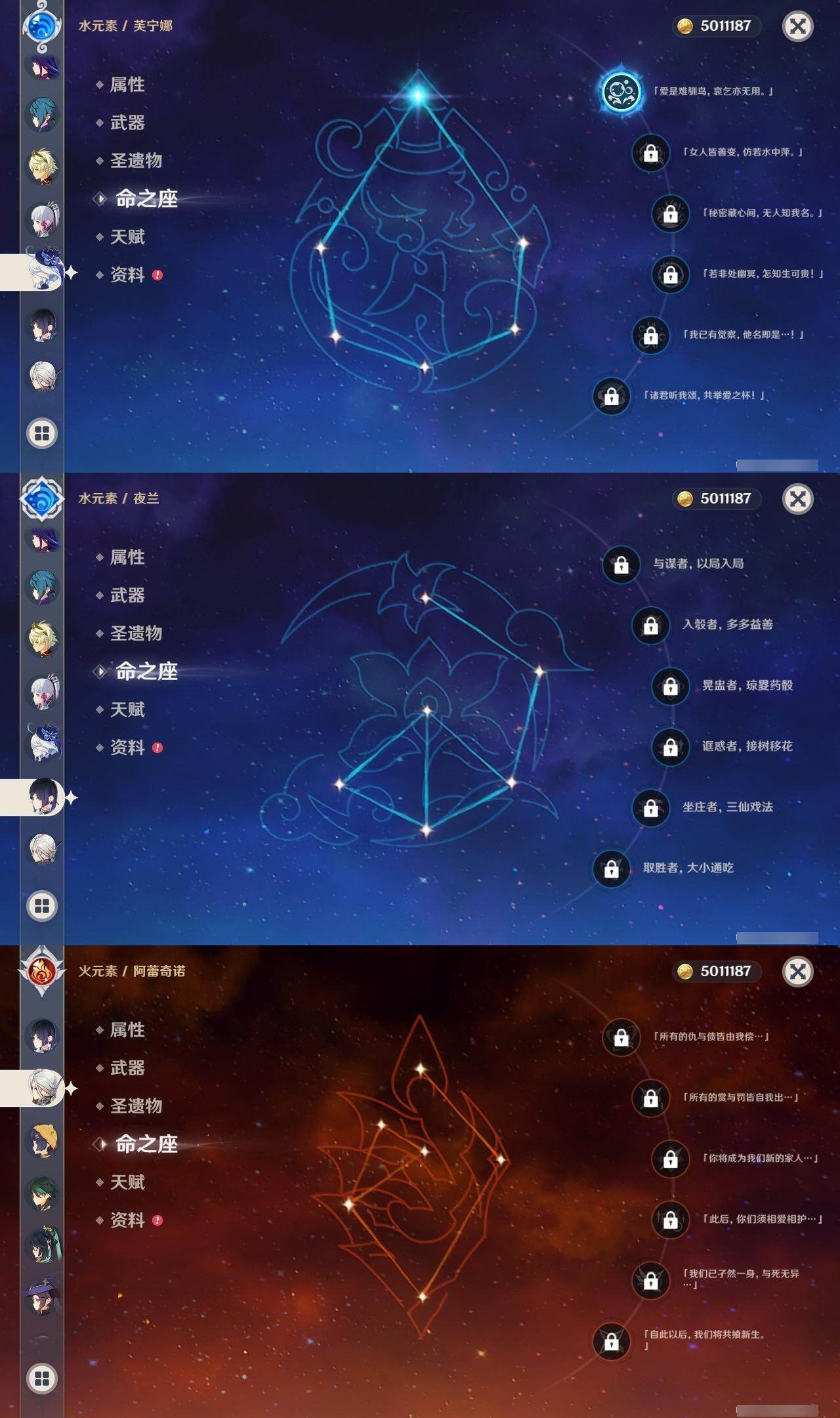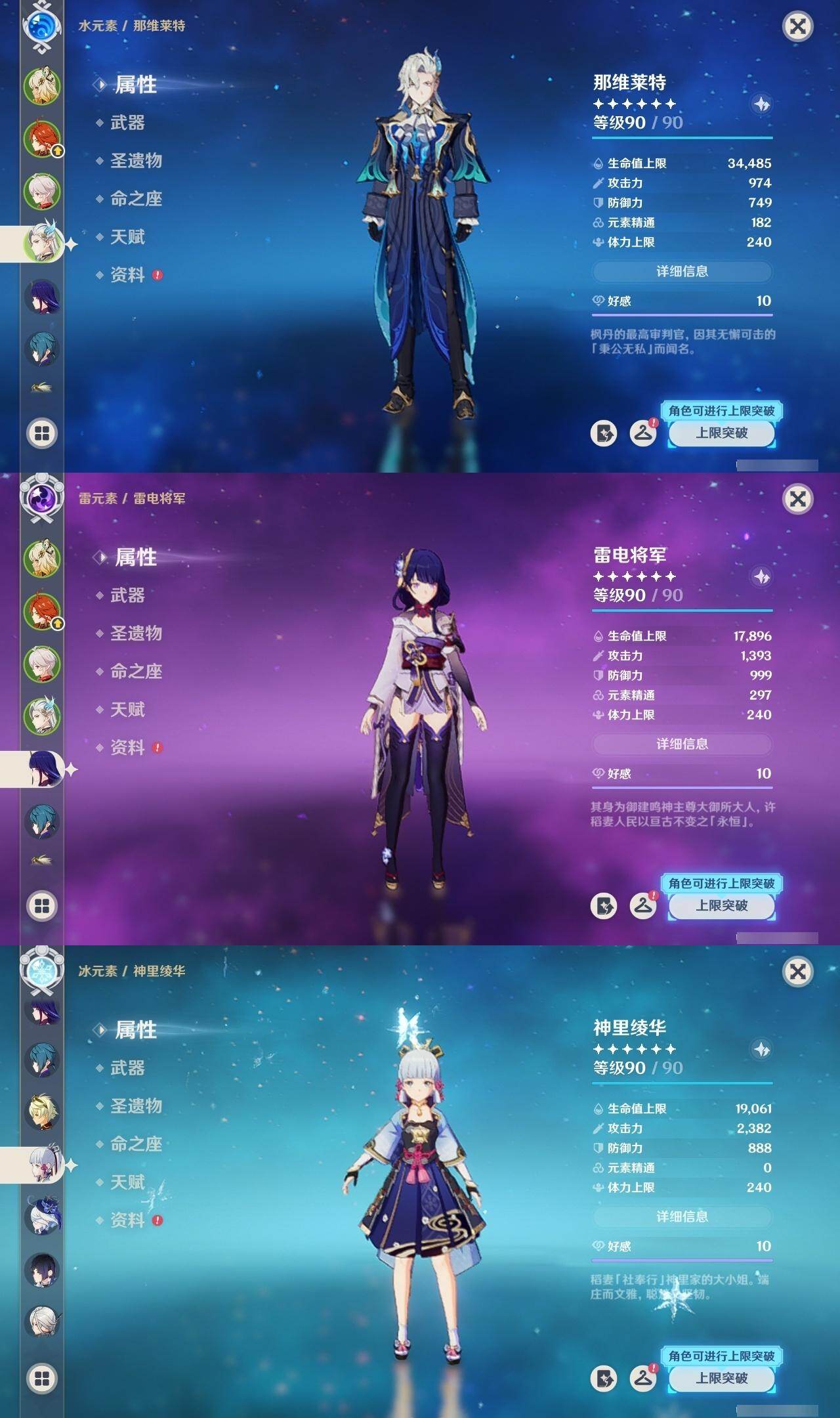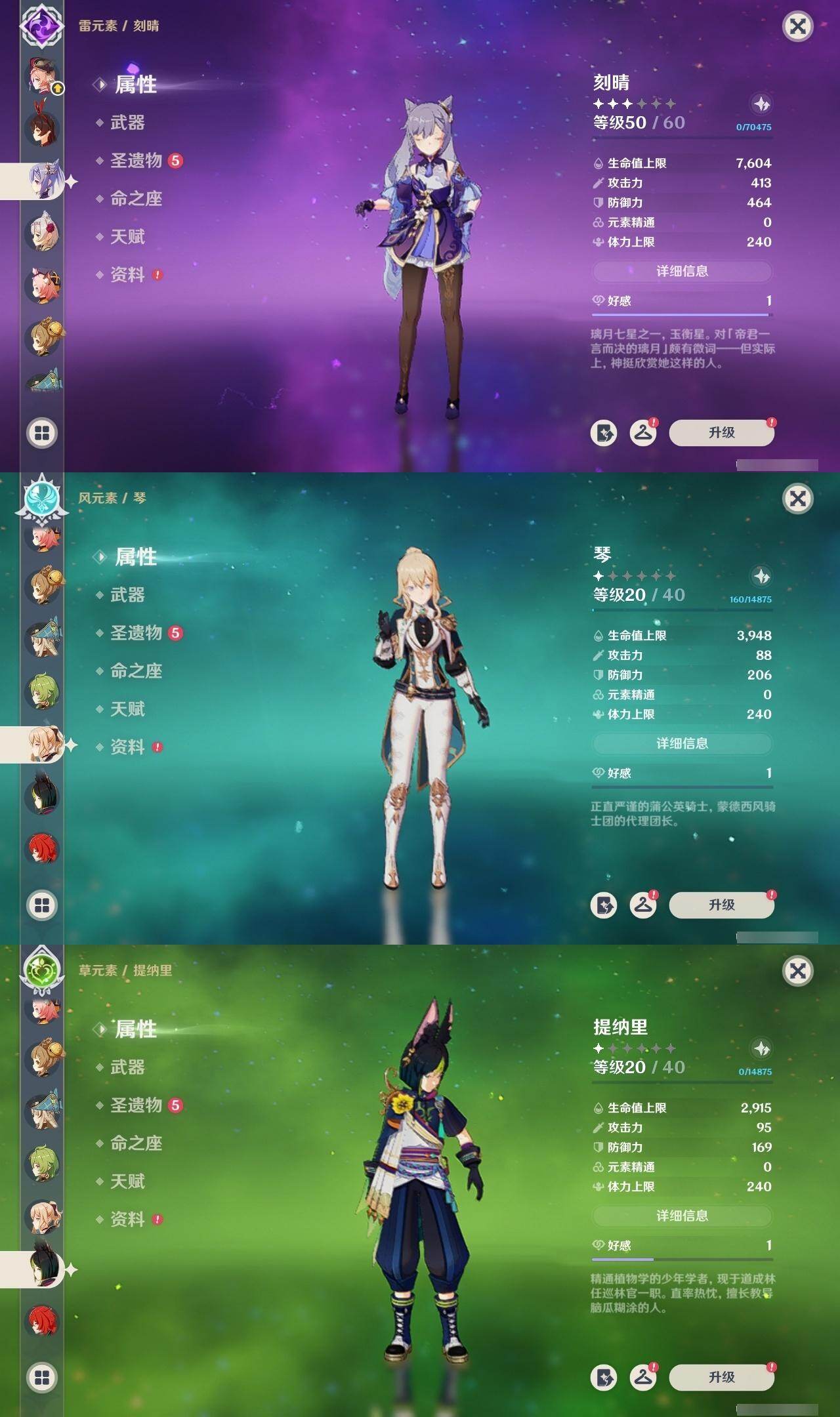 0命阿蕾奇诺,0命闲云,1命芙宁娜,0命那维莱特,1命提纳里,0命夜兰,0命雷电将军,0命枫原万叶,0命神里绫华,0命魈,1命刻晴,1命琴,1命莫娜,0命迪卢克,0命希诺宁,0命玛薇卡,精1和璞鸢,精2阿莫斯之弓,精1天空之刃,精1祭星者之望,精1焚曜千阳