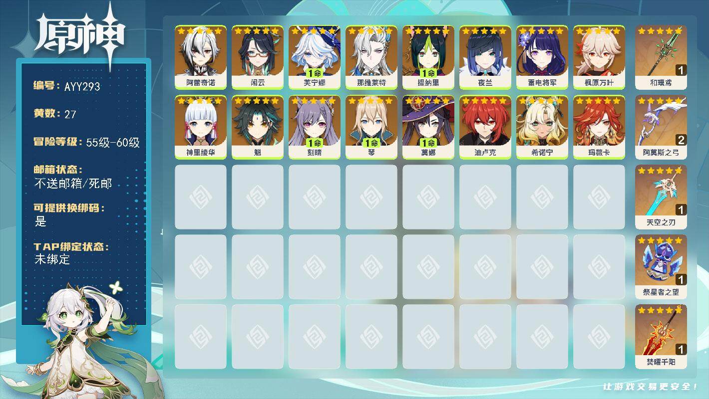 [15510269]58级/27黄/女主/16个五星角色/5个五星武器 0命阿蕾奇诺,0命闲云,1命芙宁娜,0命那维莱特,1命提纳里,0命夜兰,0命雷电将军,0命枫原万叶,0命神里绫华,0命魈,1命刻晴,1命琴,1命莫娜,0命迪卢克,0命希诺宁,0命玛薇卡,精1和璞鸢,精2阿莫斯之弓,精1天空之刃,精1祭星者之望,精1焚曜千阳
