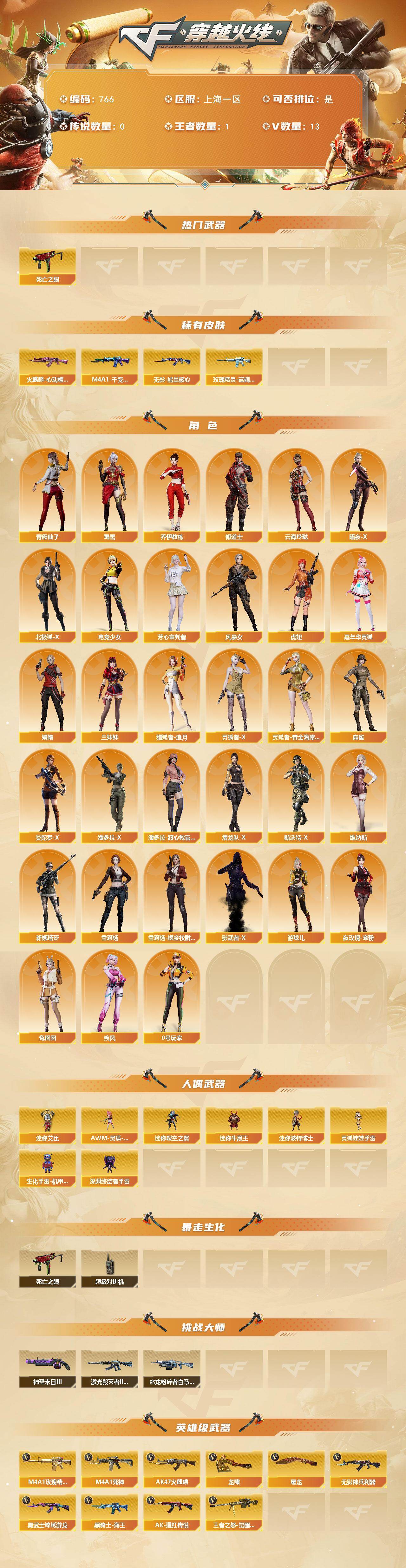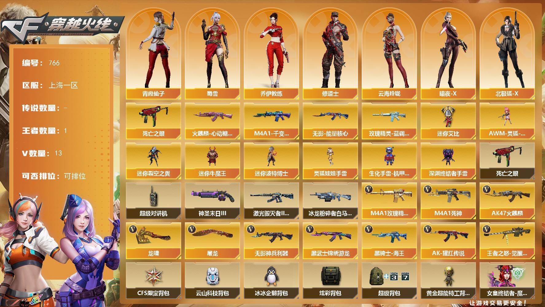 [15573529]上海一区-13V-1王者-0炫金 【热门武器】:死亡之眼 【皮肤】:火麒麟-心动糖果,M4A1-千变-孔明皮肤,无影-能量核心,玫瑰精灵-蓝调梦幻 皮肤 【角色】:乔伊教练,修道士,云海玲珑,暗夜-X,北极狐-X,电竞少女,芳心审判者,风暴女,虎妞,嘉年华灵狐,疾风,娟娟,兰妹妹,猎狐者-追月,0号玩家,灵狐者-X,灵狐者-黄金海岸,麻雀,曼陀罗-X,潘多拉-X,潘多拉-甜心教官,潜龙队-X,青霞仙子,斯沃特-X,蜀雪,兔囡囡,维纳斯,新娜塔莎,雪莉杨,雪莉杨-摸金校尉,夜玫瑰-宠粉,影武者-X,游珑儿 【人偶武器】:AWM-灵狐-15周年嘉年华,迷你裂空之翼,迷你牛魔王,迷你波特博士,生化手雷-机甲核心,深渊终结者手雷*2,迷你艾比,灵狐娃娃手雷 【暴走生化】:死亡之眼,超级对讲机 【挑战大师】:冰龙粉碎者-白马银枪,激光毁灭者III-白马银枪,神圣爆裂者-末日III 【英雄级武器】:AK47-火麒麟,M4A1-死神,无影-神兵利器,黑武士-锦绣游龙,M4A1-玫瑰精灵,AK-47-猩红传说,黑骑士-海王*2,王者之怒-觉醒版,屠龙,龙啸 【道具】:CFS限定背包,云山科技背包,冰冰企鹅背包,炫彩背包,超级背包,黄金超能特工背包,哔哩哔哩名片,女皇终结者-魔龙之吻,救世主-黑桃战神,妩媚妖姬,绿色巨人,灵魂忍者*2,变异宝贝,迷雾幽灵*2,生化弹匣,夺命之镰,防化服*3,金色流光-枪王排位*2,星辰流光-枪王排位,流光-再燃火线,枪王排位28赛季金色流光,枪王排位29赛季金色流光,炽雪表情,EP战队名片,EP战队喷图,C4-再燃火线,防弹头盔*15,防弹衣*14,C4工具钳*10,手雷包*8 【特殊枪械】: