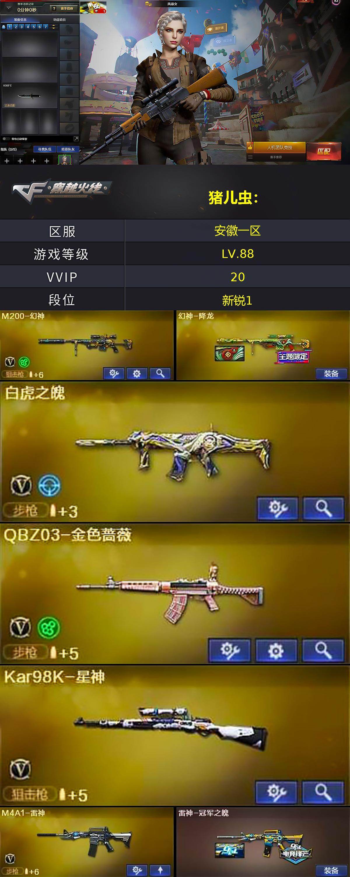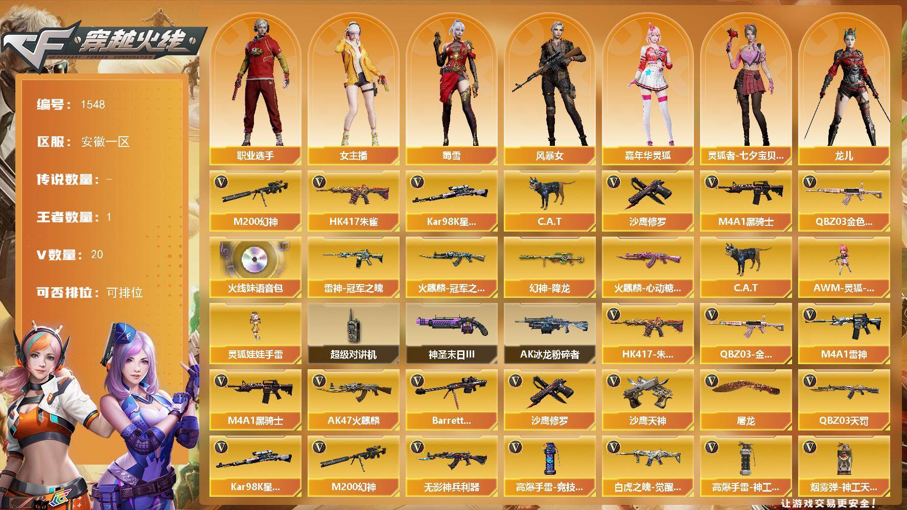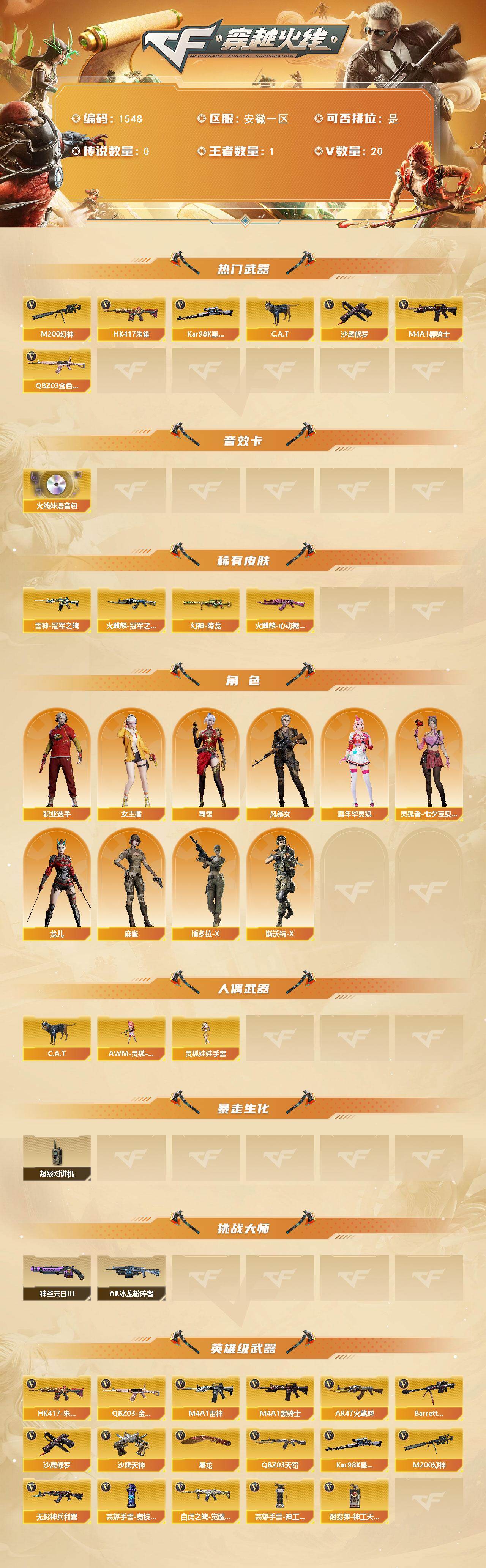[15585861]安徽一区-20V-1王者-0炫金 【热门武器】:QBZ03-金色蔷薇,HK417-朱雀,M200-幻神,Kar98K-星神,C.A.T,M4A1-黑骑士,沙鹰-修罗*2 【音效卡】:火线妹语音包 【皮肤】:幻神-降龙,雷神-冠军之魄,火麒麟-冠军之心,火麒麟-心动糖果 【角色】:风暴女,嘉年华灵狐,灵狐者-七夕宝贝,龙儿,麻雀,女主播,潘多拉-X,斯沃特-X,蜀雪,职业选手 【人偶武器】:AWM-灵狐-15周年嘉年华,C.A.T,灵狐娃娃手雷 【暴走生化】:超级对讲机 【挑战大师】:AK47-冰龙粉碎者,神圣爆裂者-末日III 【英雄级武器】:AK47-火麒麟,M4A1-雷神,M4A1-黑骑士,HK417-朱雀,QBZ03-天罚,无影-神兵利器,QBZ03-金色蔷薇,白虎之魄-觉醒版,Barrett-毁灭,M200-幻神,Kar98K-星神,沙鹰-修罗*2,沙鹰-天神,屠龙,高爆手雷-竞技荣光,高爆手雷-神工天巧,烟雾弹-神工天巧*4 【道具】:EP战队炫彩背包,Q9战队炫彩背包,亚洲杯纪念炫彩背包,绿色巨人,灵魂忍者,迷雾幽灵,夺命之镰,防化服*2,金色流光-枪王排位*2,星辰流光-枪王排位,枪王排位28赛季金色流光,C4-沙漠,防弹头盔*5,防弹衣*5,C4工具钳*5,手雷包*5 【特殊枪械】:1黑骑士