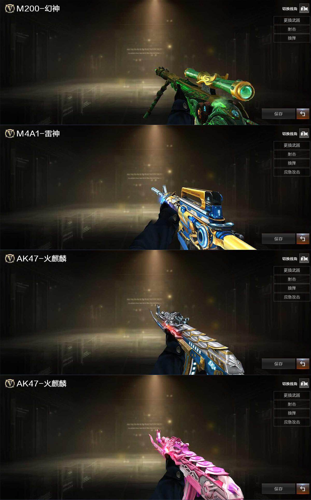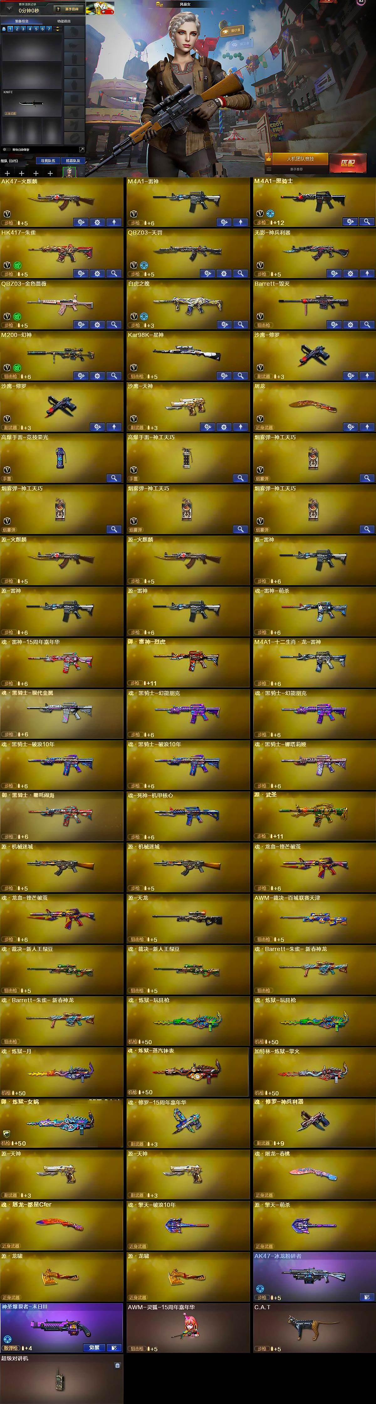 【英雄级武器】:AK47-火麒麟,M4A1-雷神,M4A1-黑骑士,HK417-朱雀,QBZ03-天罚,无影-神兵利器,QBZ03-金色蔷薇,白虎之魄-觉醒版,Barrett-毁灭,M200-幻神,Kar98K-星神,沙鹰-修罗*2,沙鹰-天神,屠龙,高爆手雷-竞技荣光,高爆手雷-神工天巧,烟雾弹-神工天巧*4