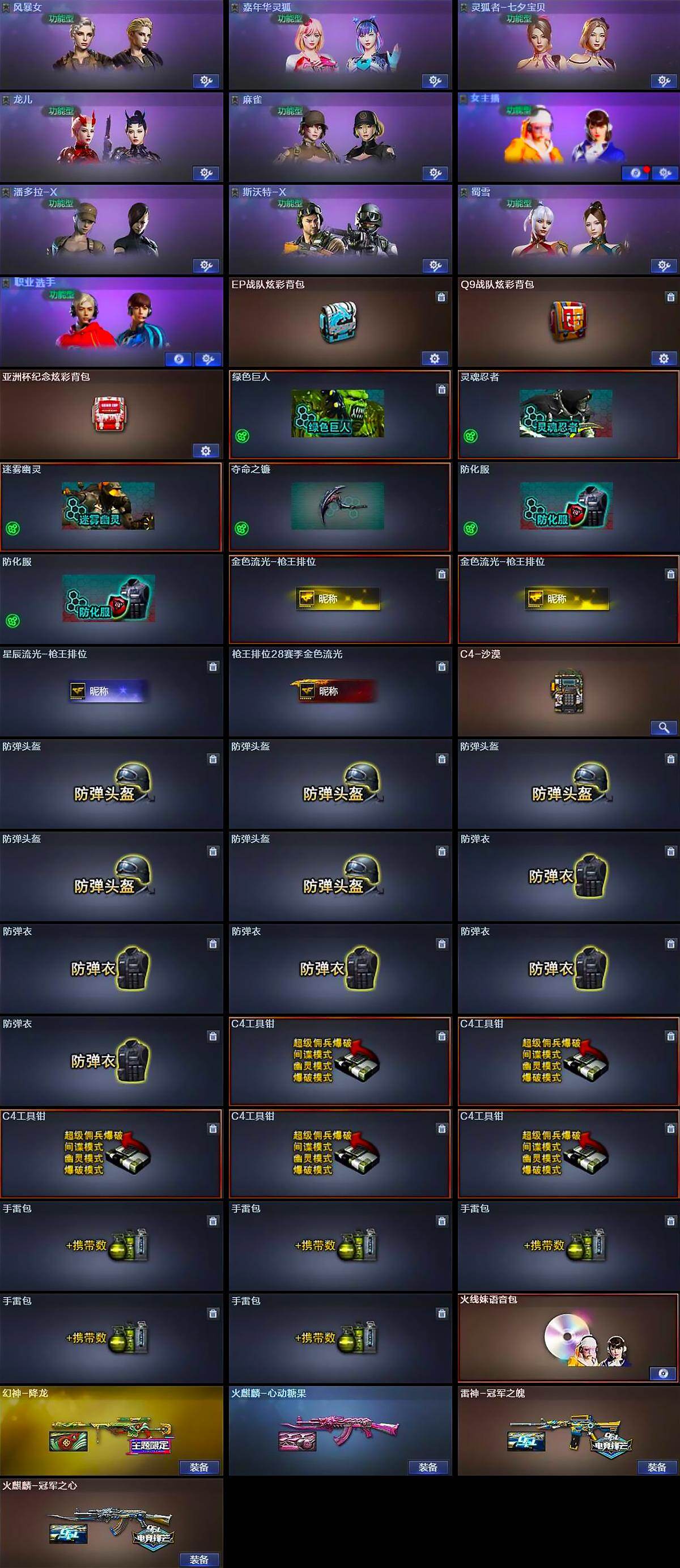 【道具】:EP战队炫彩背包,Q9战队炫彩背包,亚洲杯纪念炫彩背包,绿色巨人,灵魂忍者,迷雾幽灵,夺命之镰,防化服*2,金色流光-枪王排位*2,星辰流光-枪王排位,枪王排位28赛季金色流光,C4-沙漠,防弹头盔*5,防弹衣*5,C4工具钳*5,手雷包*5