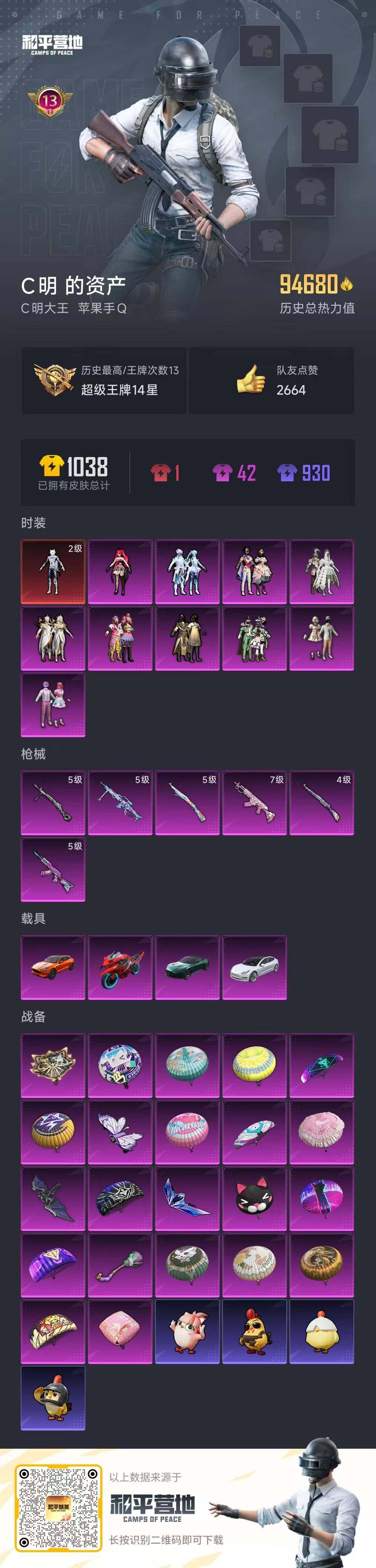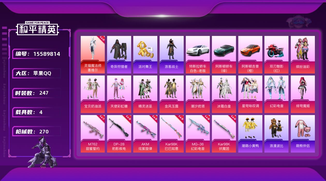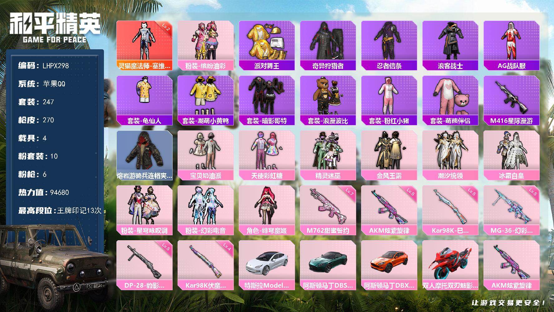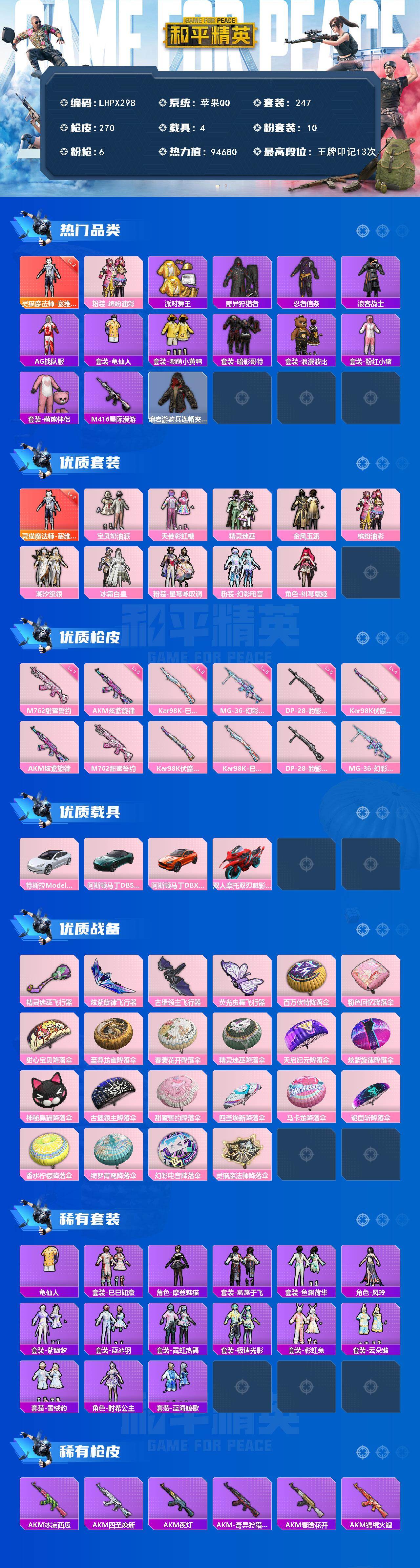 [15589814]【特价出售/店主推荐】苹果 手Q-1神装-10粉装-6特效枪-4载具-4粉色飞行器-94680热力值-13王牌印记-247套装-270枪皮