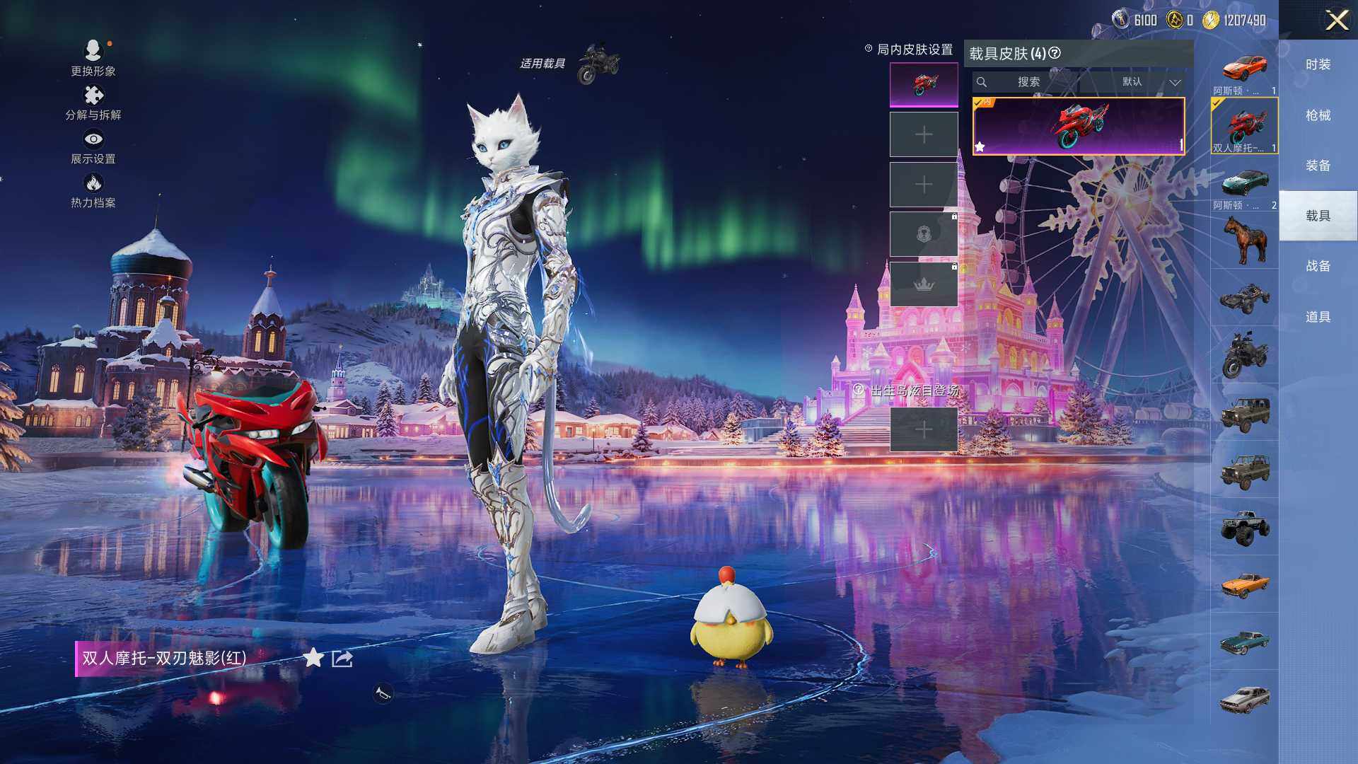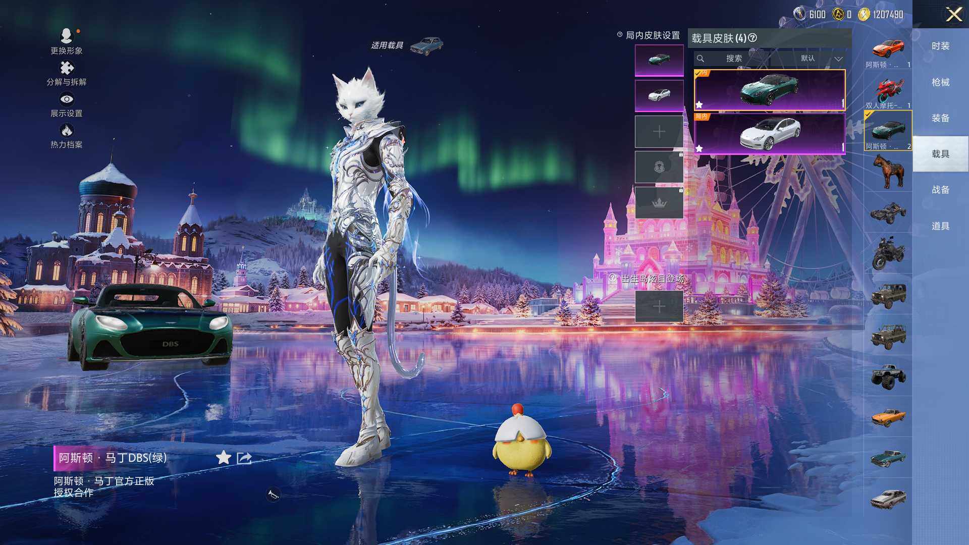 【粉色载具】:特斯拉Model 3(珍珠白),阿斯顿马丁DBS(绿),阿斯顿马丁DBX(橙),双人摩托-双刃魅影(红)