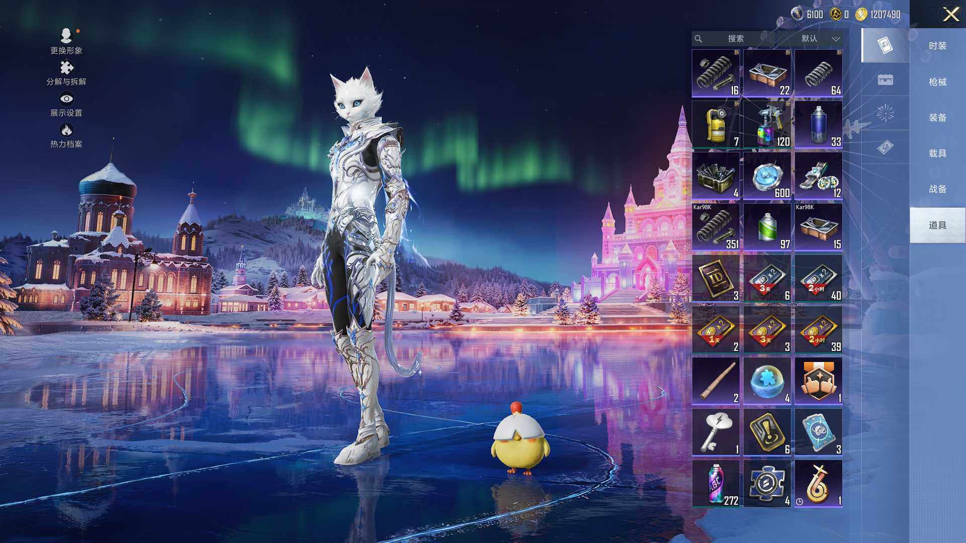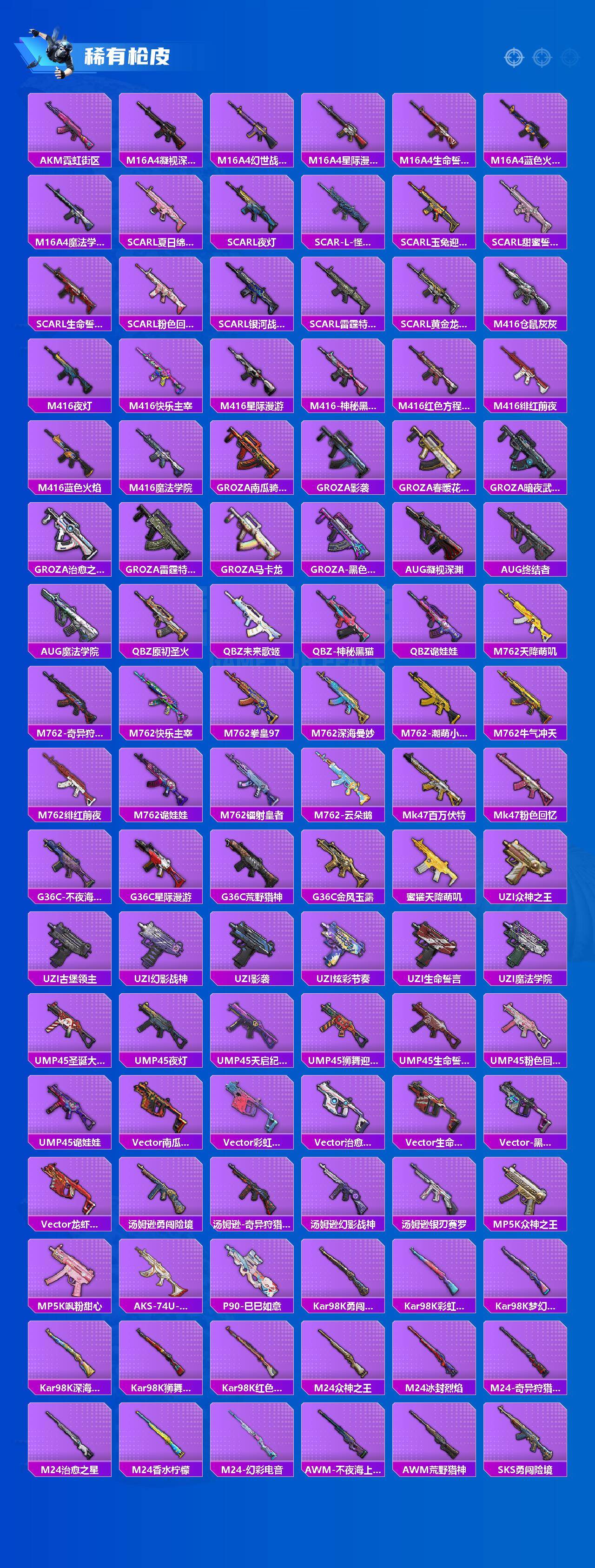 M416-星际漫游,AKM-奇异狩猎者,SCAR-L-粉色回忆,M416-仓鼠灰灰,M416-快乐主宰,M416-魔法学院,AUG-魔法学院,M762-奇异狩猎者,M762-潮萌小黄鸭,Kar98K-深海曼妙,M24-香水柠檬,M24-奇异狩猎者,S686-奇异狩猎者