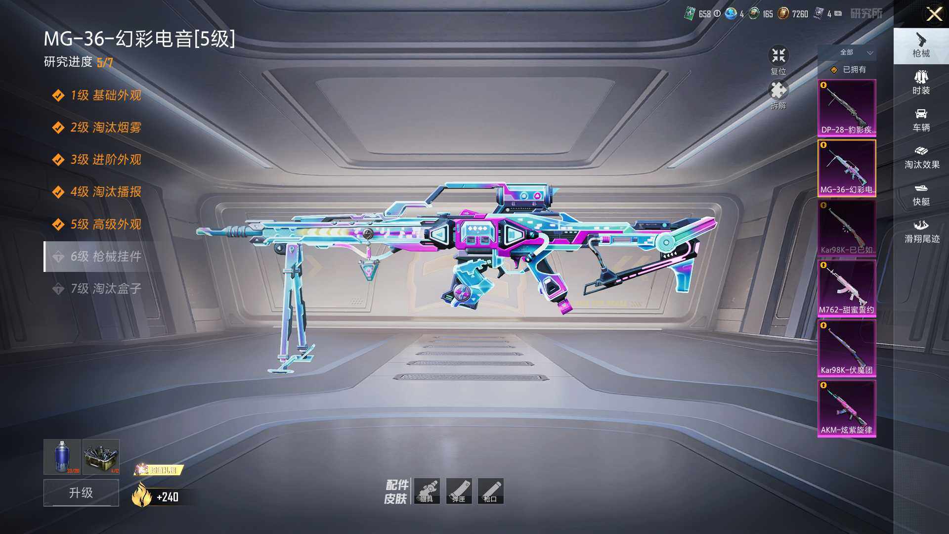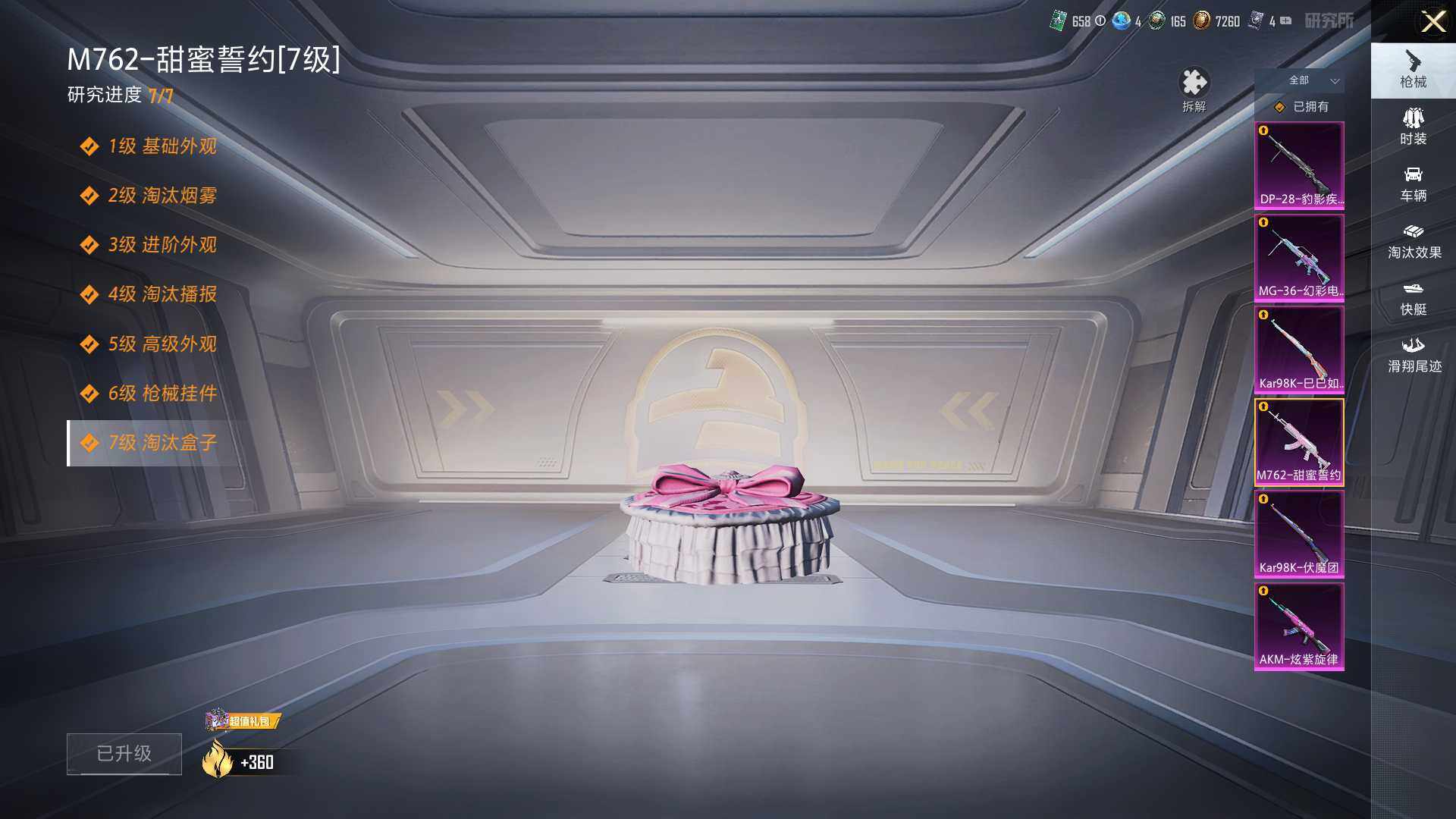 【粉色枪皮等级】:AKM-炫紫旋律(五级),M762-甜蜜誓约(七级),Kar98K-伏魔团(四级),Kar98K-巳巳如意(五级),DP-28-豹影疾电(五级),MG-36-幻彩电音(五级)