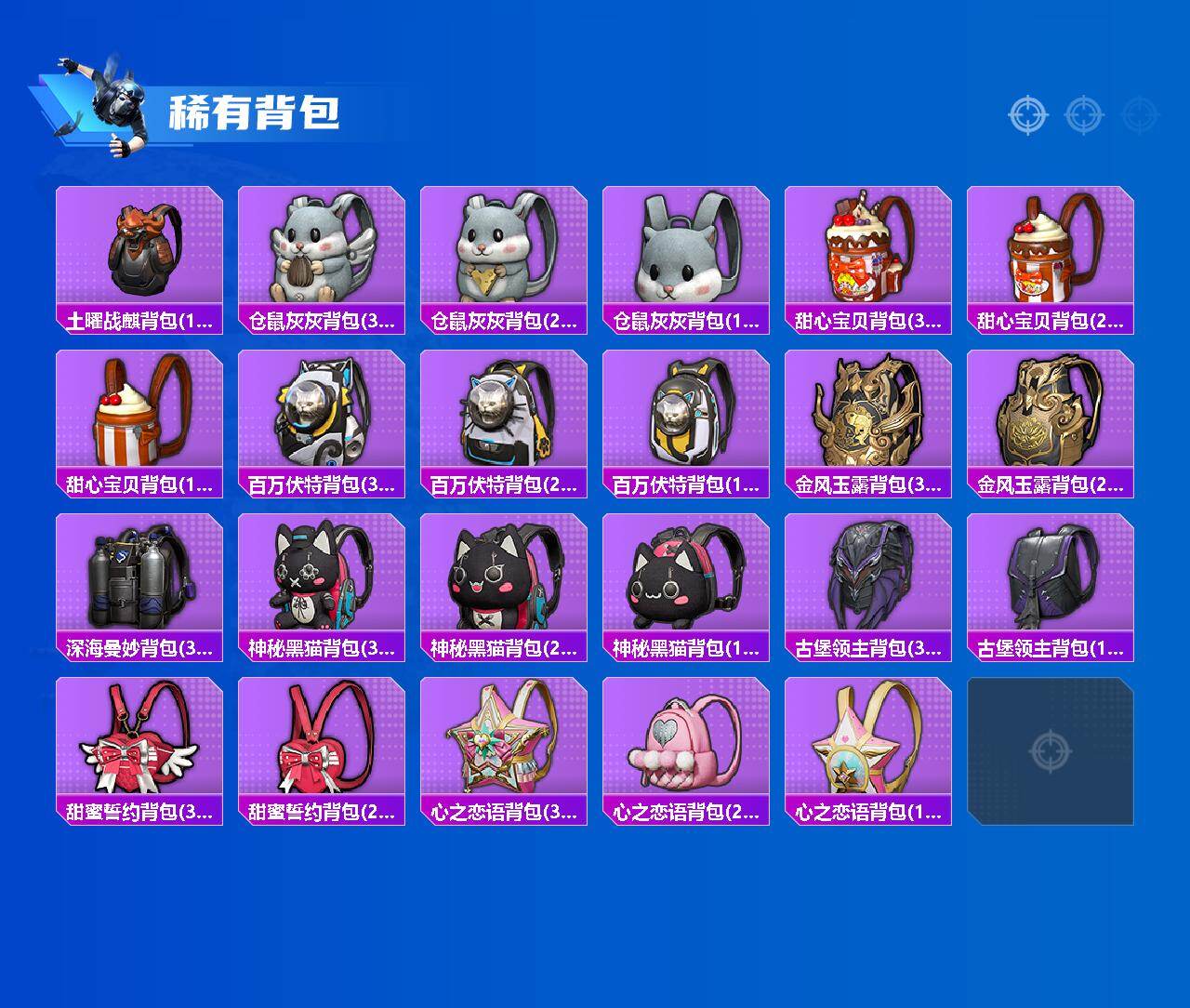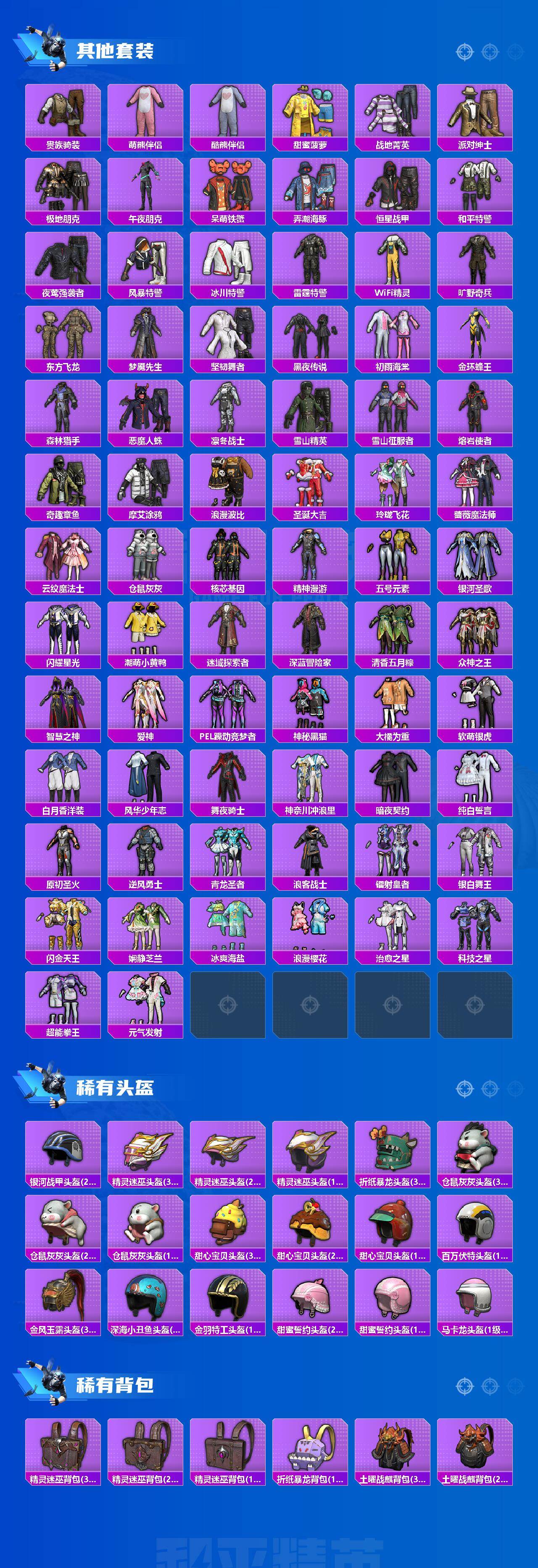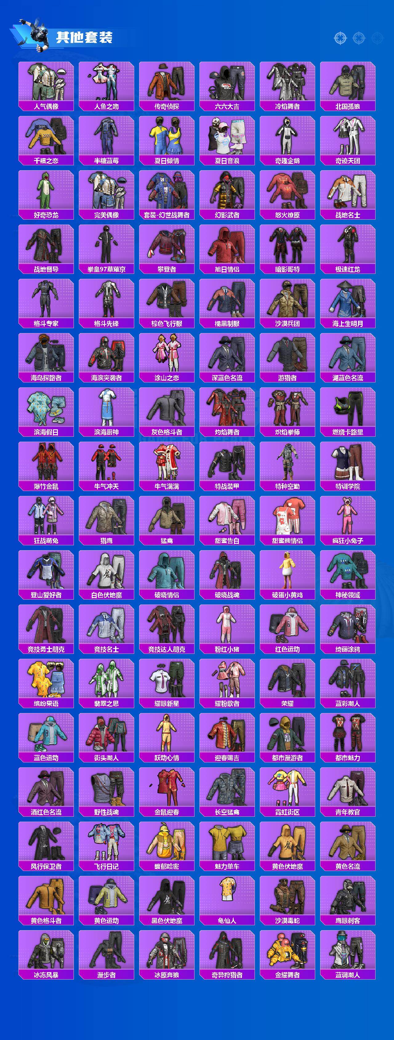 套装-缤纷油彩,套装-派对舞王,套装-奇异狩猎者,套装-浪客战士,套装-潮萌小黄鸭,套装-浪漫波比,套装-萌熊伴侣,套装-宝贝奶油派,套装-天使彩虹糖,套装-精灵迷巫,套装-金风玉露,套装-潮汐统领,奇迹天团套装,好奇恐龙套装,套装-鹰眼刺客,酷熊伴侣套装,套装-呆萌铁蟹,套装-东方飞龙,套装-梦魇先生,套装-仓鼠灰灰,套装-神秘黑猫,套装-大橘为重,套装-软萌银虎