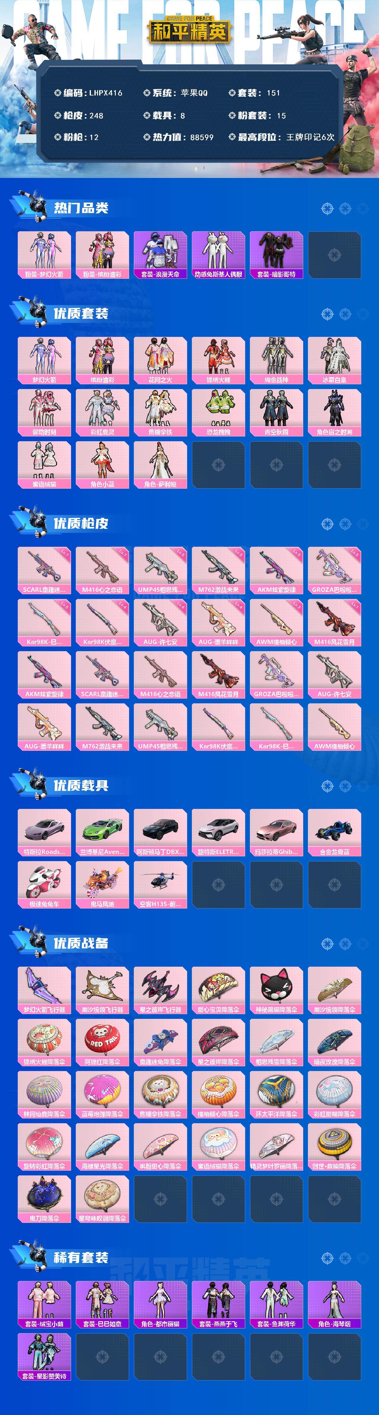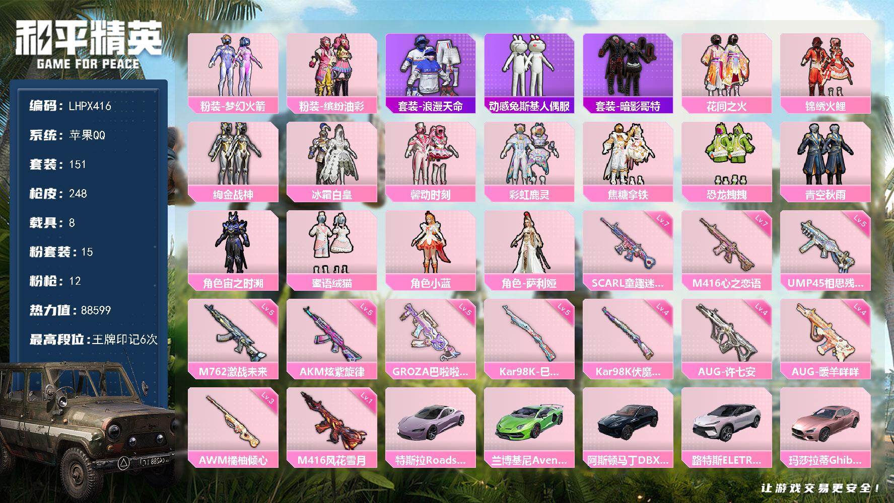 [15590116]【特价出售/店主推荐】苹果 手Q-15粉装-12特效枪-8载具-1僚机-3粉色飞行器-88599热力值-6王牌印记-151套装-248枪皮 【热门品类】:粉装-梦幻火箭,粉装-缤纷油彩,套装-浪漫天命,套装-动感兔斯基人偶服,套装-暗影哥特 【粉色套装】:粉装-梦幻火箭,粉装-缤纷油彩,粉装-花间之火,粉装-锦绣火鲤,粉装-绚金战神,粉装-冰霜白皇,粉装-馨动时刻,粉装-彩虹鹿灵,粉装-焦糖拿铁,粉装-恐龙拽拽,粉装-青空秋雨,角色-宙之时溯,粉装-蜜语绒猫,角色-小蓝,角色-萨利娅 【粉色枪皮等级】:AKM-炫紫旋律(五级),SCAR-L-童趣迷兔(七级),M416-心之恋语(七级),M416-风花雪月(一级),GROZA-巴啦啦小魔仙(五级),AUG-许七安(四级),AUG-暖羊咩咩(四级),M762-激战未来(五级),UMP45-相思残雪(五级),Kar98K-伏魔团(四级),Kar98K-巳巳如意(五级),AWM-橘柚倾心(三级) 【粉色载具】:特斯拉Roadster(沁心粉),兰博基尼Aventador SVJ(翡翠绿),阿斯顿马丁DBX(蓝),路特斯ELETRE(花绽灰),玛莎拉蒂Ghibli(粉),合金龙骨(蓝),极速兔兔车,鬼马风驰,空客H135-蔚蓝之翼 【粉色枪皮】:AKM-炫紫旋律,SCAR-L-童趣迷兔,M416-心之恋语,M416-风花雪月,GROZA-巴啦啦小魔仙,AUG-许七安,AUG-暖羊咩咩,M762-激战未来,UMP45-相思残雪,Kar98K-伏魔团,Kar98K-巳巳如意,AWM-橘柚倾心 【粉色飞行器】:梦幻火箭飞行器,潮汐统领飞行器,星之彼岸飞行器 【粉色降落伞】:甜心宝贝降落伞,神秘黑猫降落伞,潮汐统领降落伞,锦绣火鲤降落伞,阿狸红降落伞,童趣迷兔降落伞,星之彼岸降落伞,相思残雪降落伞,暗夜玫瑰降落伞,林间仙鹿降落伞,蓝莓炮弹降落伞,焦糖拿铁降落伞,橘柚倾心降落伞,环太平洋降落伞,彩虹甜喵降落伞,旋转彩虹降落伞,海螺星光降落伞,飒粉甜心降落伞,蜜语绒猫降落伞,精灵梦叶罗丽降落伞,创世·救赎降落伞,鬼刀降落伞,星穹咏叹调降落伞 【稀有套装】:套装-绒宝小鹅,套装-巳巳如意,角色-都市丽猫,套装-燕燕于飞,套装-鱼渊荷华,角色-海琴烟,套装-星影赞美诗 【稀有枪皮】:AKM-四圣焕新,AKM-夜灯,AKM-彩虹符号,AKM