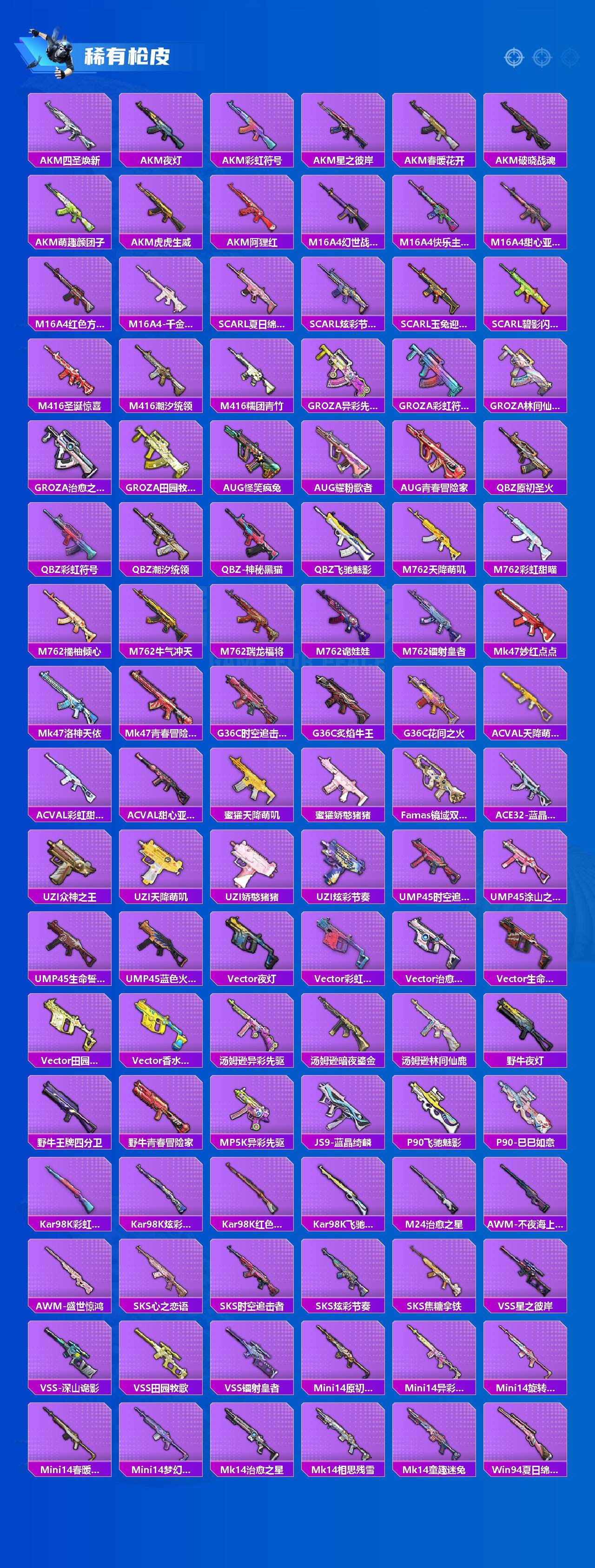 AKM-炫紫旋律,SCAR-L-童趣迷兔,M416-心之恋语,M416-风花雪月,GROZA-巴啦啦小魔仙,AUG-许七安,AUG-暖羊咩咩,M762-激战未来,UMP45-相思残雪,Kar98K-伏魔团,Kar98K-巳巳如意,AWM-橘柚倾心