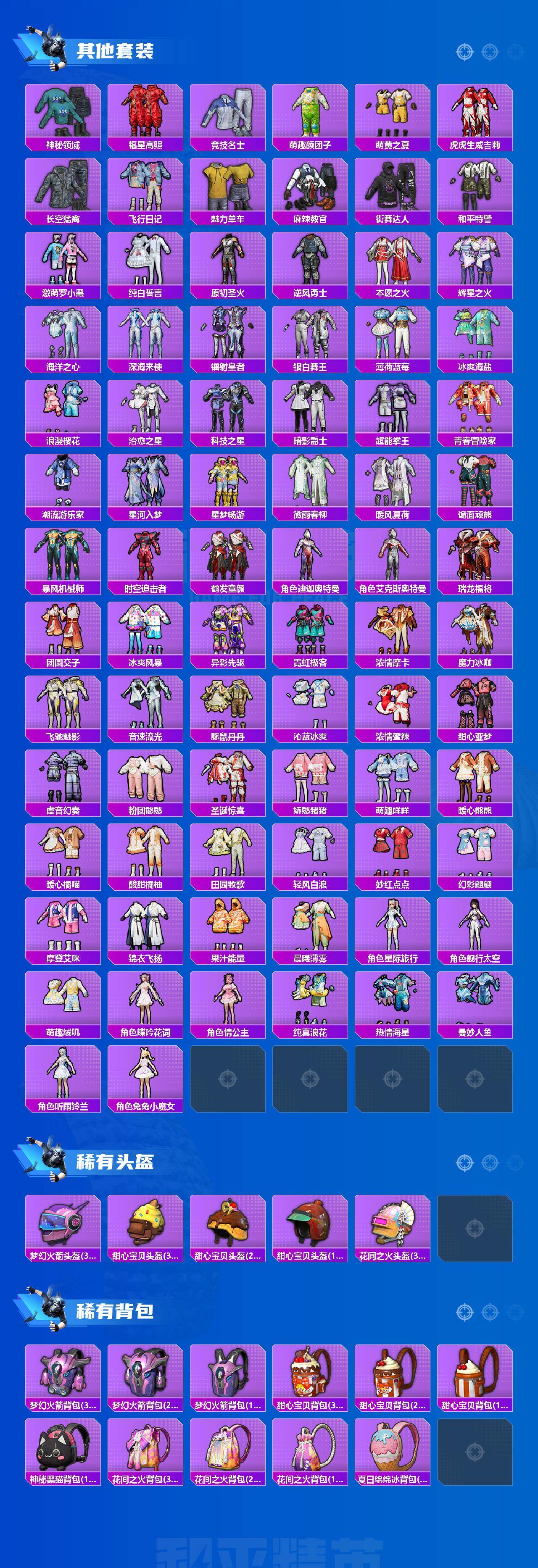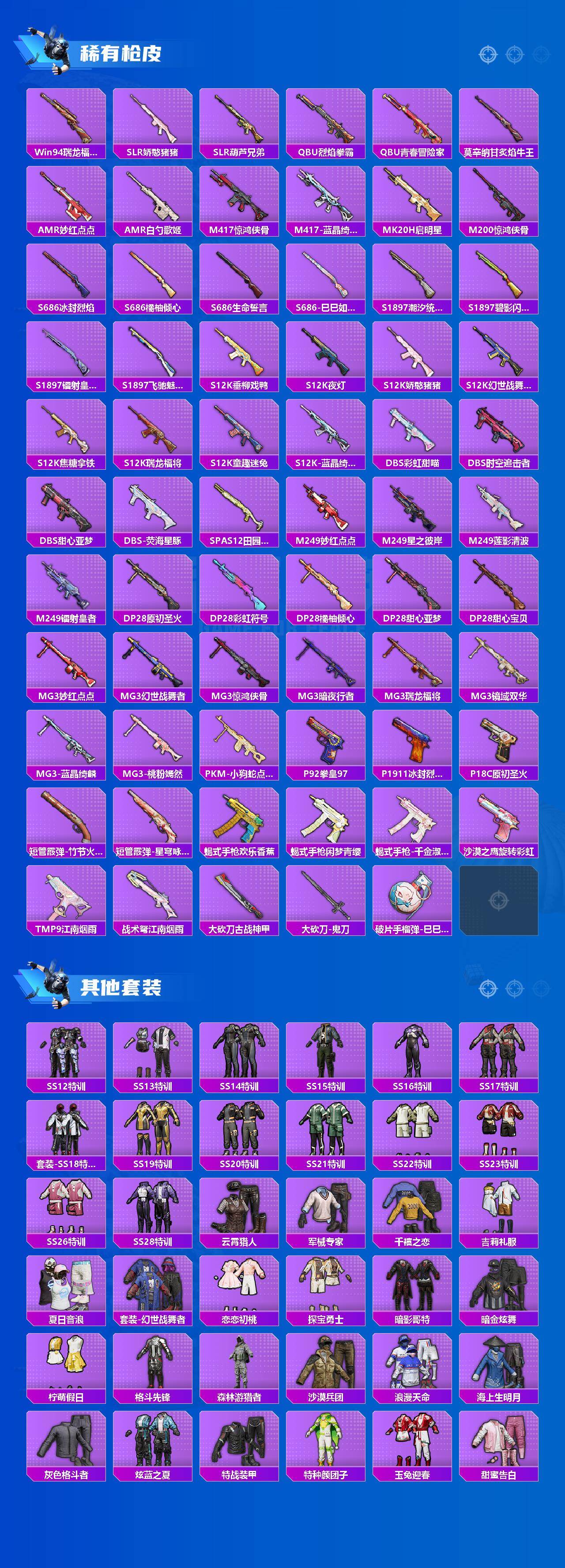 - [11938230]1粉装 4特效枪 17印记 可二次 可修改实名 身法装备:暗影哥特(红眼罩) 优质装备:M416五爪金龙,七级M416-五爪金龙,MK12-雪月幻音,荧海星豚,Kar98K-巳巳如意 热门装扮:激萌罗小黑 稀有枪皮:DP-28-豹影疾电 五级特效枪:五级Kar98K-巳巳如意,五级DP-28-豹影疾电,五级MK12-雪月幻音 紫色装扮:田园牧歌,轻风白浪,和煦暖阳,SS22特训,SS23特训,娇憨猪猪,萌趣咩咩,SS21特训,SS31特训套装,人气偶像,六六大吉,冰川特警,冷焰舞者,刚毅裁决者,旭日情侣,SS30特训套装,SS33特训套装,顶瓜瓜,SS20特训,潮流游乐家,SS15特训,时空追击者,暴风机械师,SS16特训,SS14特训,萌趣颜团子,特种颜团子,猎梦纪元,SS19特训,甜心亚梦,虚音幻奏,电音精灵,瑞龙福将,团圆交子,SS17特训,炫光向阳,异彩先驱,缤纷焰火,SS18特训,都市魅力,酒红色名流,长空猛禽,霓虹极客,霓虹街区,青年教官,缤纷果语,耀眼新星,荣耀,蓝彩潮人,蓝色运动,虎虎生威吉莉,街头潮人,超能勇士,飞行日记,骑行爱好者,魅力单车,鹤鸣,麻辣教官,黄色伏地魔,黄色名流,黄色运动,黑色伏地魔,龙的传人,龟仙人,冰河战士,龙魂突击队,蝶变,香桃花海,沙漠毒蛇,极地朋克,极速红龙,柠萌假日,格斗先锋,沙漠兵团,海岛探路者,深蓝色名流,暗黑骑手,滨海假日,幻影武者,夏日音浪,夜莺强袭者,完美偶像,帅气教官,幻世战舞者,战地督导,探宝勇士,湖蓝色名流,滨海厨神,绮丽涂鸦,白熊同盟,白色伏地魔,破晓战魂,破蛋小黄鸡,福星高照,空岛之星,空投萌叽,竞技达人朋克,红色运动,甜蜜熊情侣,王牌教练,牛气冲天,灼焰舞者,炫蓝之夏,热血青春,牛气满满,猛禽,特战英豪,特殊使命,特训学院,狂战萌兔,狂沙舞者,猎鹰,SS29特训,星途旅人,白光莹,SS28特训,异域银装,玉兔迎春,竞技名士,暗影哥特(红眼罩),街头风暴,惊鸿侠骨,SS24特训(SS24特训套装),SS25特训,冥星暗影,锦衣飞扬,SS27特训,金羽特工,浪漫天命,星河浪客,SS26特训,精神漫游,智慧之神,耀粉歌者,春日漫步,SS32特训服(SS32特训套装),青玉碎影,绯格组合,萌黄之夏,恋语绒绒,漫步者,金耀舞者,冰原奔狼,光之冒险,海上生明月 优质战备:星途旅人降落伞,冷漠罗丽降落伞,未来