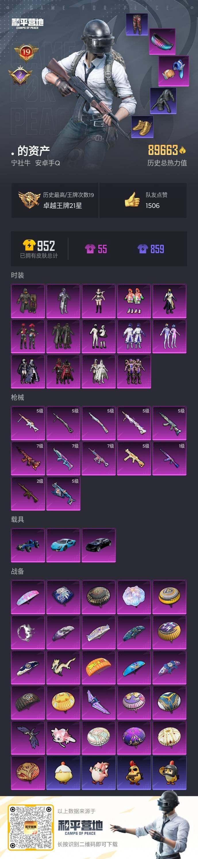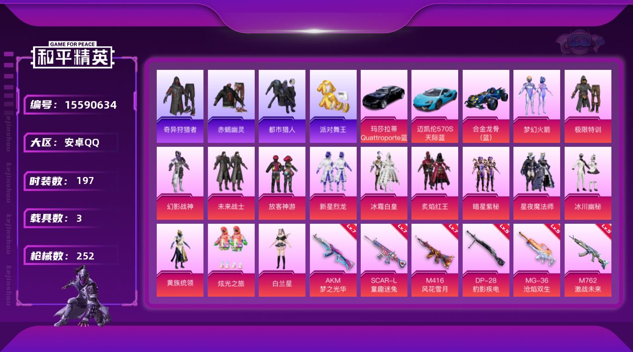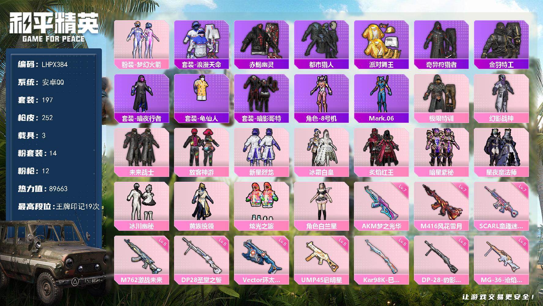 [15590634]安卓 手Q-14粉装-12特效枪-3载具-5粉色飞行器-89663热力值-19王牌印记-197套装-252枪皮