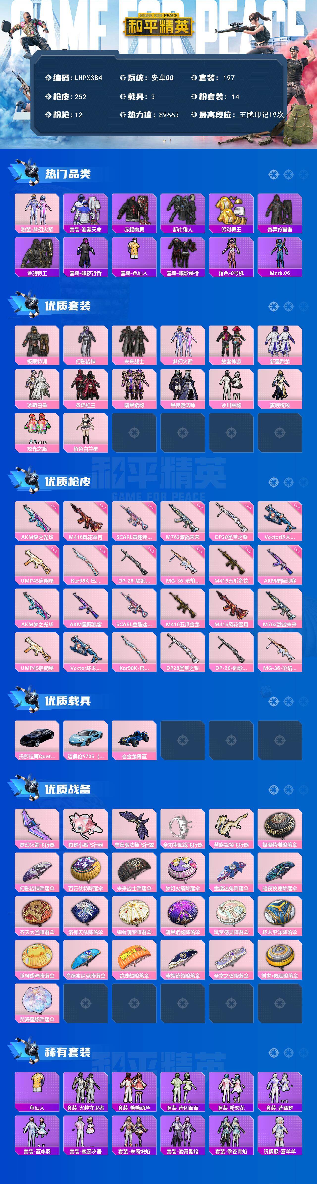 [15590634]安卓 手Q-14粉装-12特效枪-3载具-5粉色飞行器-89663热力值-19王牌印记-197套装-252枪皮 【热门品类】:粉装-梦幻火箭,套装-浪漫天命,套装-赤蝎幽灵,套装-都市猎人,套装-派对舞王,套装-奇异狩猎者,套装-金羽特工,套装-暗夜行者,套装-龟仙人,套装-暗影哥特,角色-8号机,角色-Mark.06 【粉色套装】:粉装-极限特训,粉装-幻影战神,粉装-未来战士,粉装-梦幻火箭,粉装-放客神游,粉装-新星烈龙,粉装-冰霜白皇,粉装-炙焰红王,粉装-暗星紫秘,粉装-星夜魔法师,粉装-冰川幽秘,粉装-黄族统领,粉装-炫光之旅,角色-白兰星 【粉色枪皮等级】:AKM-梦之光华(七级),AKM-星际浪客(一级),SCAR-L-童趣迷兔(七级),M416-五爪金龙(二级),M416-风花雪月(七级),M762-激战未来(五级),UMP45-启明星(五级),Vector-环太平洋(五级),Kar98K-巳巳如意(五级),DP-28-圣堂之誓(五级),DP-28-豹影疾电(五级),MG-36-沧焰双生(五级) 【粉色载具】:玛莎拉蒂Quattroporte(夜幕蓝),迈凯伦570S(天际蓝),合金龙骨(蓝) 【粉色枪皮】:AKM-梦之光华,AKM-星际浪客,SCAR-L-童趣迷兔,M416-五爪金龙,M416-风花雪月,M762-激战未来,UMP45-启明星,Vector-环太平洋,Kar98K-巳巳如意,DP-28-圣堂之誓,DP-28-豹影疾电,MG-36-沧焰双生 【粉色飞行器】:梦幻火箭飞行器,甜梦小狐飞行器,星夜魔法师飞行翼,全功率超战飞行器,黄族统领飞行器 【粉色降落伞】:极限特训降落伞,幻影战神降落伞,百万伏特降落伞,未来战士降落伞,梦幻火箭降落伞,童趣迷兔降落伞,暗夜玫瑰降落伞,齐天大圣降落伞,洛神天依降落伞,绚金瑰梦降落伞,暗星紫秘降落伞,筑梦精灵降落伞,环太平洋降落伞,垂柳戏鸭降落伞,音爆索尼克降落伞,龙珠超降落伞,黄族统领降落伞,圣堂之誓降落伞,创世·救赎降落伞,荧海星豚降落伞,炫彩糖果降落伞 【稀有套装】:套装-龟仙人,套装-火种守卫者,套装-糖糖葫芦,套装-青团波波,套装-粉恋花,套装-紫幽梦,套装-蓝冰羽,套装-蜜露汐语,套装-朱霞炽焰,套装-凌霄紫焰,套装-擎苍青焰,玩偶服-喜羊羊 【稀有枪皮】:AKM-彩虹符号,AKM-影袭,A