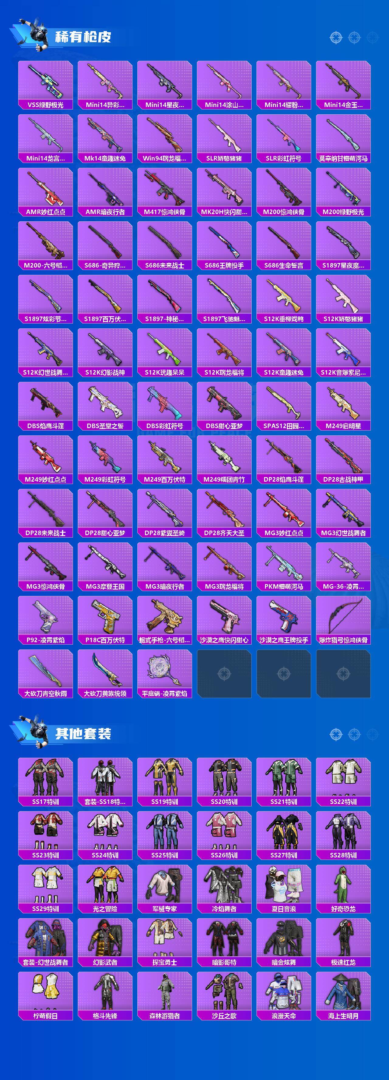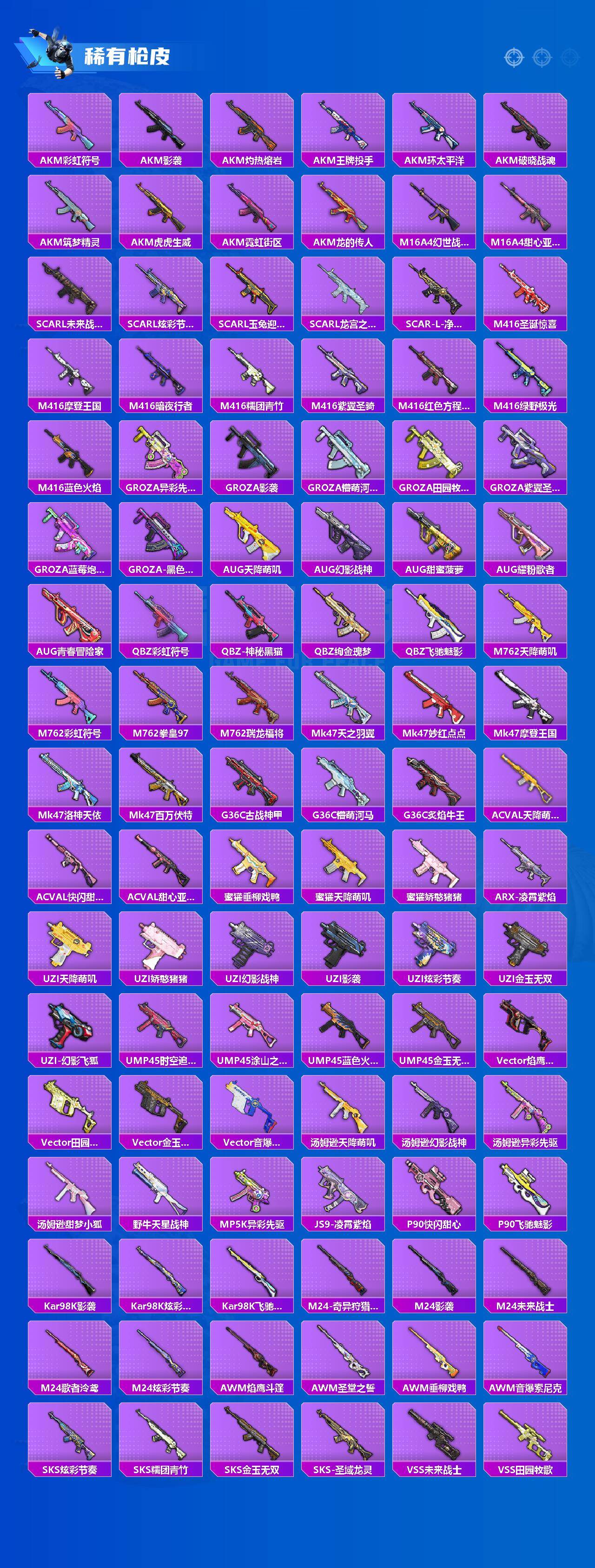 AKM-梦之光华,AKM-星际浪客,SCAR-L-童趣迷兔,M416-五爪金龙,M416-风花雪月,M762-激战未来,UMP45-启明星,Vector-环太平洋,Kar98K-巳巳如意,DP-28-圣堂之誓
