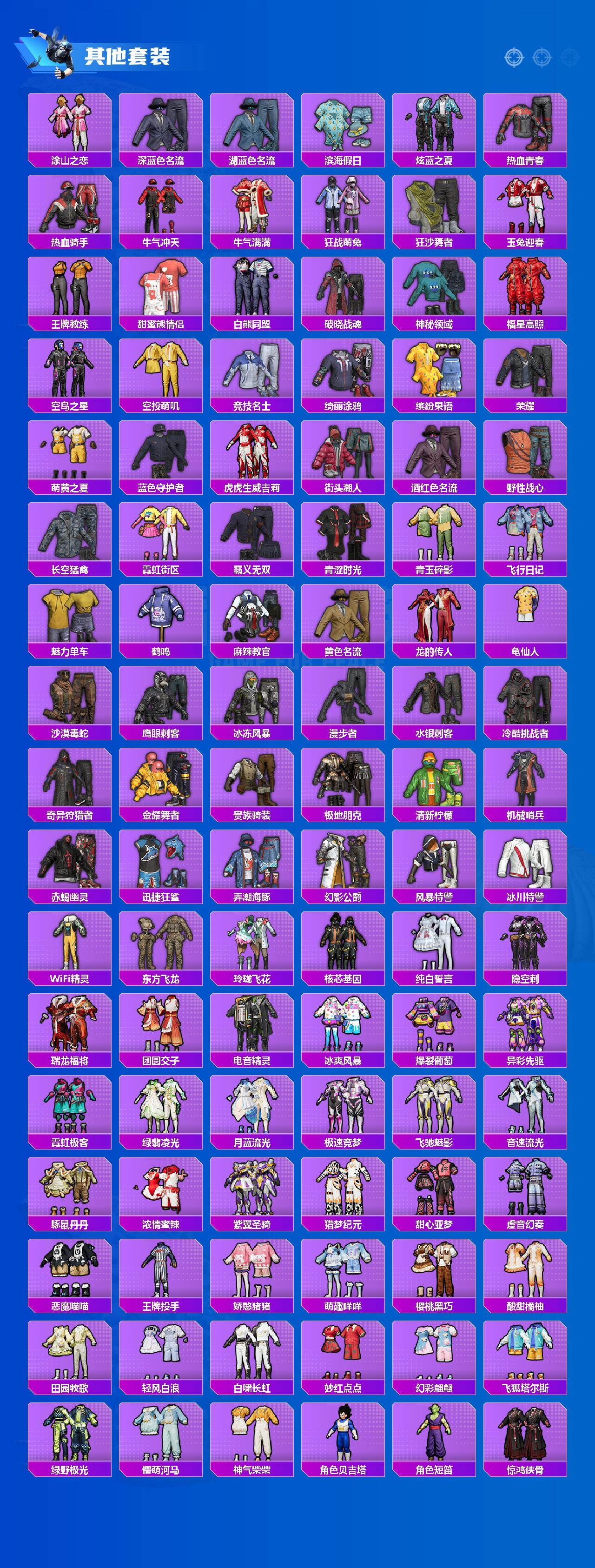 【粉色套装】:粉装-极限特训,粉装-幻影战神,粉装-未来战士,粉装-梦幻火箭,粉装-放客神游,粉装-新星烈龙,粉装-冰霜白皇,粉装-炙焰红王,粉装-暗星紫秘,粉装-星夜魔法师,粉装-冰川幽秘,粉装-黄族统领,粉装-炫光之旅,角色-白兰星