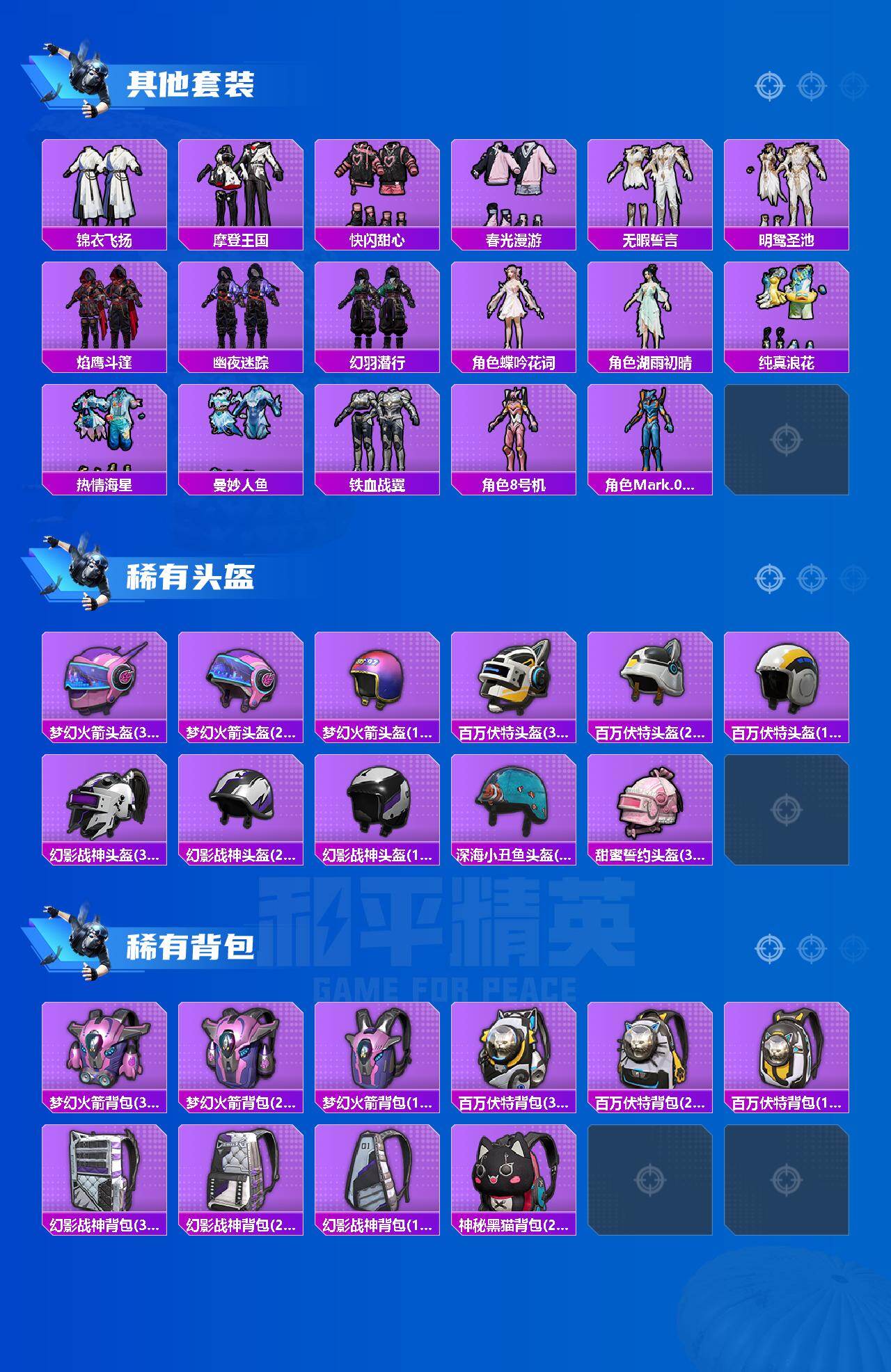 【热门品类】:粉装-梦幻火箭,套装-浪漫天命,套装-赤蝎幽灵,套装-都市猎人,套装-派对舞王,套装-奇异狩猎者,套装-金羽特工,套装-暗夜行者,套装-龟仙人,套装-暗影哥特,角色-8号机,角色-Mark.06