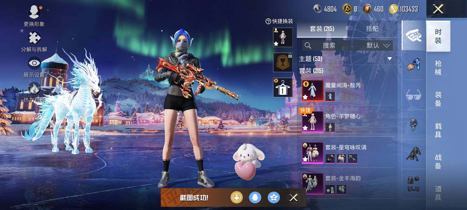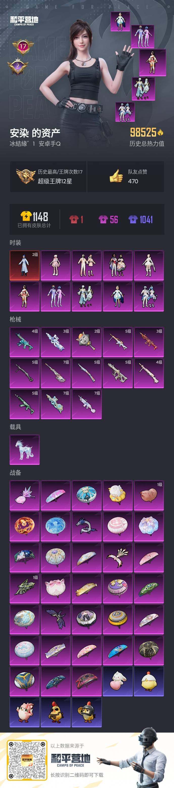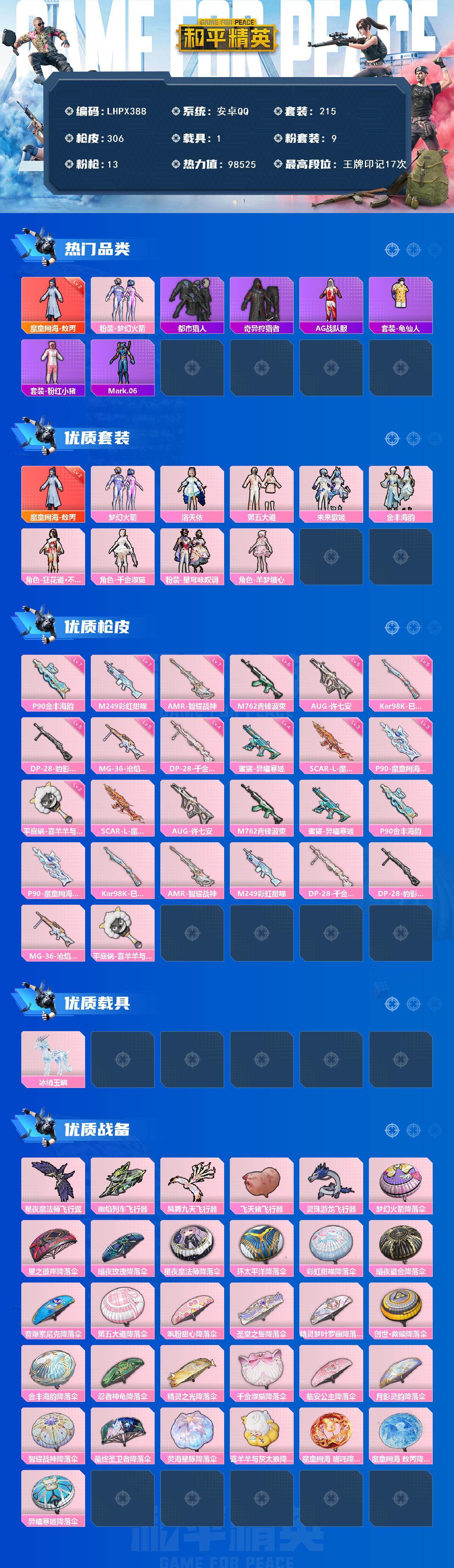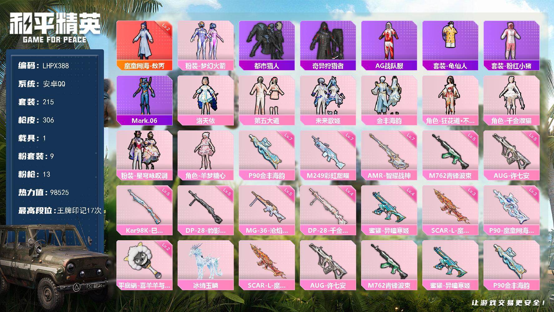 [15590609]安卓 手Q-1神装-9粉装-13特效枪-1载具-6粉色飞行器-98525热力值-17王牌印记-215套装-306枪皮