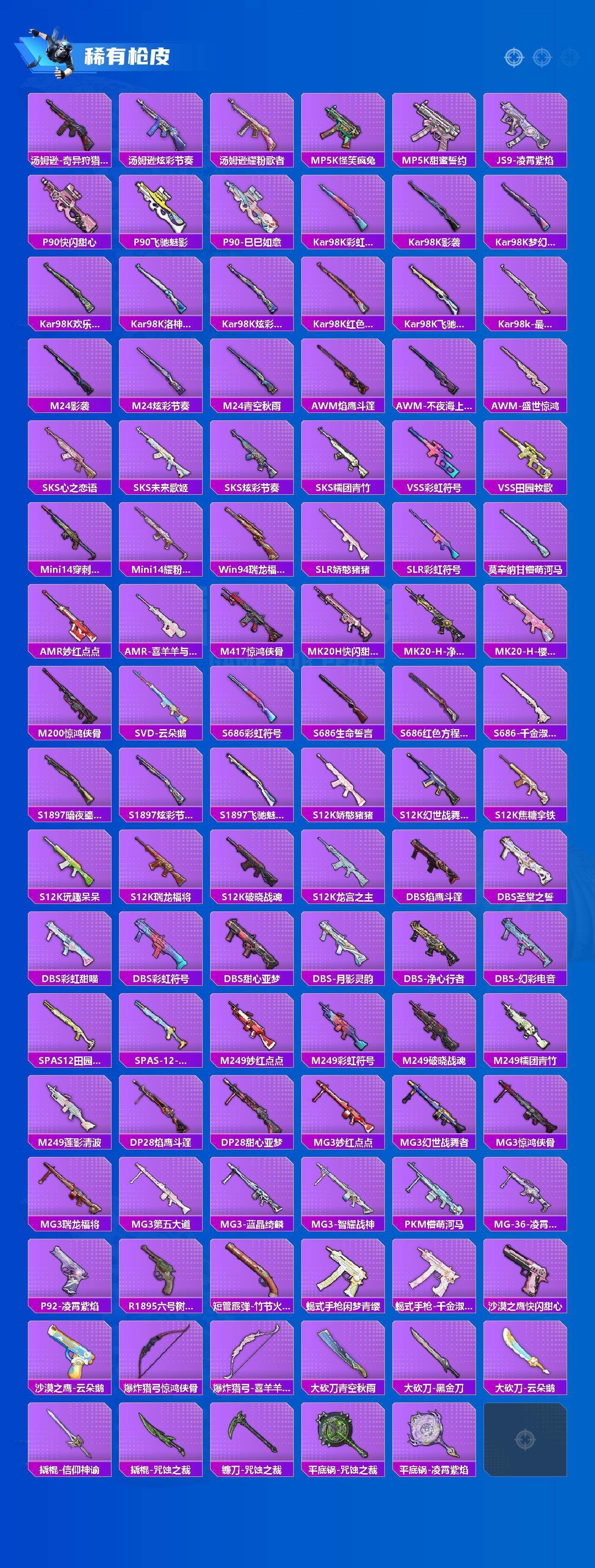 【粉色枪皮等级】:SCAR-L-魔童闹海 哪吒(三级),AUG-许七安(五级),M762-青锋波束(五级),蜜獾-异瞳寒姬(四级),P90-金丰海韵(七级),P90-魔童闹海 敖丙(三级),Kar98K-巳巳如意(五级),AMR-智耀战神(七级),M249-彩虹甜喵(七级),DP-28-千金淑猫(四级),DP-28-豹影疾电(五级),MG-36-沧焰双生(五级),平底锅-喜羊羊与灰太狼(二级)