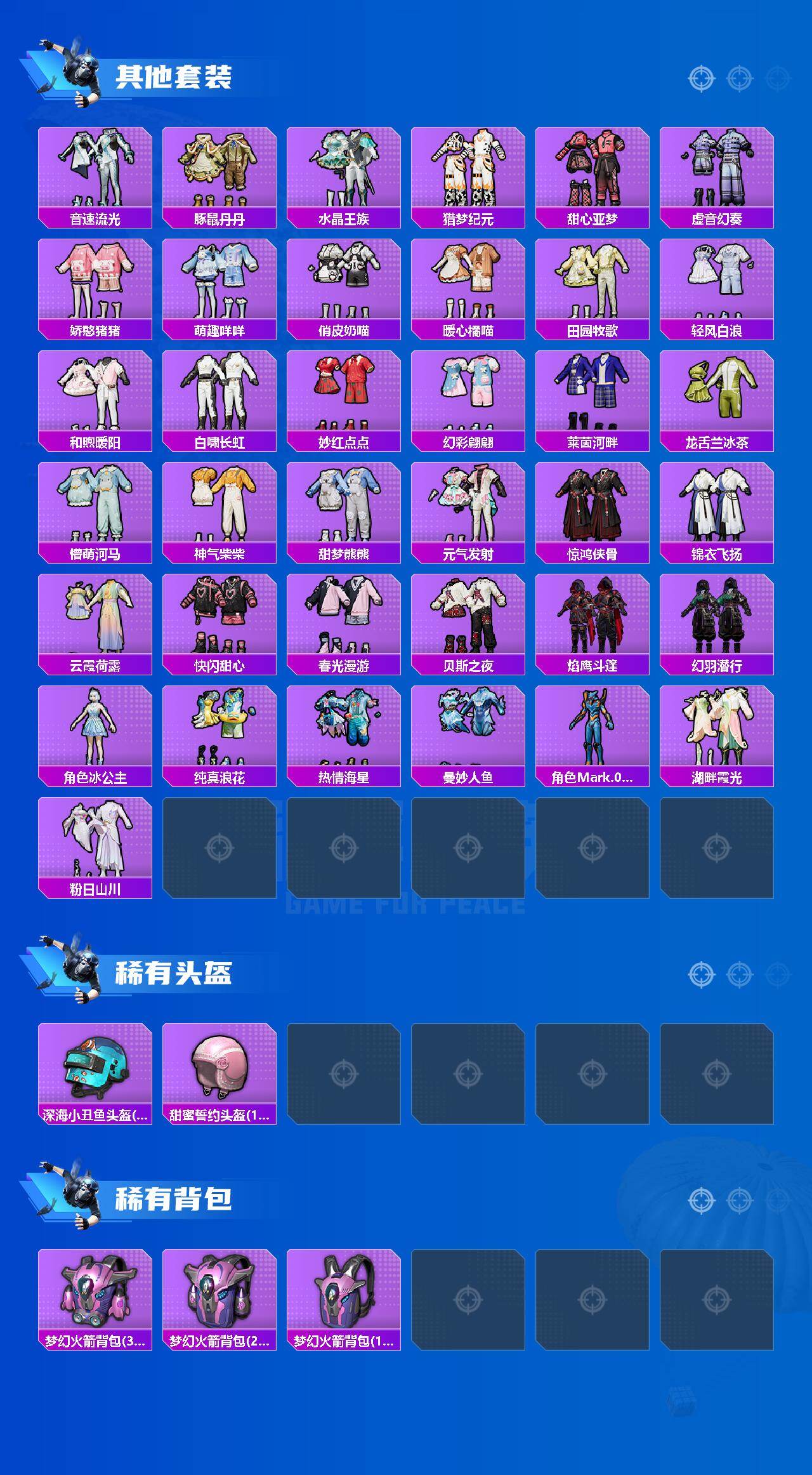 [15590609]安卓 手Q-1神装-9粉装-13特效枪-1载具-6粉色飞行器-98525热力值-17王牌印记-215套装-306枪皮 【红色神装等级】:魔童闹海-敖丙(二级) 【红色角色神装】:魔童闹海-敖丙 【热门品类】:粉装-梦幻火箭,套装-都市猎人,套装-奇异狩猎者,套装-AG战队服,套装-龟仙人,套装-粉红小猪,角色-Mark.06 【粉色套装】:粉装-梦幻火箭,角色-洛天依,粉装-第五大道,粉装-未来歌姬,粉装-金丰海韵,角色-狂花道·不知火舞,角色-千金淑猫,粉装-星穹咏叹调,角色-羊梦糖心 【粉色枪皮等级】:SCAR-L-魔童闹海 哪吒(三级),AUG-许七安(五级),M762-青锋波束(五级),蜜獾-异瞳寒姬(四级),P90-金丰海韵(七级),P90-魔童闹海 敖丙(三级),Kar98K-巳巳如意(五级),AMR-智耀战神(七级),M249-彩虹甜喵(七级),DP-28-千金淑猫(四级),DP-28-豹影疾电(五级),MG-36-沧焰双生(五级),平底锅-喜羊羊与灰太狼(二级) 【粉色载具】:冰绡玉鳞 【粉色枪皮】:SCAR-L-魔童闹海 哪吒,AUG-许七安,M762-青锋波束,蜜獾-异瞳寒姬,P90-金丰海韵,P90-魔童闹海 敖丙,Kar98K-巳巳如意,AMR-智耀战神,M249-彩虹甜喵,DP-28-千金淑猫,DP-28-豹影疾电,MG-36-沧焰双生,平底锅-喜羊羊与灰太狼 【粉色飞行器】:星夜魔法师飞行翼,幽焰列车飞行器,凤舞九天飞行器,飞天猪飞行器,灵珠游龙飞行器 【粉色降落伞】:梦幻火箭降落伞,星之彼岸降落伞,暗夜玫瑰降落伞,星夜魔法师降落伞,环太平洋降落伞,彩虹甜喵降落伞,暗夜鎏金降落伞,音爆索尼克降落伞,第五大道降落伞,飒粉甜心降落伞,圣堂之誓降落伞,精灵梦叶罗丽降落伞,创世·救赎降落伞,金丰海韵降落伞,忍者神龟降落伞,精灵之光降落伞,千金淑猫降落伞,临安公主降落伞,月影灵韵降落伞,智耀战神降落伞,最终圣卫者降落伞,荧海星豚降落伞,喜羊羊与灰太狼降落伞,魔童闹海 哪吒降落伞,魔童闹海 敖丙降落伞,异瞳寒姬降落伞,炫彩糖果降落伞 【稀有套装】:套装-龟仙人,套装-小鸟芋圆,套装-雏菊兔兔,套装-萝兰蝴蝶,套装-小熊娃娃,套装-糖糖葫芦,套装-青团波波,套装-棉花软糖,角色-都市丽猫,角色-摩登魅猫,角色-许七安,角色-怀庆长公主,套装-黑曜寓言