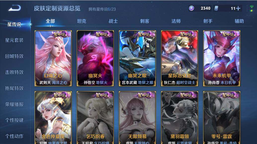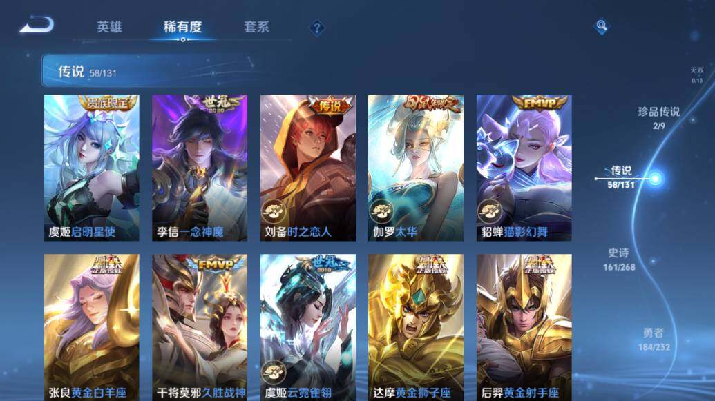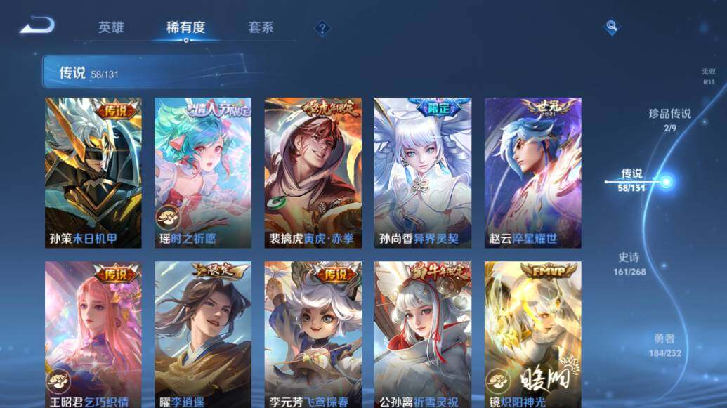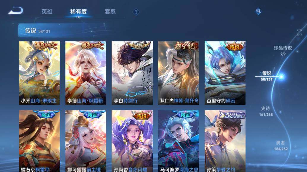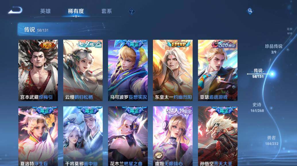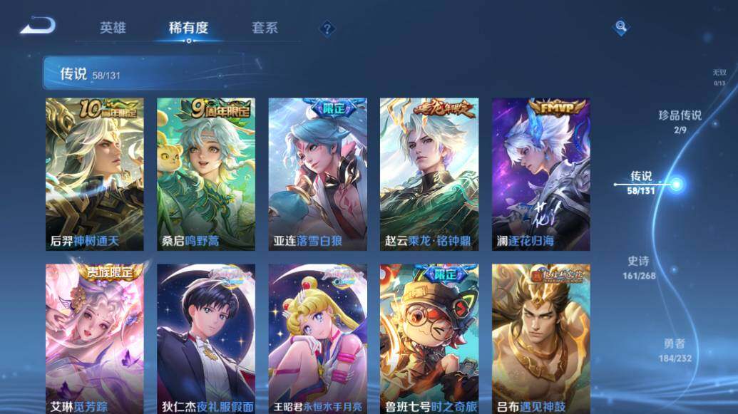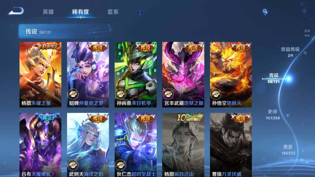 【传说皮肤】:后羿神树通天,桑启鸣野蒿,亚连落雪白狼,赵云乘龙铭钟鼎,澜逐花归海,艾琳觅芳踪,狄仁杰夜礼服假面,王昭君永恒水手月亮,鲁班七号时之奇旅,吕布遇见神鼓,宫本武藏惊梅引,云缨鹤归松栖,马可波罗妄想实况,东皇太一灼幽烈阳,亚瑟追逃游戏,夏洛特浮生妄,干将莫邪画中仙,花木兰燃星之曲,虞姬无限倾心,孙悟空齐天大圣,小乔山海琳琅生,李信山海炽霜斩,李白诗剑行,狄仁杰神器狴犴令,百里守约碎云,橘右京枫霜尽,娜可露露前尘镜,孙尚香音你闪耀,马可波罗深海之息,孙策挚爱之约,孙策末日机甲,瑶时之祈愿,裴擒虎寅虎赤拳,孙尚香异界灵契,赵云淬星耀世,王昭君乞巧织情,曜李逍遥 ,李元芳飞鸢探春,公孙离祈雪灵祝,镜炽阳神光,虞姬启明星使,李信一念神魔,刘备时之恋人,伽罗太华,貂蝉猫影幻舞,张良黄金白羊座,干将莫邪久胜战神,虞姬云霓雀翎,达摩黄金狮子座,后羿黄金射手座,杨戬永曜之星,貂蝉仲夏夜之梦,孙尚香末日机甲,宫本武藏地狱之眼,孙悟空地狱火,吕布天魔缭乱,武则天海洋之心,狄仁杰超时空战士