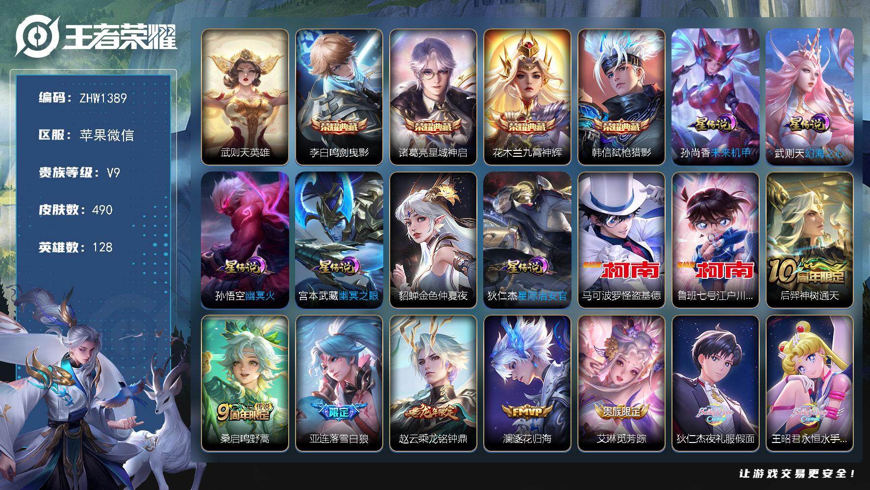 - [12201401]V9 4典藏 3无双 1珍品传说 29传说 127英雄 369皮肤 典藏英雄武则天 可修改实名 优质装备:倪克斯神谕(宇宙婆娘),全息碎影(猴子典藏),九霄神辉(木兰典藏),碎月剑心(李白无双),小乔时之魔女(小乔无双),花合斗,最初的交响(伽罗典藏),器灵·落星盏,云鹰飞将(小将军),绛天战甲(鸡嘴战神),黄金白羊座,仲夏夜之梦(大飞蛾),音你心动-小乔,地狱之眼,音你心动-周瑜,胖达荣荣,时之恋人-刘备(电焊工),游龙清影(小青龙),淬星耀世,花朝如约(花篮子),大乔-时之奇旅,永恒水手月亮,霜月吟,金乌负日 传说皮:乘龙·问璇玑(孙尚香年限),续相思,幻光神枪 珍宝阁皮:胡桃夹子,蔷薇恋人,女武神 限定皮:愿照·九州拓(澜年限),愿照·福禄聚(蔡文姬年限),愿照·岁时盈(虞姬年限),愿照·山河定(司空震年限),愿照·众生和(妲己年限),愿照·千秋盛(女娲年限),鸣野蒿,白虎志(电光耗子),凤求凰(白切鸡),凤凰于飞,白鹤梁神女,神威(电光马子),遇见飞天,高山流水,五谷丰年,冰锋战神,游园惊梦,梁祝,天狼狩猎者,岱宗(典韦年限),逐梦之音,天狼绘梦者,李小龙,逐梦之光,圣诞老人,奇迹圣诞,猪悟能,神奇女侠,美猴王,冰霜神祇 史诗皮:鸭鸭历险记-刘禅,器灵·浮梦炉,化蝶舞,龙之律动,琥珀纪元伽罗,星界战将,石田雨龙,茶境仙,乘龙·忆丹青(大乔年限),百相守梦-黄忠,芈月浮光幕影,蔬乡物语(鲁班七号),曹操夜都魔契,遇见神鹿,紫霞仙子,苍穹之光,黄金分割率,特工魅影,白蛇,江河有灵,百解令(蒙犽),高渐离燃音魔法,蒙恬荣光圣徽,无限星赏官,晚萤,偶像歌手,龙骑士(小龙虾),末日机甲-吕布,猫狗日记-孙策,乱世虎臣,节奏热浪,修罗,女仆咖啡,水果甜心,天才门将,心灵骇客,功夫厨神,德古拉伯爵,暗隐猎兽者,鬼剑武藏,暗渊魔法,心灵战警,舞动绿茵,地狱岩魂,纤云弄巧,繁星吟游(呼啦呼啦),拒霜思,缤纷独角兽,乘风破浪,逐浪之夏,曙光守护者,箭羽风息,金属风暴,原初追逐者,圣诞狂欢,圣诞恋歌,鹰眼统帅,暗夜贵公子,魅力维加斯,黎明之约,无心,未来纪元-赵云