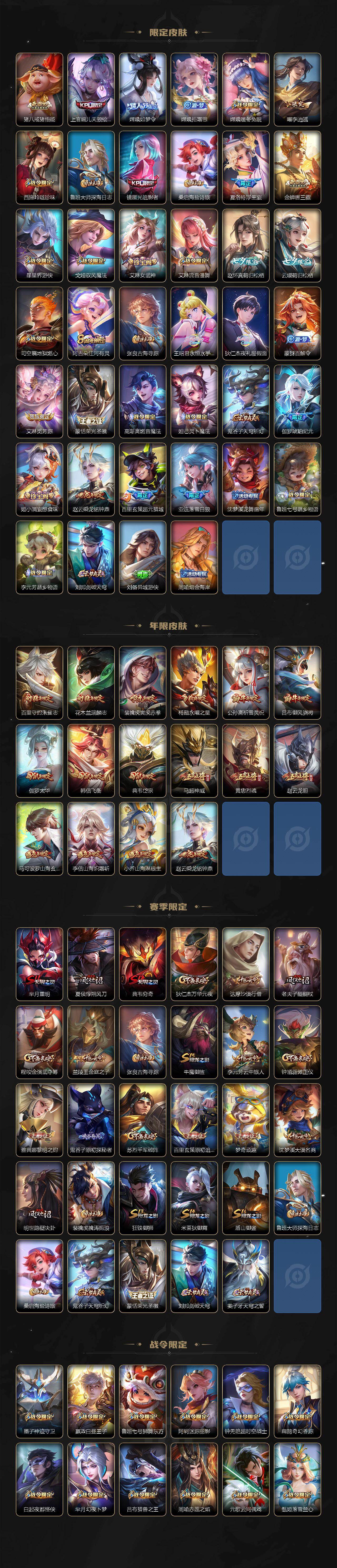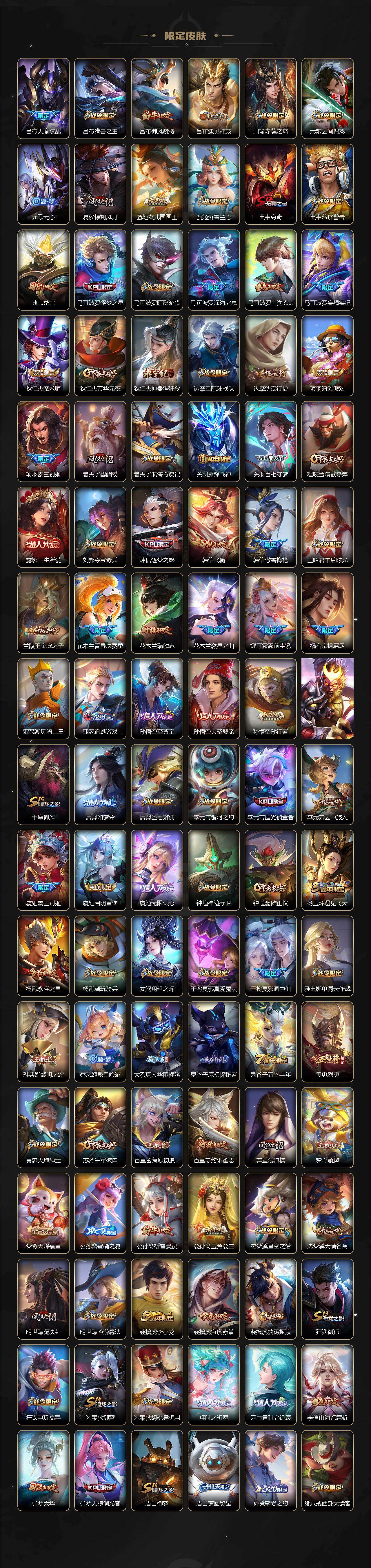 【限定皮肤】:姜子牙天穹之誓,狄仁杰阴阳师,小乔纯白花嫁,小乔山海琳琅生,赵云皇家上将,赵云龙胆,赵云百木心枪,墨子神迹守卫,嬴政白昼王子,孙尚香蔷薇恋人,孙尚香异界灵契,鲁班七号狮舞东方,鲁班七号乒乒小将,鲁班七号时之奇旅,庄周高山流水,高渐离死亡摇滚,阿轲迷踪丽影,钟无艳王者之锤,钟无艳超时空战士,孙膑天狼运算者,扁鹊奇幻香踪,白起夜都怪侠,芈月重明,芈月幻夜卜梦,吕布天魔缭乱,吕布猎兽之王,吕布御风骁将,吕布遇见神鼓,周瑜赤莲之焰,元歌云间偶戏,元歌无心,夏侯惇朔风刀,甄姬女儿国国王,甄姬落雪兰心,典韦穷奇,典韦蓝屏警告,典韦岱宗,马可波罗逐梦之星,马可波罗暗影游猎,马可波罗