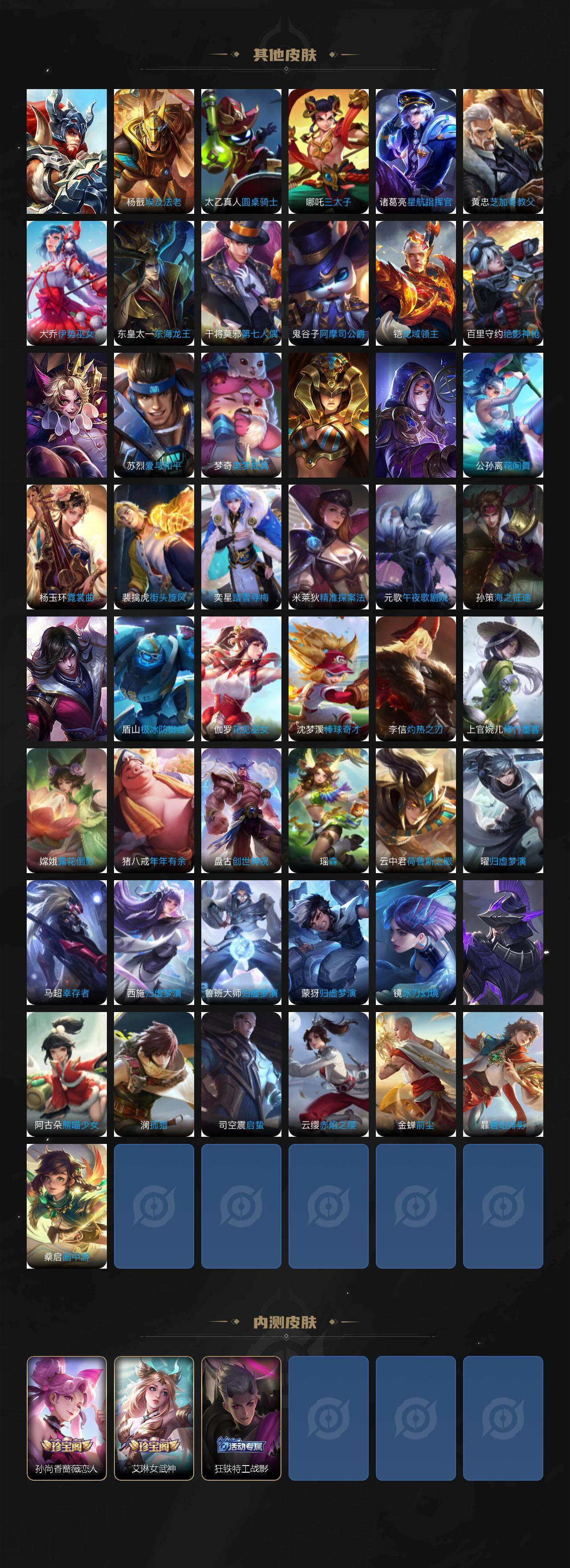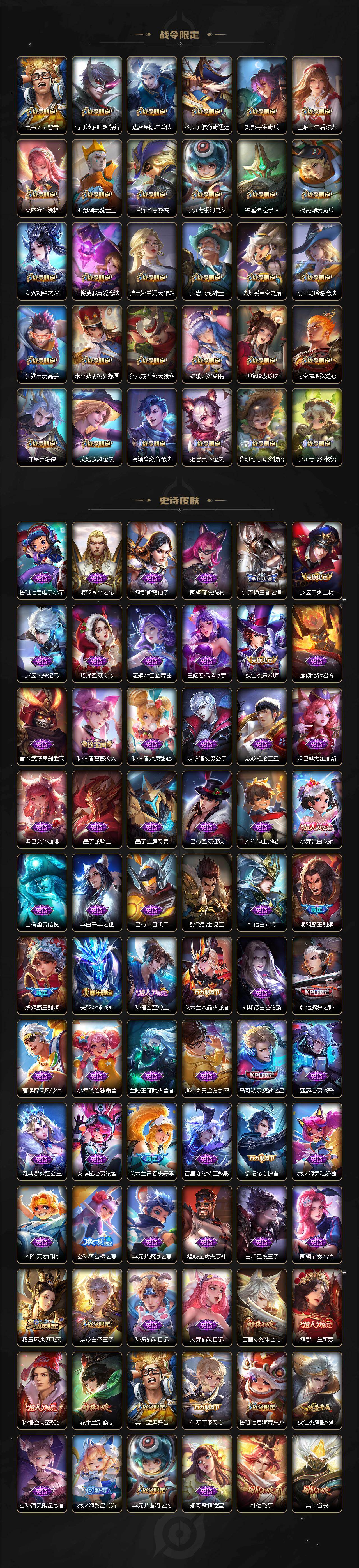 芈月重明,典韦穷奇,狂铁御狮,米莱狄御霄,牛魔御旌,盾山御銮,夏侯惇朔风刀,明世隐疑决卦,老夫子醍醐杖,鬼谷子原初探秘者,狄仁杰万华元夜,程咬金演武夺筹,钟馗驱傩正仪,苏烈千军破阵,吕布猎兽之王,嬴政白昼王子,女娲朔望之晖,典韦蓝屏警告,钟馗神迹守卫,鲁班七号狮舞东方,沈梦溪星空之诺,李元芳银河之约,刘邦夺宝奇兵,马可波罗暗影游猎,元歌云间偶戏,弈星混沌棋,达摩沙漠行僧,兰陵王金庭之子,沈梦溪大漠名商,李元芳云中旅人,桑启海盐诗旅,裴擒虎擒涛扼浪,鲁班大师探海日志,张良古海寻踪
