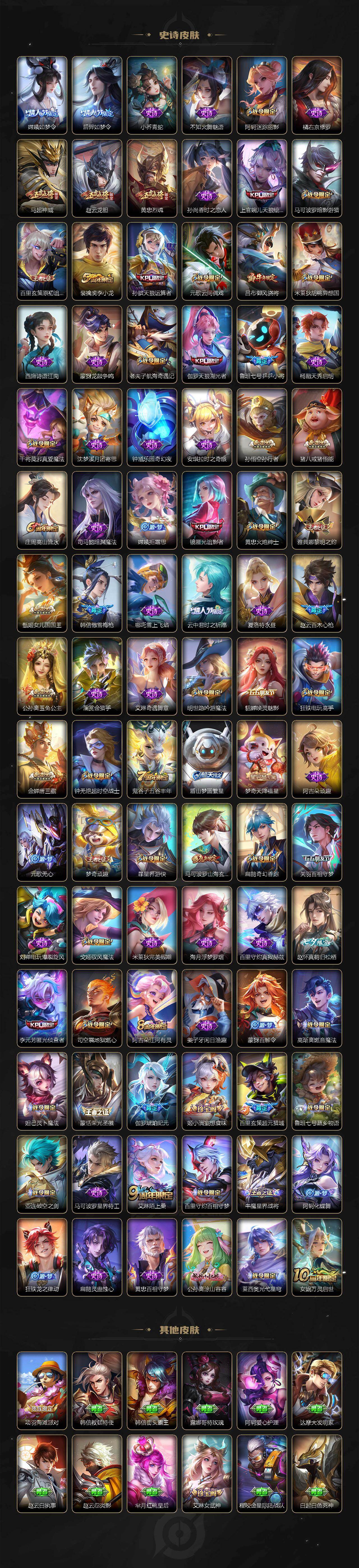 【英雄全皮】:马可波罗全皮,达摩全皮,姜子牙全皮,刘邦全皮,孙权全皮,艾琳全皮,娜可露露全皮,橘右京全皮,李元芳全皮,狂铁全皮,米莱狄全皮,李信全皮,盾山全皮,猪八戒全皮,夏洛特全皮,金蝉全皮,戈娅全皮,影全皮