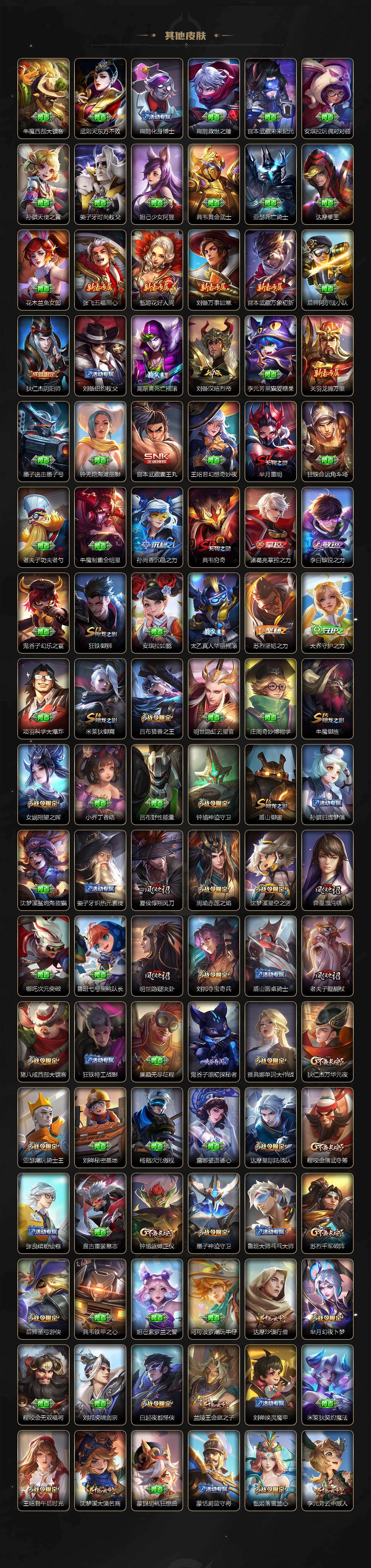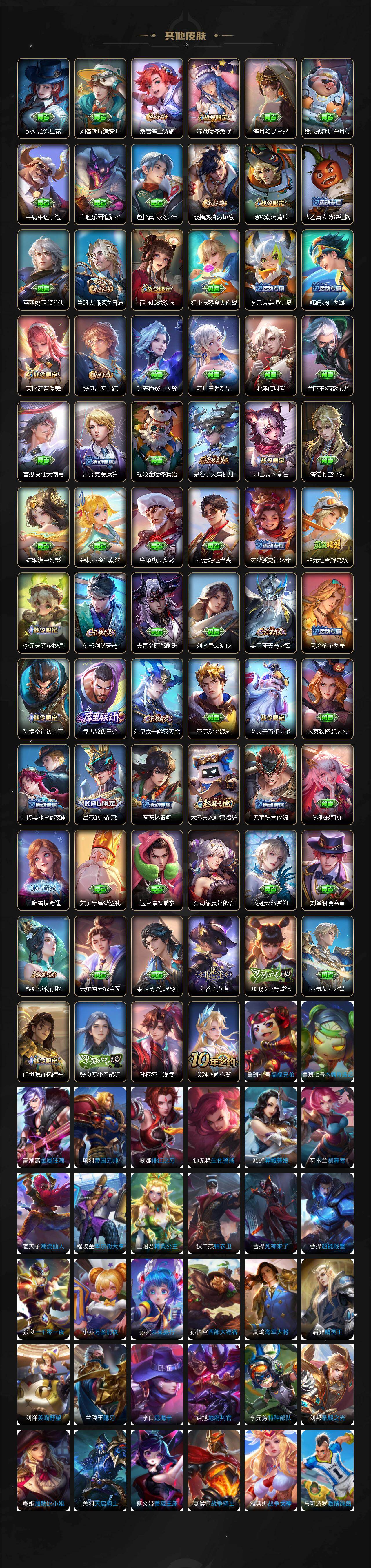 小乔青蛇,娜可露露晚萤,伽罗箭羽风息,李元芳逐浪之夏,不知火舞魅语,公孙离无限星赏官,大乔猫狗日记,孙策猫狗日记,阿轲节奏热浪,露娜紫霞仙子,诸葛亮黄金分割率,王昭君偶像歌手,韩信白龙吟,项羽苍穹之光,孙尚香时之恋人,阿轲暗夜猫娘,雅典娜冰冠公主,吕布末日机甲,鲁班七号电玩小子,蒙犽龙鼓争鸣,橘右京修罗,墨子龙骑士,嬴政摇滚巨星,刘禅绅士熊喵,刘禅天才门将,白起星夜王子,安琪拉心灵骇客,安琪拉时之奇旅,程咬金功夫厨神,刘邦德古拉伯爵,兰陵王暗隐猎兽者,曹操幽灵船长,宫本武藏鬼剑武藏,司马懿暗渊魔法,亚瑟心灵战警,钟馗乐园奇幻夜,杨戬天秀·启明,蔡文姬舞动绿茵,廉颇地狱岩魂,西施诗语江南,小乔缤纷独角兽,夏侯惇乘风破浪,花木兰水晶猎龙者,铠曙光守护者,墨子金属风暴,百里玄策原初追逐者,吕布圣诞狂欢,貂蝉圣诞恋歌,百里守约特工魅影,嬴政暗夜贵公子,嫦娥拒霜思,雅典娜黎明之约,李白千年之狐,哪吒雪上飞焰,夏洛特永昼,澜赏金猎手,艾琳奇遇舞章,貂蝉唤灵魅影,阿古朵顽趣,关羽百相守梦,刘禅电玩·爆裂旋风,海月浮梦罗烟,百里守约真我赫兹,赵怀真鹤归松栖,李元芳匿光侦查者,姜子牙闲日渔趣,蒙犽百解令,高渐离燃音魔法,伽罗琥珀纪元