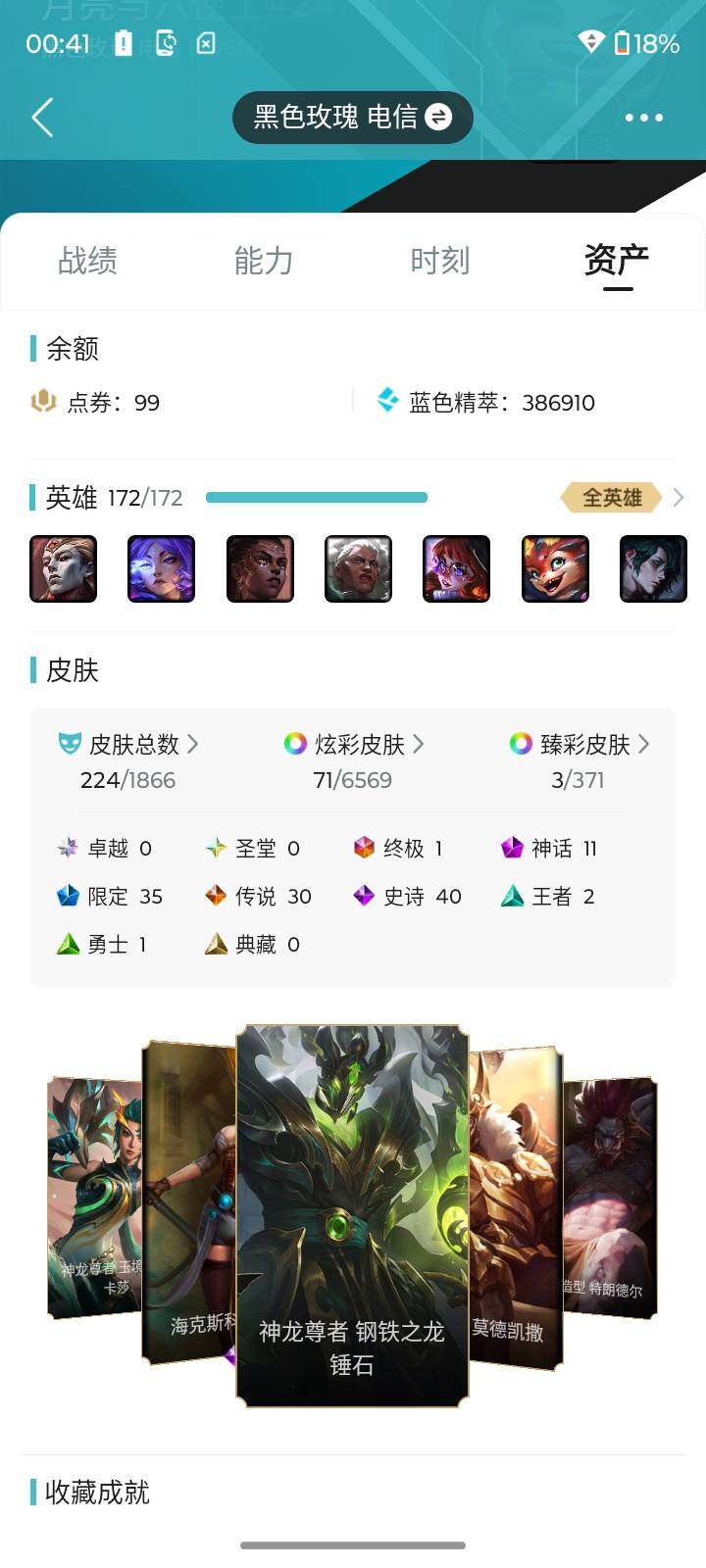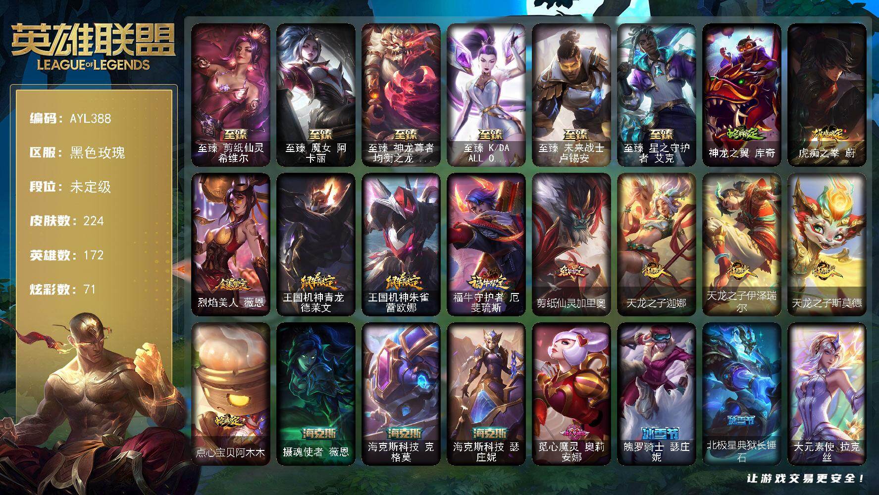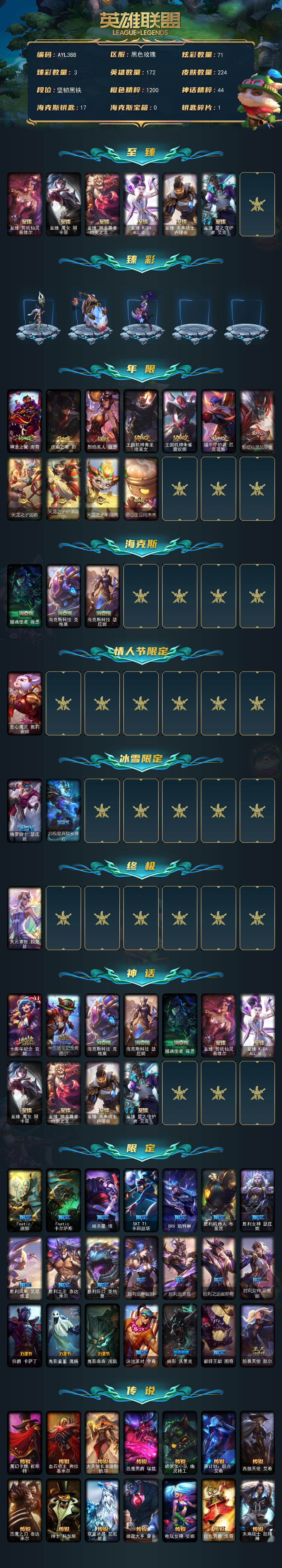 [15591246]【店主推荐捡漏号】未定级段位-172英雄-224皮肤-71炫彩-1终极-11神话-35限定-30传说-40史诗