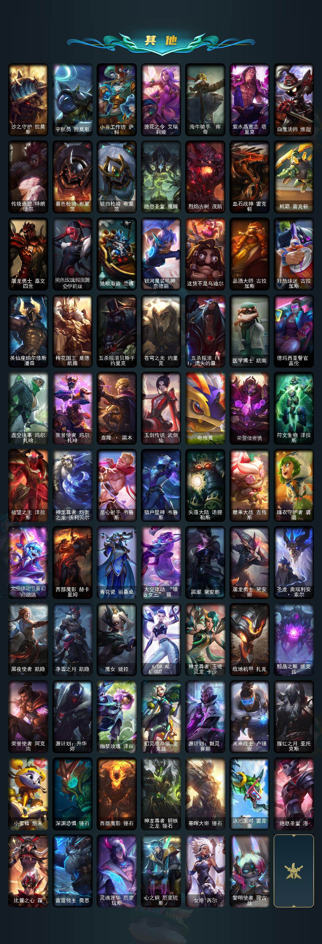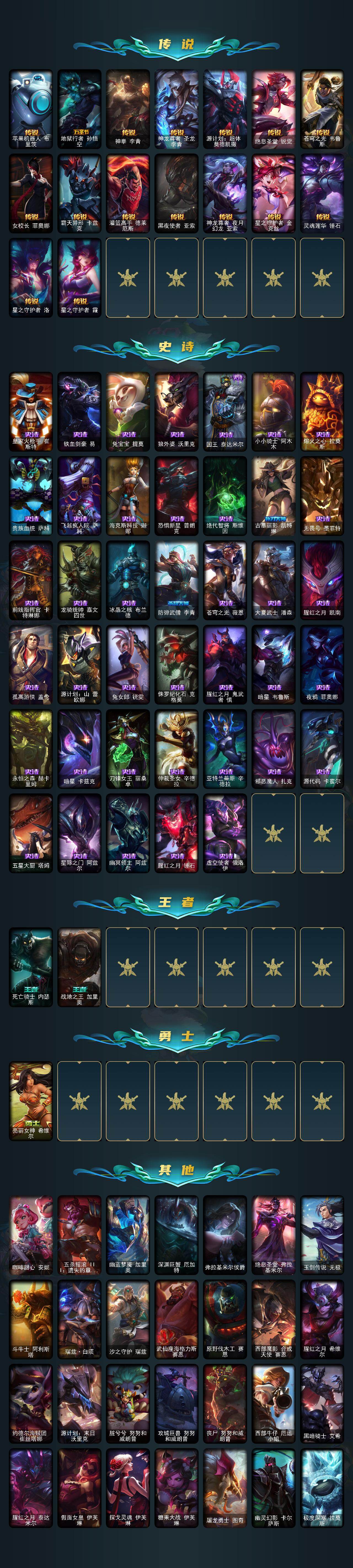 【传说皮肤】:魔幻卡牌崔斯特,血石领主弗拉基米尔,大天使长米迦勒凯尔,恶魔男爵瑞兹,欧米伽小队幽灵特工,源计划联合艾希,西部天使艾希,恶魔之刃泰达米尔,绅士科加斯,双重冰晶艾尼维亚,律政大亨蒙多,电玩女神娑娜,红色男爵库奇,未来战士凯特琳,苹果机器人布里茨,地狱行者孙悟空,神拳李青,神龙尊者圣龙李青,源计划超体莫德凯撒,绝息圣堂锐雯,苍穹之光韦鲁斯,女校长菲奥娜,霸天异形卡兹克,灌篮高手德莱厄斯,黑夜使者亚索,神龙尊者夜月幻龙亚索,星之守护者金克丝,灵魂莲华锤石,星之守护者洛,星之守护者霞