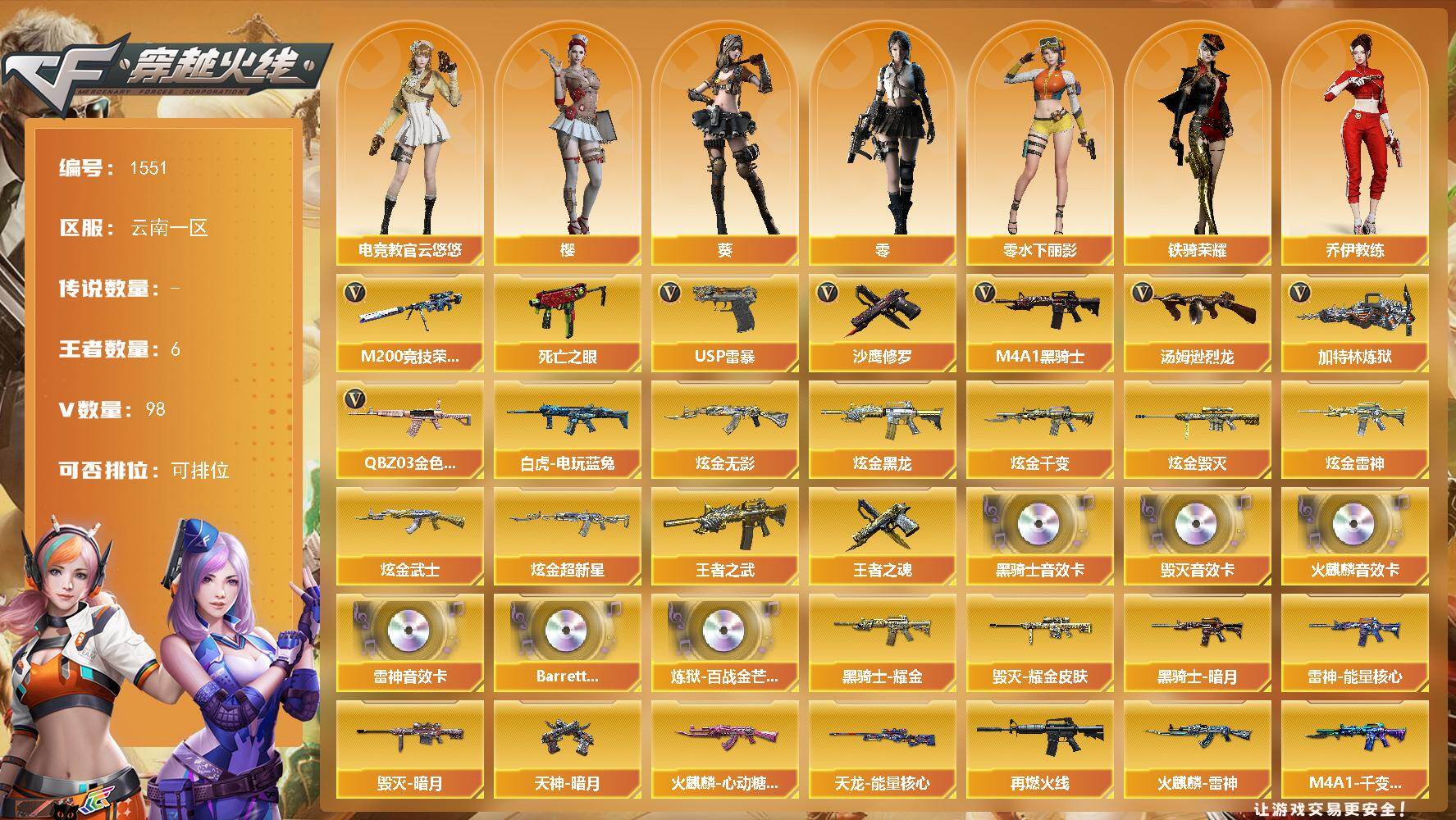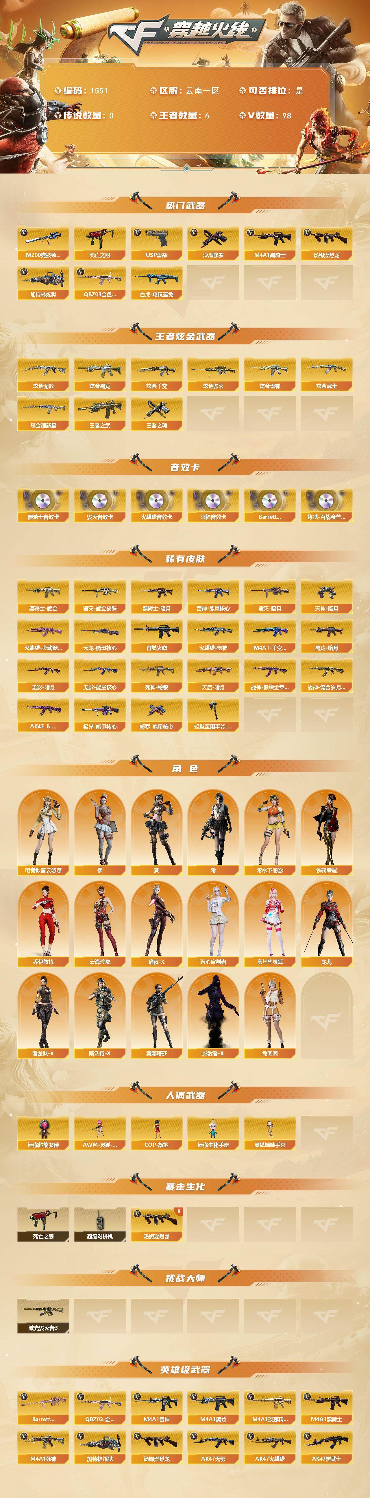 [15593304]云南一区-98V-6王者-7炫金 【热门武器】:QBZ03-金色蔷薇*4,M200-竞技荣光,死亡之眼*3,白虎-电玩蓝兔,M4A1-黑骑士,汤姆逊-烈龙*6,加特林-炼狱*2,USP-雷暴,沙鹰-修罗*7 【王者炫金武器】:王者之武,王者之魂,炫金无影,炫金黑龙,炫金千变,炫金雷神,炫金武士,炫金超新星,炫金毁灭 【音效卡】:AK47-火麒麟音效卡,M4A1-雷神音效卡,M4A1-黑骑士音效卡,Barrett-毁灭音效卡,Barrett-碧霄极光音效卡,炼狱-百战金芒-庆典舞曲音效卡 【皮肤】:雷神-能量核心,M4A1-再燃火线,火麒麟-雷神,火麒麟-心动糖果,毁灭-暗月*4,毁灭耀金皮肤,M4A1-千变-孔明皮肤,黑龙-暗月,黑骑士-暗月,黑骑士耀金皮肤,无影-暗月*2,无影-能量核心,死神-秘银*4,天启-暗月*5,战神-紫绶金章皮肤*2,战神-流金岁月皮肤,AK47-B-常胜将军-曹操*2,天龙-能量核心,极光-能量核心,修罗-能量核心*4,天神-暗月*4,轻型军用手斧-再燃火线 【角色】:零,葵,樱,电竞教官-云悠悠,乔伊教练,云海玲珑,暗夜-X,芳心审判者,嘉年华灵狐,零-水下丽影,龙儿,潜龙队-X,斯沃特-X,铁骑荣耀,兔囡囡,新娜塔莎,影武者-X 【人偶武器】:AWM-灵狐-15周年嘉年华,COP-旗袍,迷你生化手雷,迷你超能女侍,灵狐娃娃手雷 【暴走生化】:死亡之眼*3,超级对讲机 【挑战大师】:激光毁灭者III 【英雄级武器】:M4A1-千变,AK47-火麒麟*2,M4A1-黑龙,M4A1-雷神*4,M4A1-黑骑士,AK47-无影,M4A1-死神,AK47-黑武士*2,AN94-超新星,M4A1-武圣,AK47-黑鲨,M4A1-龙血,无影-神兵利器,M4A1-玫瑰精灵*2,QBZ03-金色蔷薇*4,王者之心-觉醒版,王者之翼-觉醒版,黑骑士-海王*2,王者之烈-觉醒版,白虎-电玩蓝兔,AWM-天龙*2,Barrett-毁灭,Barrett-极光,AWM-裁决,M200-竞技荣光,Barrett-金色蔷薇*3,王者之怒-觉醒版,加特林-炼狱*2,炼狱-百战金芒,汤姆逊-烈龙*6,沙鹰-修罗*7,沙鹰-天神,USP-雷暴,柯尔特-竞技荣光,Glock18-武圣,屠龙*4,龙啸,擎天*2,麒麟刺*2,擎天-竞技荣光,麒麟刺-百战金芒,高爆手雷-竞技