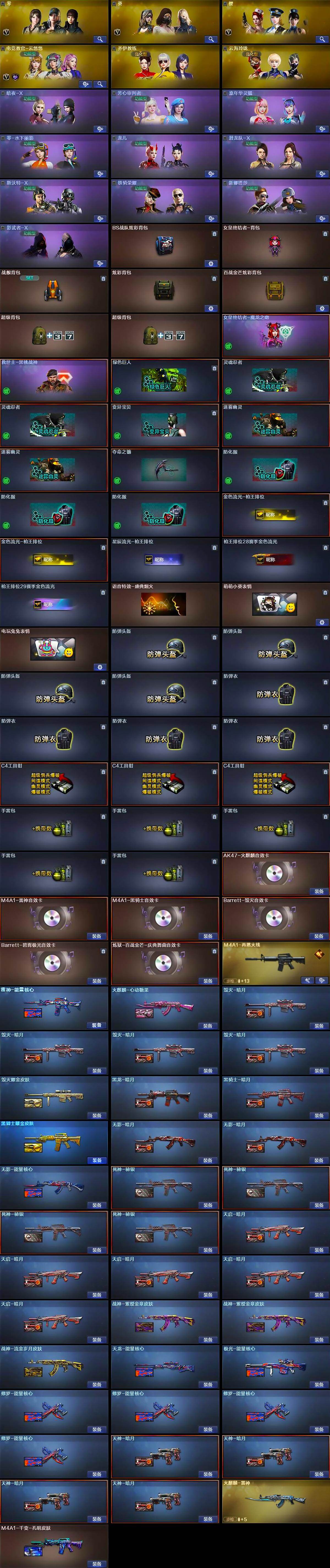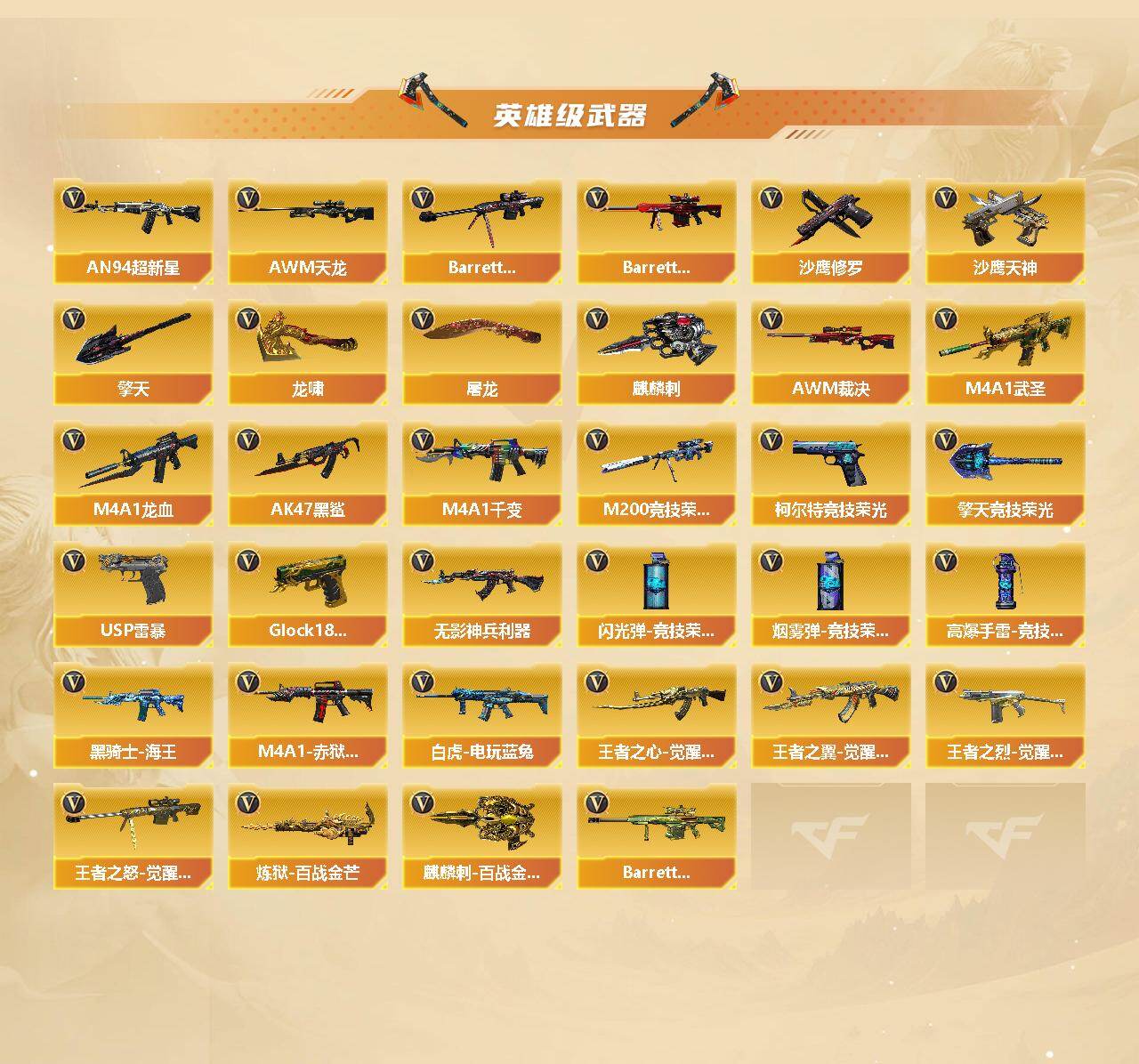 【英雄级武器】:M4A1-千变,AK47-火麒麟*2,M4A1-黑龙,M4A1-雷神*4,M4A1-黑骑士,AK47-无影,M4A1-死神,AK47-黑武士*2,AN94-超新星,M4A1-武圣,AK47-黑鲨,M4A1-龙血,无影-神兵利器,M4A1-玫瑰精灵*2,QBZ03-金色蔷薇*4,王者之心-觉醒版,王者之翼-觉醒版,黑骑士-海王*2,王者之烈-觉醒版,白虎-电玩蓝兔,AWM-天龙*2,Barrett-毁灭,Barrett-极光,AWM-裁决,M200-竞技荣光,Barrett-金色蔷薇*3,王者之怒-觉醒版,加特林-炼狱*2,炼狱-百战金芒,汤姆逊-烈龙*6,沙鹰-修罗*7,沙鹰-天神,USP-雷暴,柯尔特-竞技荣光,Glock18-武圣,屠龙*4,龙啸,擎天*2,麒麟刺*2,擎天-竞技荣光,麒麟刺-百战金芒,高爆手雷-竞技