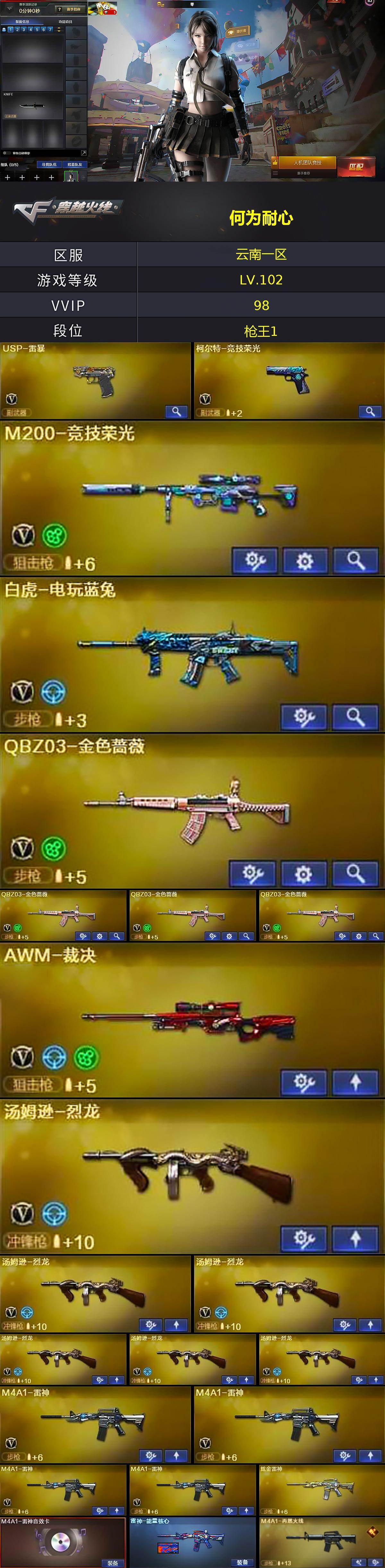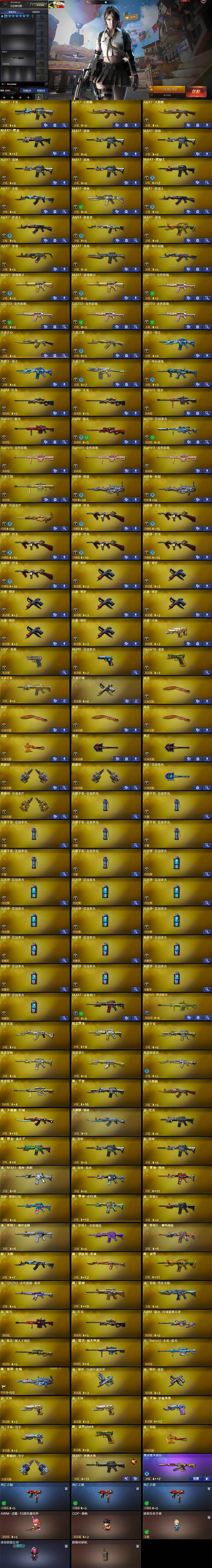 【热门武器】:QBZ03-金色蔷薇*4,M200-竞技荣光,死亡之眼*3,白虎-电玩蓝兔,M4A1-黑骑士,汤姆逊-烈龙*6,加特林-炼狱*2,USP-雷暴,沙鹰-修罗*7