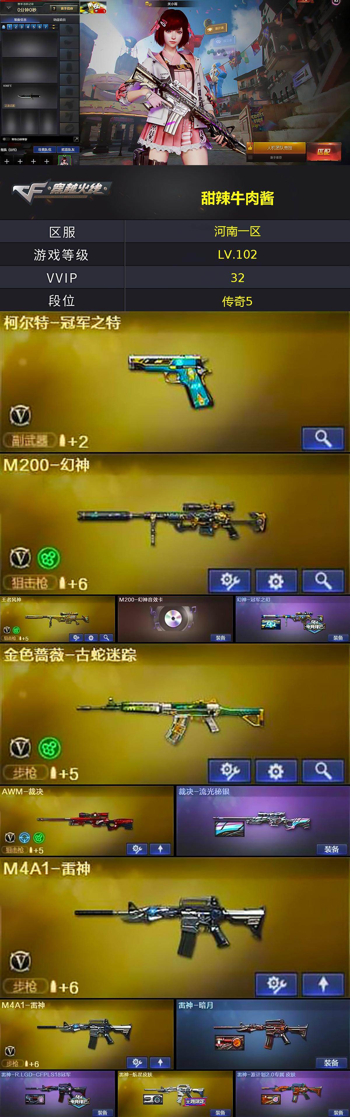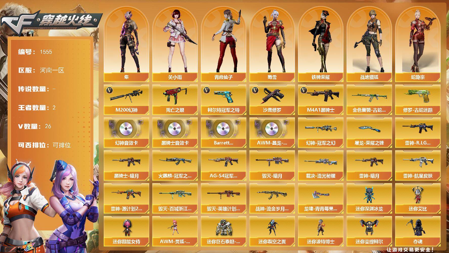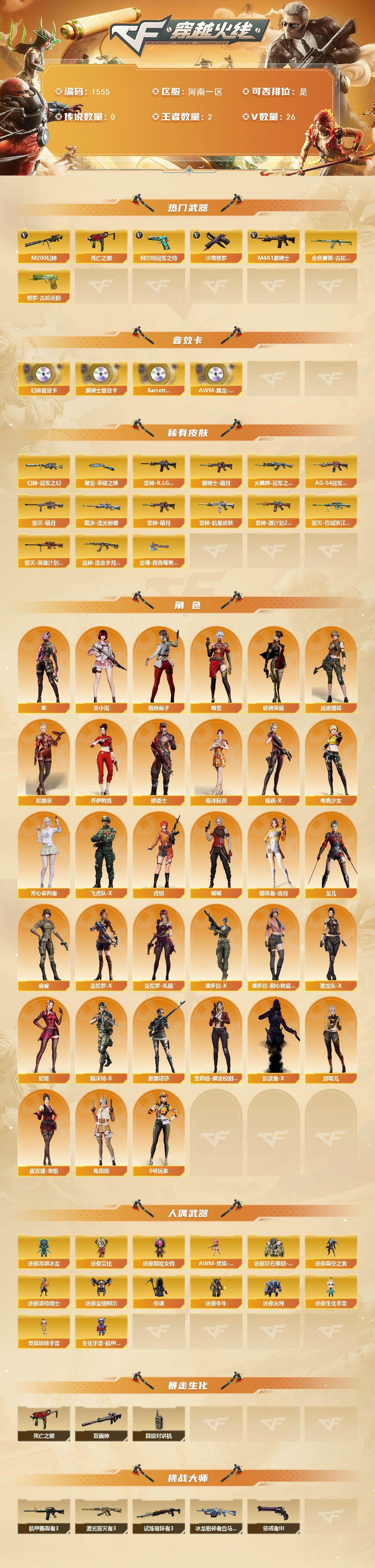 [15593682]河南一区-26V-2王者-0炫金 【热门武器】:M200-幻神,金色蔷薇-古蛇迷踪,修罗-古蛇迷踪,死亡之眼*2,柯尔特-冠军之特,M4A1-黑骑士,沙鹰-修罗 【音效卡】:M200-幻神音效卡,M4A1-黑骑士音效卡,Barrett-碧霄极光音效卡,AWM-昌龙-怀旧音效卡 【皮肤】:幻神-冠军之幻,裁决-流光秘银,雷神-暗月,雷神-R.LGD-CFPLS18冠军,雷神-航星皮肤,雷神-源计划2.0专属 皮肤,火麒麟-冠军之心,毁灭-暗月,毁灭-百城浙江 皮肤,毁灭-英雄计划 皮肤,黑骑士-暗月,黑骑士-AG-S4冠军典藏,战神-流金岁月皮肤,屠龙-荣耀之锋,龙啸-青青莓果 皮肤 【角色】:关小雨,隼,战地猎狐,蛇隐宗,奇洋探员,乔伊教练,修道士,暗夜-X,电竞少女,芳心审判者,飞虎队-X,虎妞,娟娟,猎狐者-追月,0号玩家,龙儿,麻雀,曼陀罗-X,曼陀罗-礼服,潘多拉-X,潘多拉-甜心教官,潜龙队-X,青霞仙子,蛇姬,斯沃特-X,蜀雪,铁骑荣耀,兔囡囡,新娜塔莎,雪莉杨-摸金校尉,夜玫瑰-宠粉,影武者-X,游珑儿 【人偶武器】:AWM-灵狐-15周年嘉年华*3,迷你深渊冰龙,迷你裂空之翼,迷你波特博士*3,迷你曼提柯尔,夺魂,迷你牛牛,迷你火种*2,迷你生化手雷,生化手雷-机甲核心,迷你艾比,迷你超能女侍,迷你巨石泰坦-魔花研究所,灵狐娃娃手雷 【暴走生化】:双面神,死亡之眼*2,超级对讲机 【挑战大师】:冰龙粉碎者-白马银枪,激光毁灭者III,机甲撕裂者III,试炼破坏者III*2,惩戒者III 【英雄级武器】:AK47-火麒麟,M4A1-雷神*2,M4A1-黑骑士,AN94-超新星,无影-神兵利器,黑武士-锦绣游龙,超新星-热带奇洋,金色蔷薇-古蛇迷踪,AK47-B-战神,黑骑士-海王*2,Barrett-毁灭,AWM-裁决,M200-幻神,王者风神-觉醒版,AA-12-雷霆,沙鹰-修罗,柯尔特-冠军之特,修罗-古蛇迷踪,屠龙,龙啸,麒麟刺,龙啸-热带奇洋,王者之锋-觉醒版,手雷-热带奇洋,高爆手雷-古蛇迷踪,烟雾弹-古蛇迷踪,M4A1-赤狱骑士,AWM-昌龙,Barrett-碧霄极光 【道具】:BS战队炫彩背包,CFS限定背包,云山科技背包,亚洲杯纪念炫彩背包,全能枪王背包,冰冰企鹅背包,古蛇迷踪炫彩背包,奇洋探员-海龟背包,女皇终结者-背包,沙漠龙背包