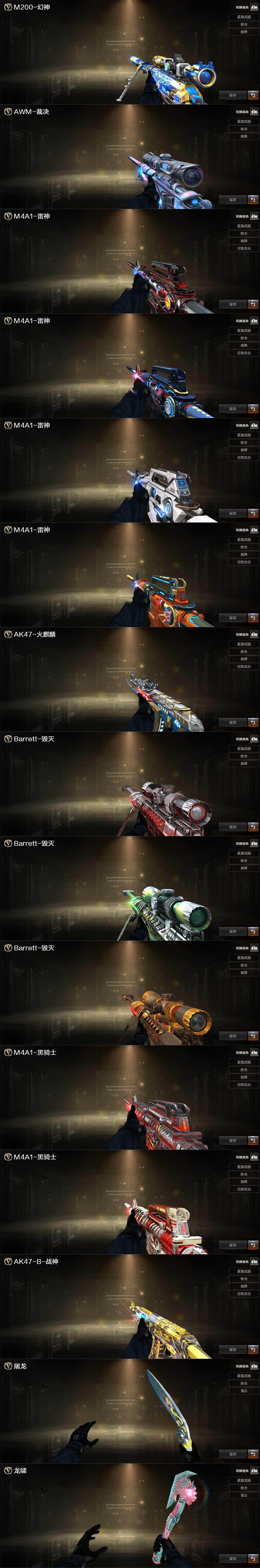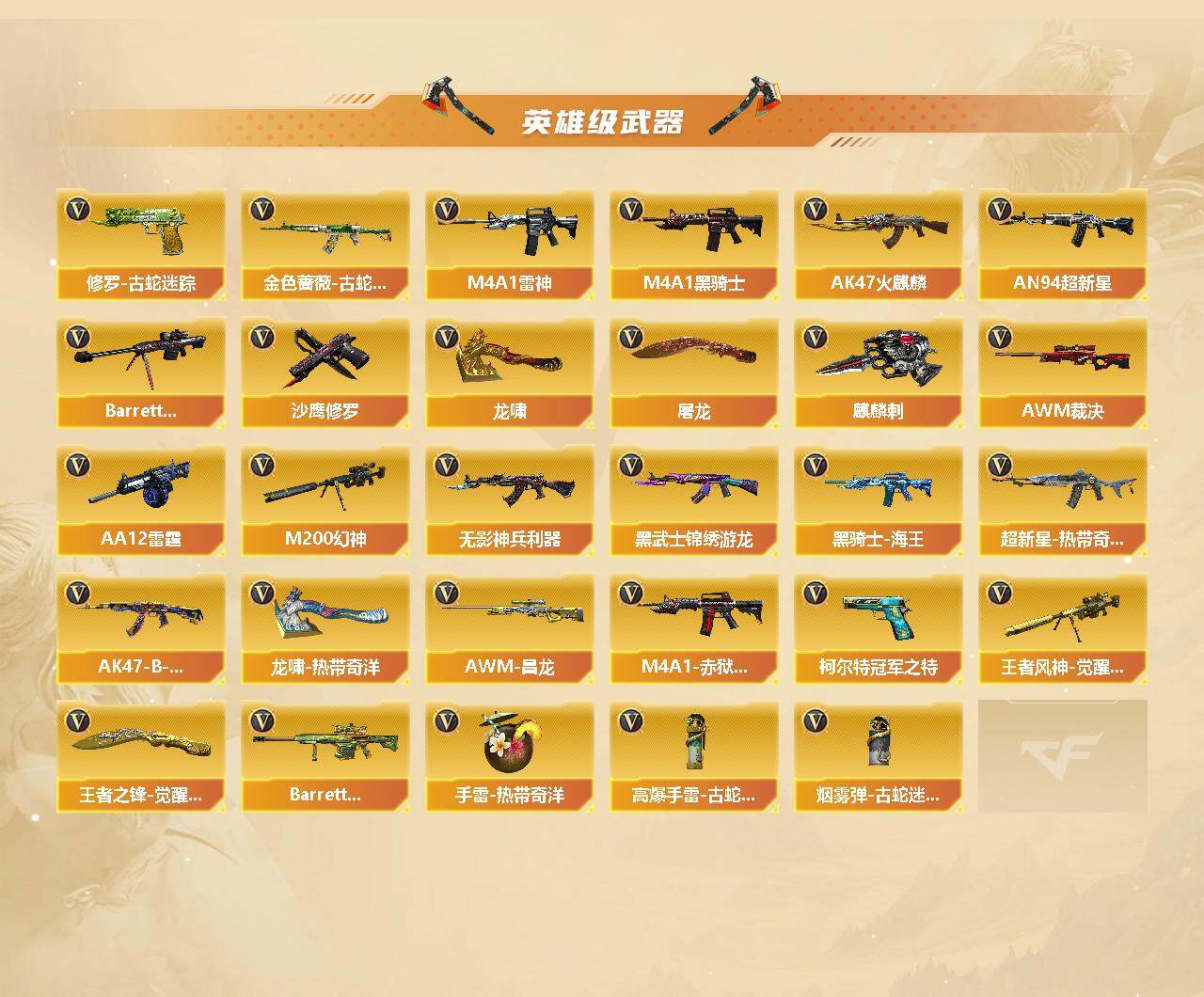 【英雄级武器】:AK47-火麒麟,M4A1-雷神*2,M4A1-黑骑士,AN94-超新星,无影-神兵利器,黑武士-锦绣游龙,超新星-热带奇洋,金色蔷薇-古蛇迷踪,AK47-B-战神,黑骑士-海王*2,Barrett-毁灭,AWM-裁决,M200-幻神,王者风神-觉醒版,AA-12-雷霆,沙鹰-修罗,柯尔特-冠军之特,修罗-古蛇迷踪,屠龙,龙啸,麒麟刺,龙啸-热带奇洋,王者之锋-觉醒版,手雷-热带奇洋,高爆手雷-古蛇迷踪,烟雾弹-古蛇迷踪,M4A1-赤狱骑士,AWM-昌龙,Barrett-碧霄极光