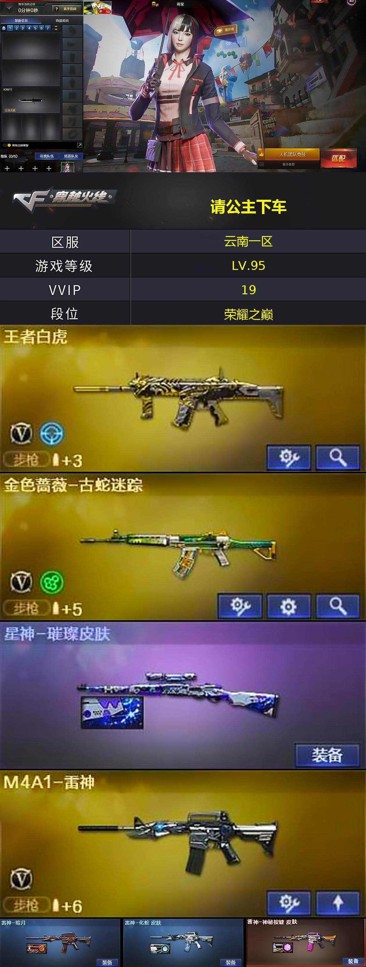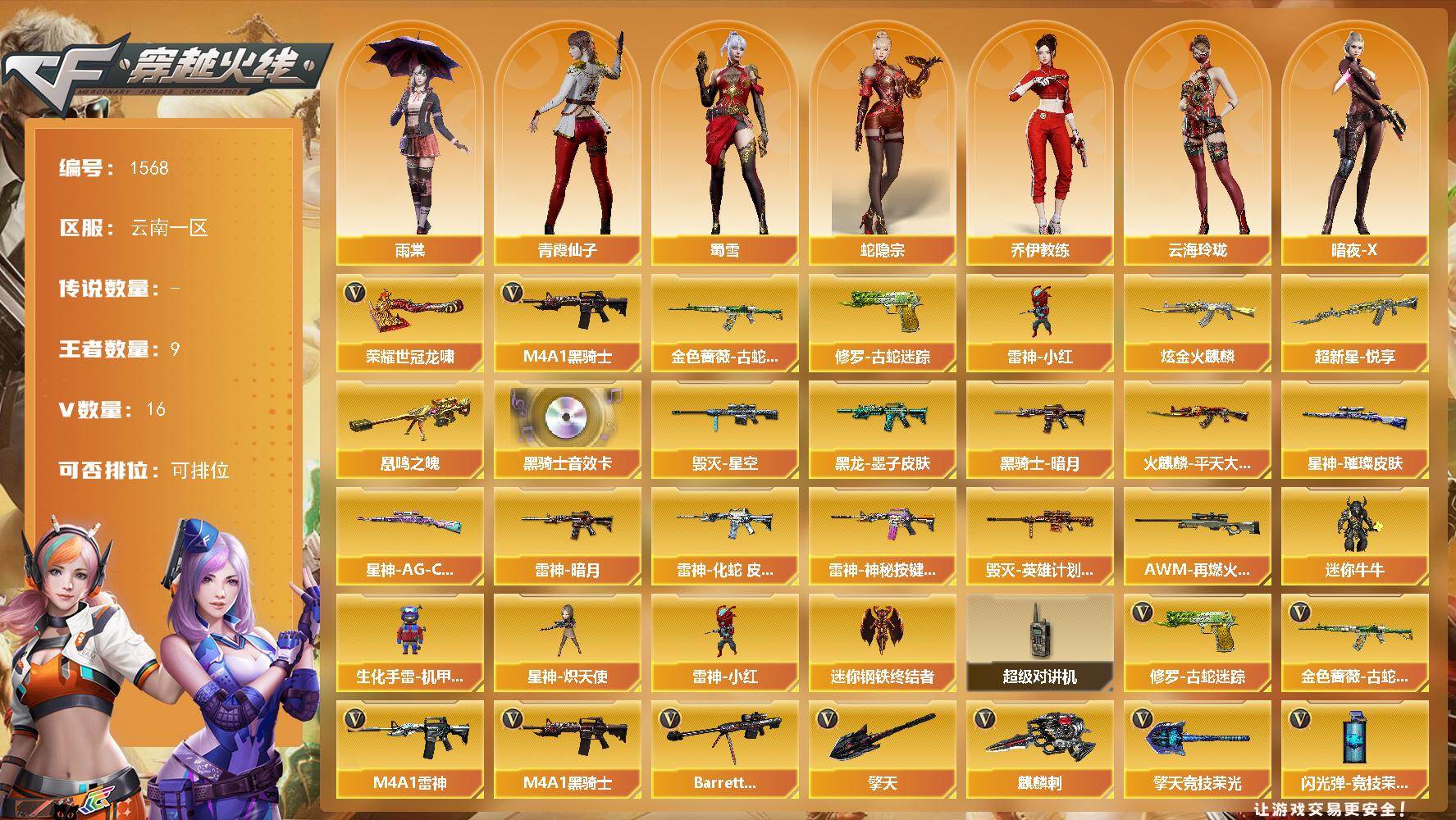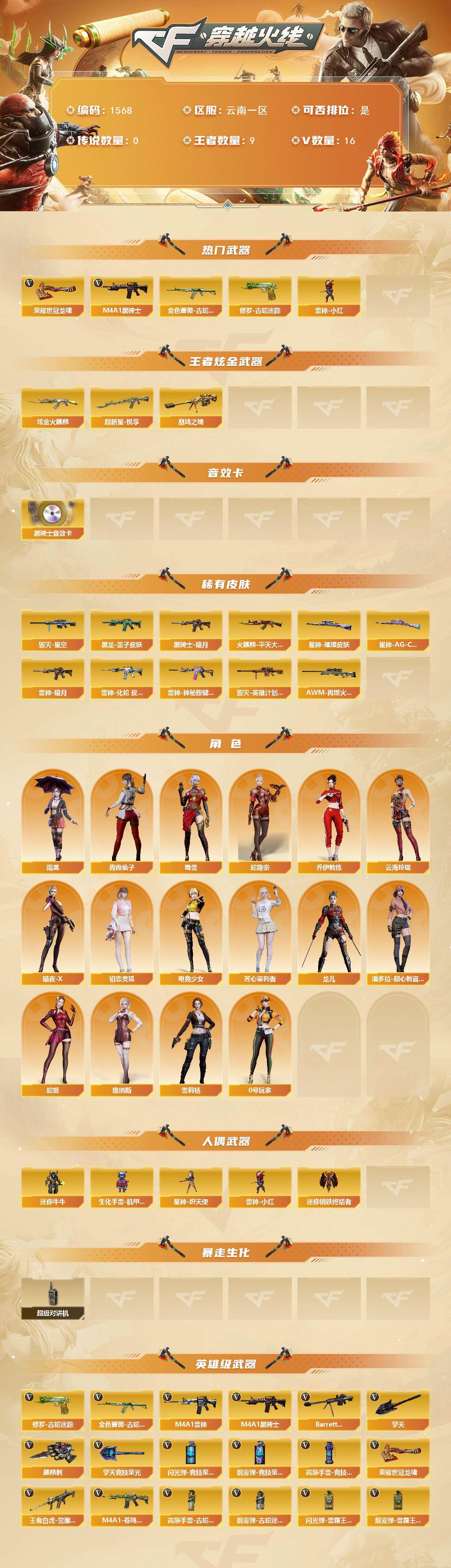 [15594214]云南一区-16V-9王者-1炫金 【热门武器】:金色蔷薇-古蛇迷踪,修罗-古蛇迷踪,M4A1-黑骑士,雷神-小红,荣耀世冠-龙啸 【王者炫金武器】:超新星-悦享,凰鸣之魄,炫金火麒麟 【音效卡】:M4A1-黑骑士音效卡 【皮肤】:星神-璀璨皮肤,Kar98K-星神-AG-CFPLS21冠军皮肤,雷神-暗月,雷神-化蛇 皮肤,雷神-神秘按键 皮肤,火麒麟-平天大圣,毁灭-星空,毁灭-英雄计划 皮肤,黑龙-墨子皮肤,黑骑士-暗月,AWM-再燃火线 【角色】:雨棠,蛇隐宗,乔伊教练,云海玲珑,暗夜-X,初恋灵狐,电竞少女,芳心审判者,0号玩家,龙儿,潘多拉-甜心教官,青霞仙子,蛇姬,蜀雪,维纳斯,雪莉杨 【人偶武器】:雷神-小红,星神-炽天使,迷你钢铁终结者,迷你牛牛,生化手雷-机甲核心 【暴走生化】:超级对讲机 【英雄级武器】:M4A1-雷神,M4A1-黑骑士,金色蔷薇-古蛇迷踪,王者白虎-觉醒版,Barrett-毁灭,修罗-古蛇迷踪,擎天,麒麟刺,擎天-竞技荣光,荣耀世冠-龙啸,高爆手雷-竞技荣光*2,高爆手雷-古蛇迷踪,闪光弹-竞技荣光,闪光弹-雷霆王者-觉醒版*2,烟雾弹-竞技荣光,烟雾弹-古蛇迷踪,烟雾弹-雷霆王者-觉醒版*2,M4A1-苍鸣雷神 【道具】:CFPL炫彩背包,CFS限定背包,古蛇迷踪炫彩背包,超级背包,迷你冰龙背包,女皇终结者-魔龙之吻,救世主-黑桃战神,绿色巨人,灵魂忍者,迷雾幽灵,生化弹匣,夺命之镰,防化服*2,星辰流光-枪王排位,巅峰赛先锋-金色流光,流光-再燃火线,枪王排位28赛季金色流光,枪王排位29赛季金色流光,古蛇迷踪打击特效,蛇隐宗表情,电玩兔兔表情,EP战队名片,EP战队喷图,EP战队击杀图标,防弹头盔*3,防弹衣*3,C4工具钳*3,手雷包*3 【特殊枪械】:1黑骑士