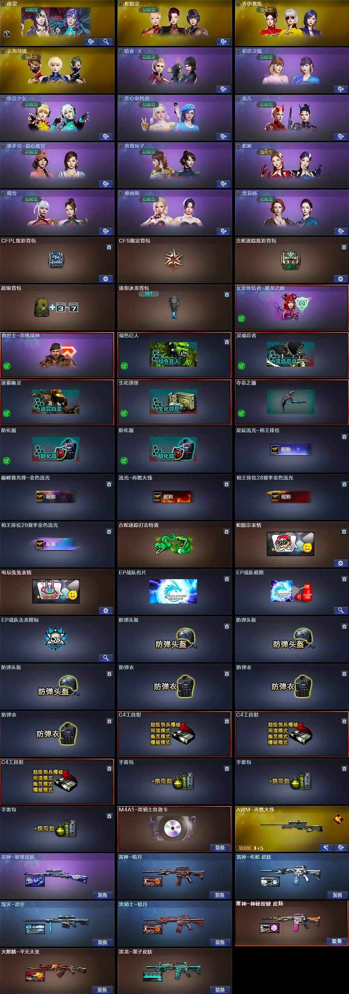 【道具】:CFPL炫彩背包,CFS限定背包,古蛇迷踪炫彩背包,超级背包,迷你冰龙背包,女皇终结者-魔龙之吻,救世主-黑桃战神,绿色巨人,灵魂忍者,迷雾幽灵,生化弹匣,夺命之镰,防化服*2,星辰流光-枪王排位,巅峰赛先锋-金色流光,流光-再燃火线,枪王排位28赛季金色流光,枪王排位29赛季金色流光,古蛇迷踪打击特效,蛇隐宗表情,电玩兔兔表情,EP战队名片,EP战队喷图,EP战队击杀图标,防弹头盔*3,防弹衣*3,C4工具钳*3,手雷包*3