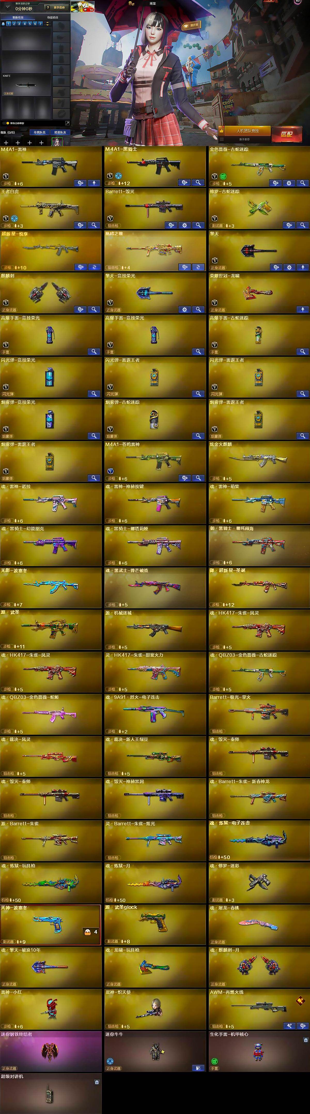 【英雄级武器】:M4A1-雷神,M4A1-黑骑士,金色蔷薇-古蛇迷踪,王者白虎-觉醒版,Barrett-毁灭,修罗-古蛇迷踪,擎天,麒麟刺,擎天-竞技荣光,荣耀世冠-龙啸,高爆手雷-竞技荣光*2,高爆手雷-古蛇迷踪,闪光弹-竞技荣光,闪光弹-雷霆王者-觉醒版*2,烟雾弹-竞技荣光,烟雾弹-古蛇迷踪,烟雾弹-雷霆王者-觉醒版*2,M4A1-苍鸣雷神